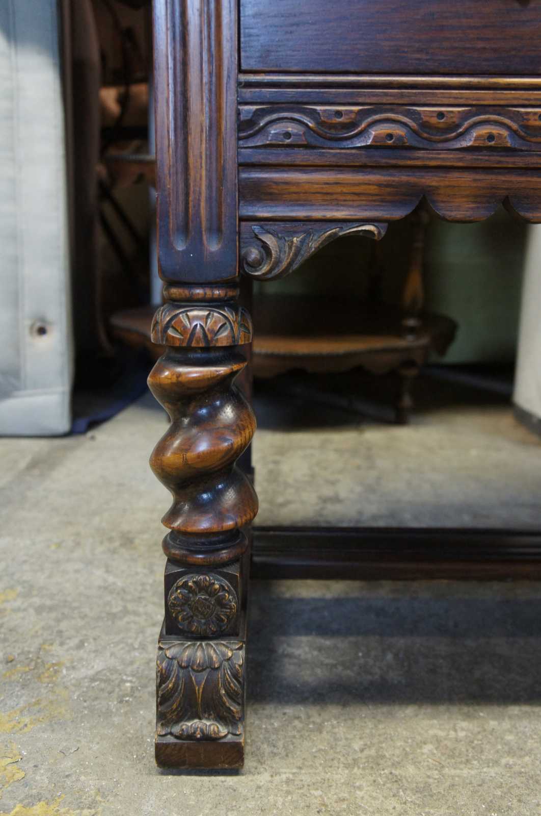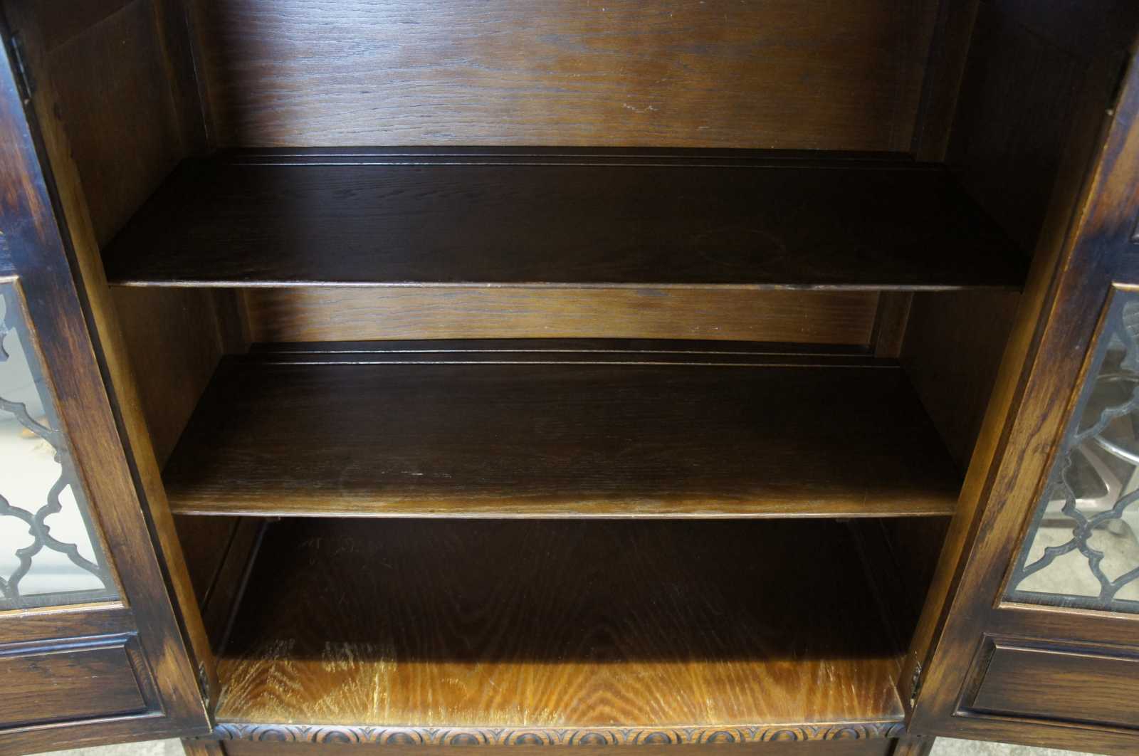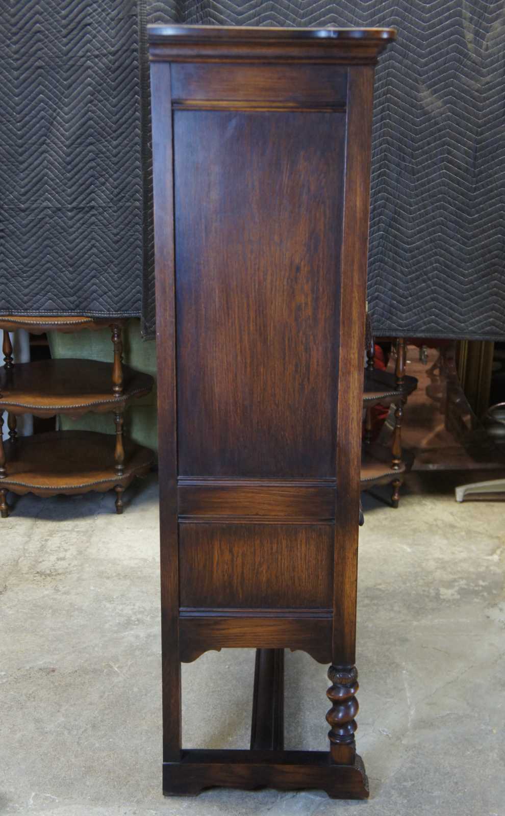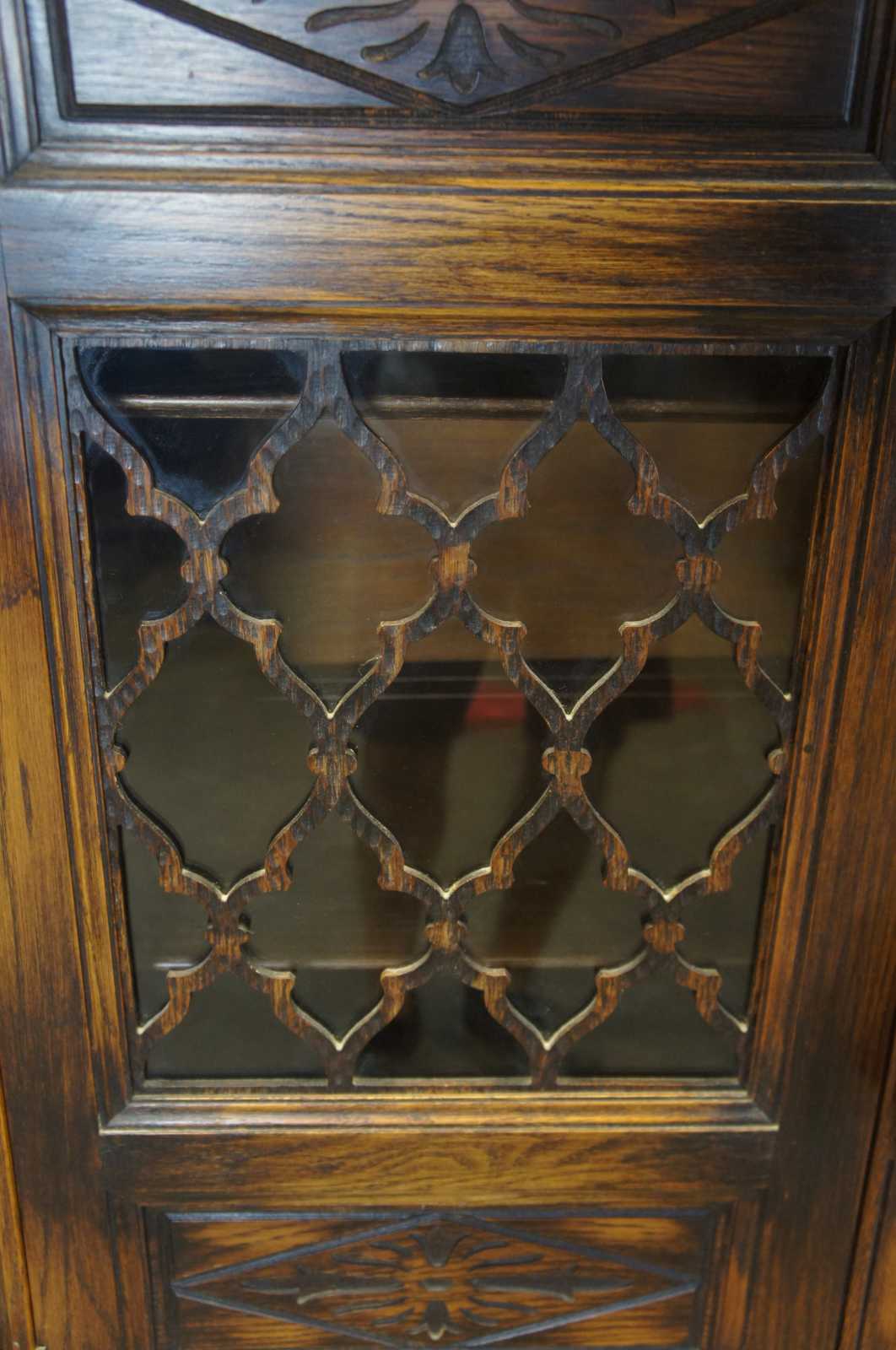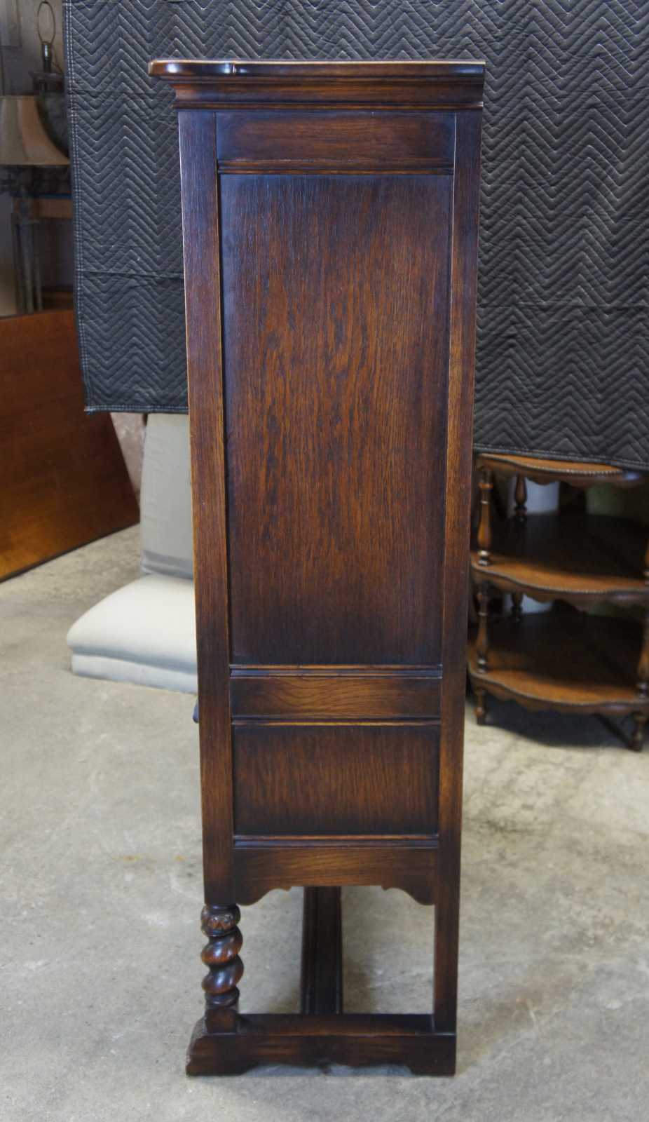 Early 20th century Jacobean or Spanish Revival china cabinet. Made from oak with two diamond paneled doors featuring lattice fretwork over glass doors. Doors open to three shelves with plate grooves. The cabinet features one large lower drawer for storage over four legs with barley twisted design and trestle base.