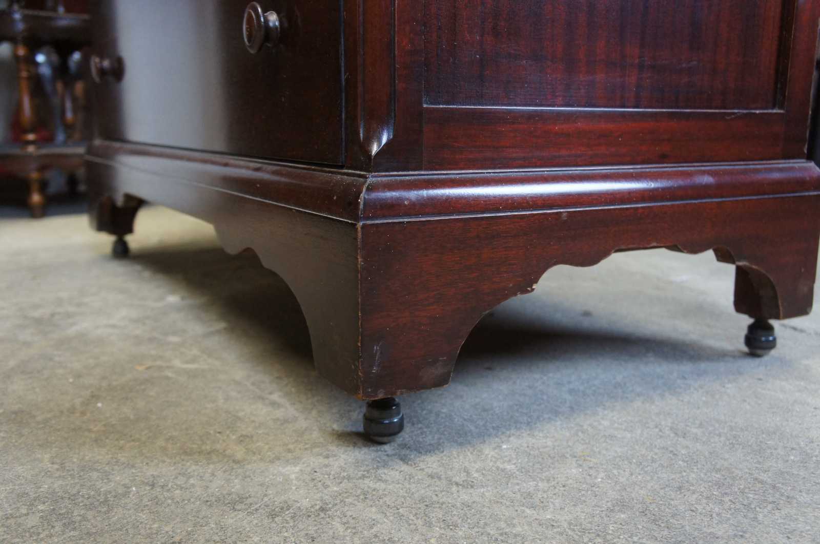 Circa 1940s tallboy dresser. Made from mahogany in Early American styling with six drawers in addition to two upper glove box drawers. Features castors for ease of movement.