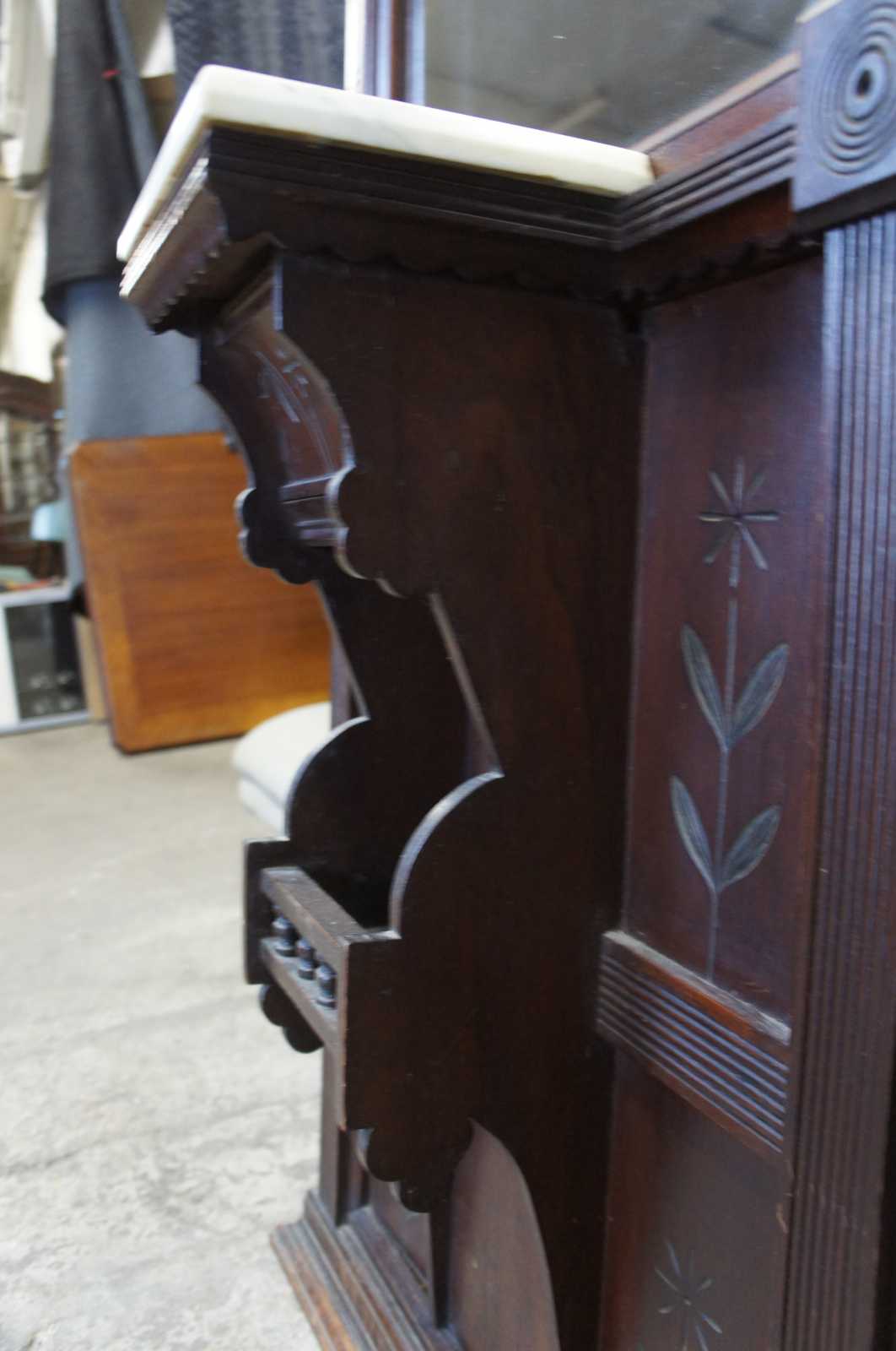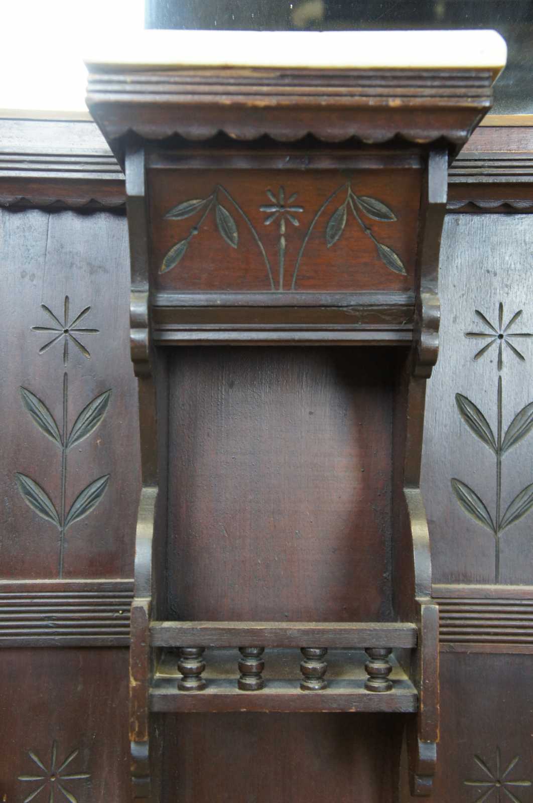 Circa 1880s Eastlake hall mirror. Made from walnut with carved flowers, beaded accents, torchiere engravings and marble wall shelf. A cross and ornate carvings adorn the top.