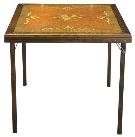 1938 oak and walnut card or game table. Features a Florentine inspired top supported by four folding legs.