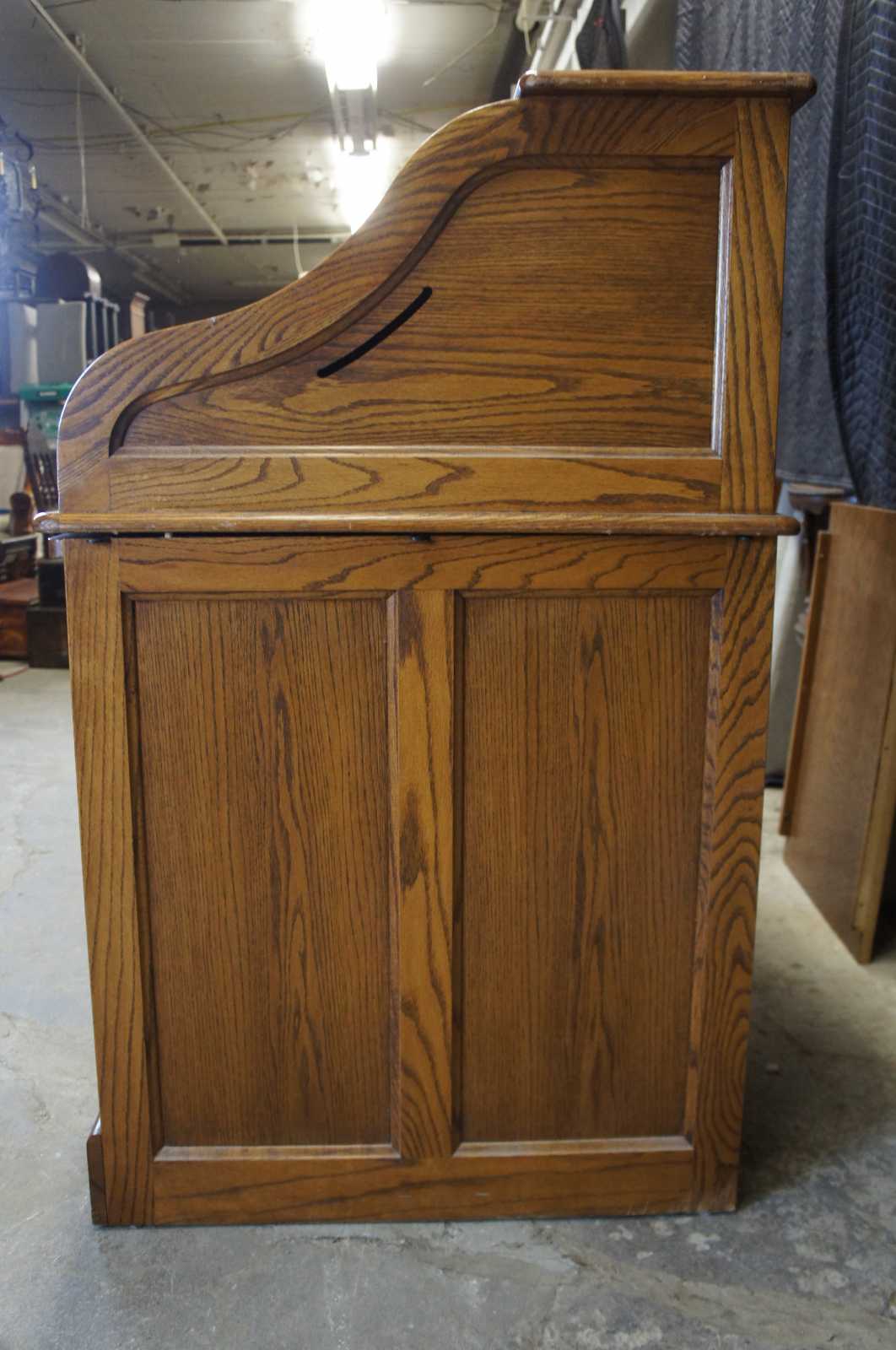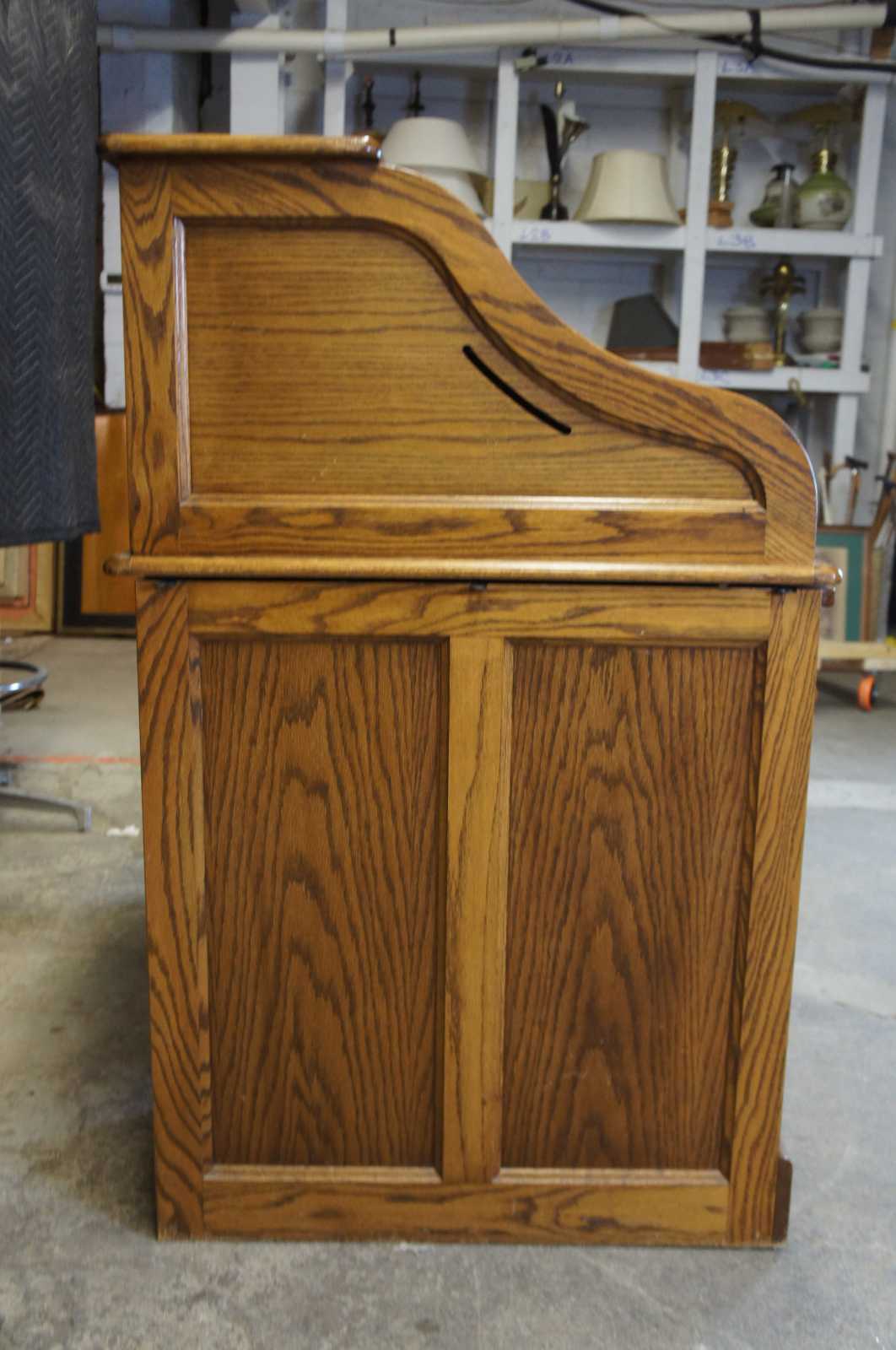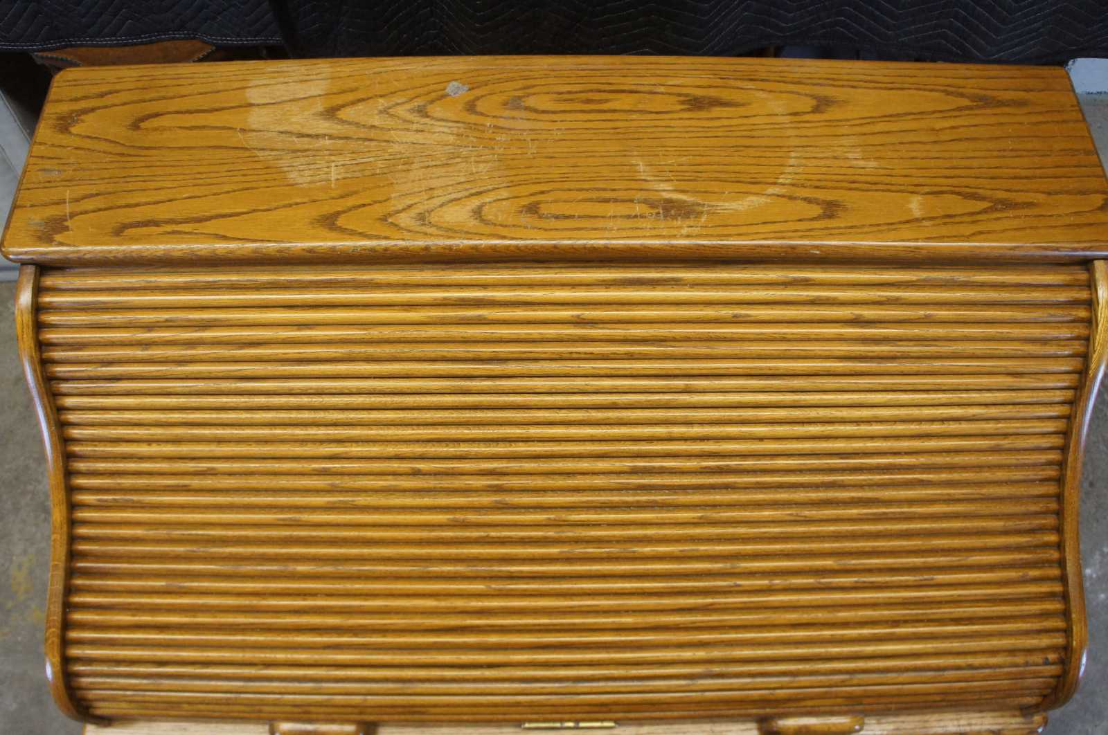 Vintage Oak Craft (Oakcraft) roll top office desk. Features a S curve roll top that opens to a work surface with cubbies for storage and six drawers. The base of the piece has several more drawers for storage.