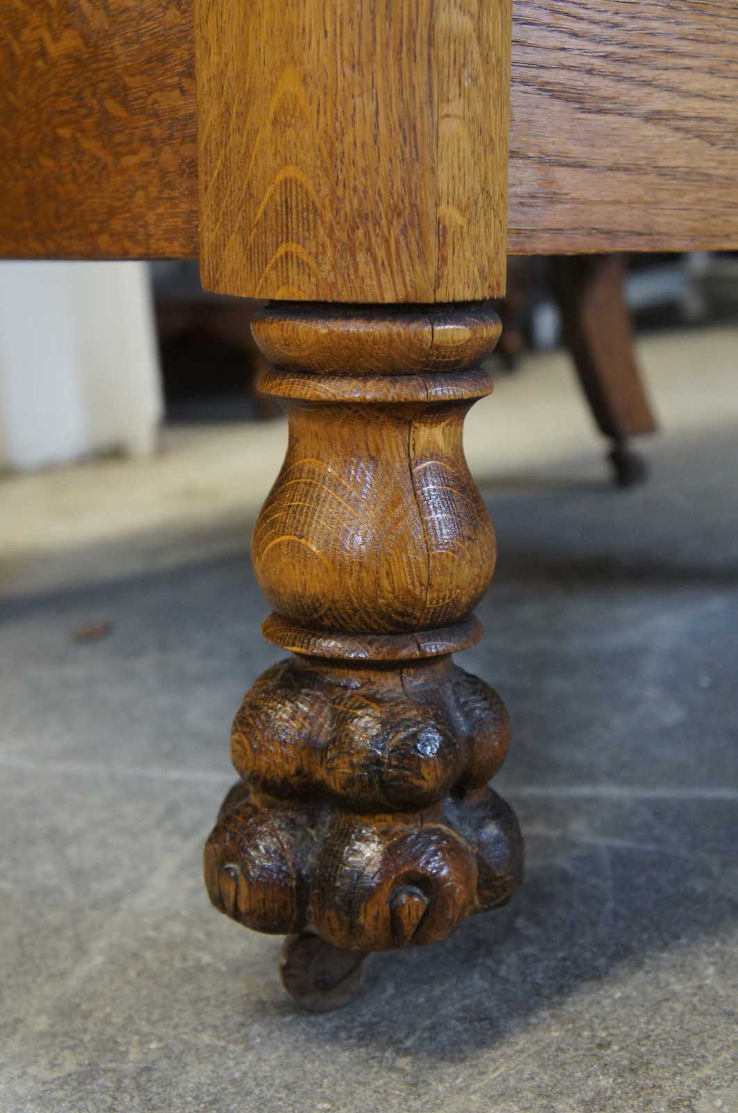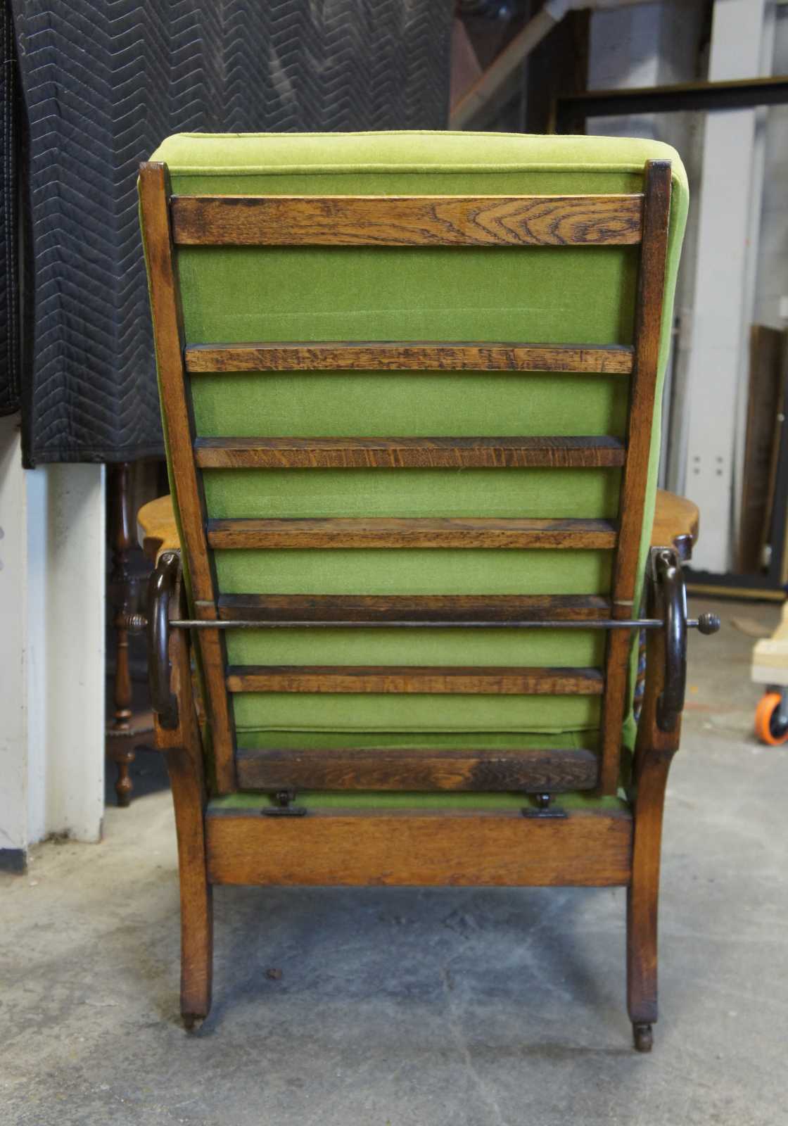 Late 19th century Victorian arm chair. The Morris chair was known for its unique staged reclining mechanism. This beautiful example is made from oak with turned barley twist supports and figural lion head arms. Featuers lion paw feet with castors and green fabric.