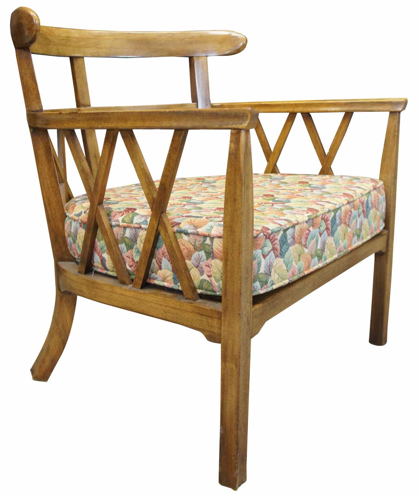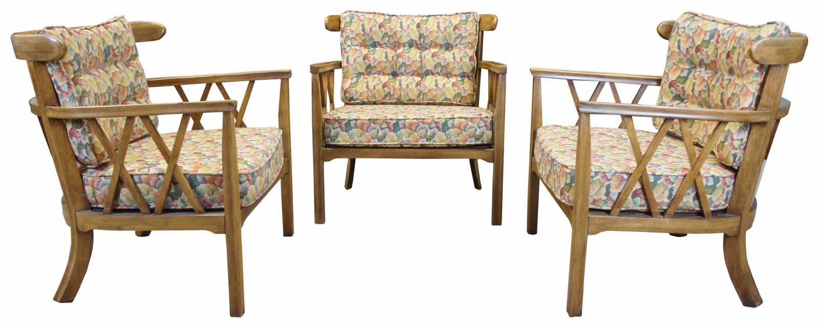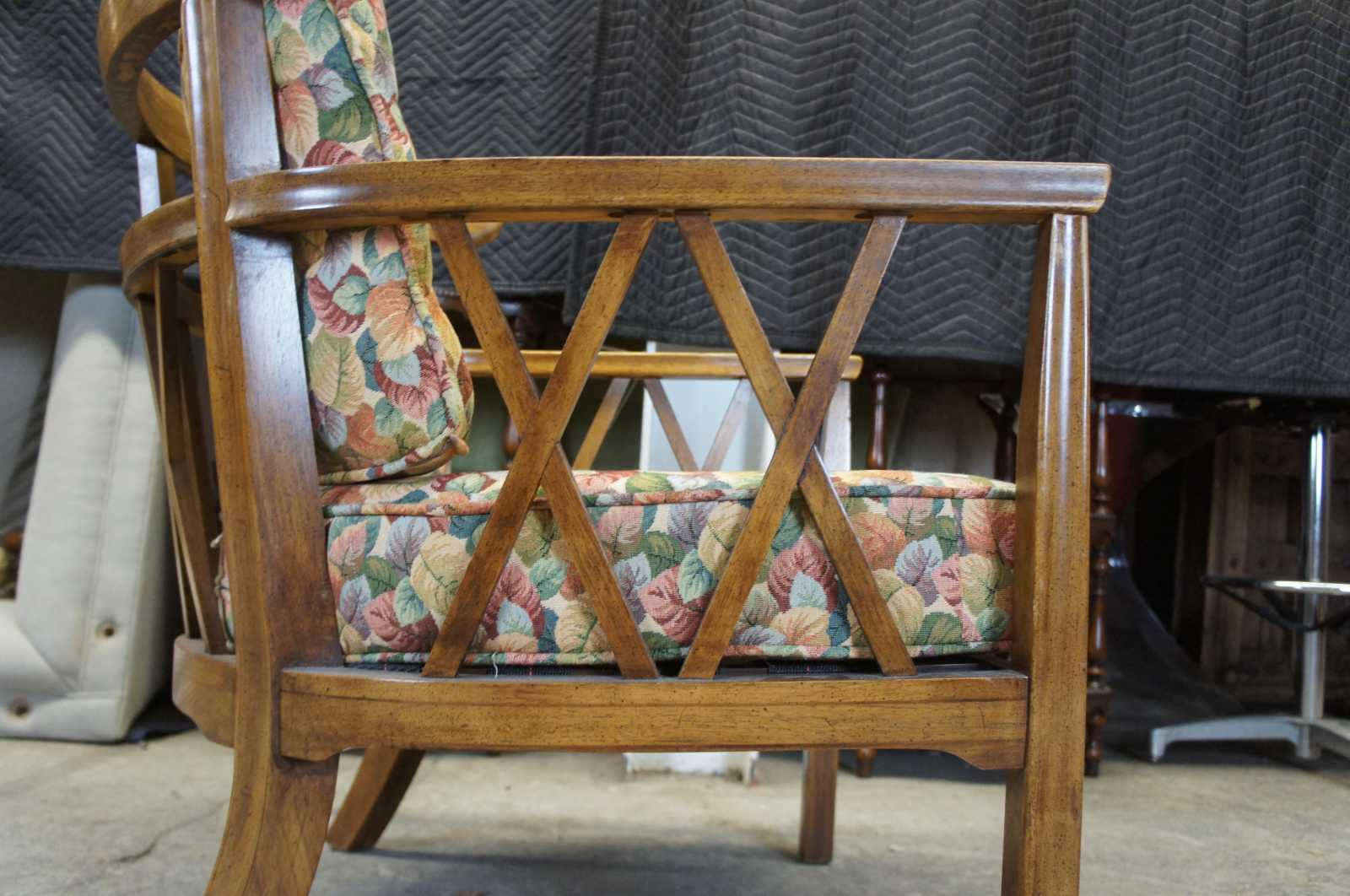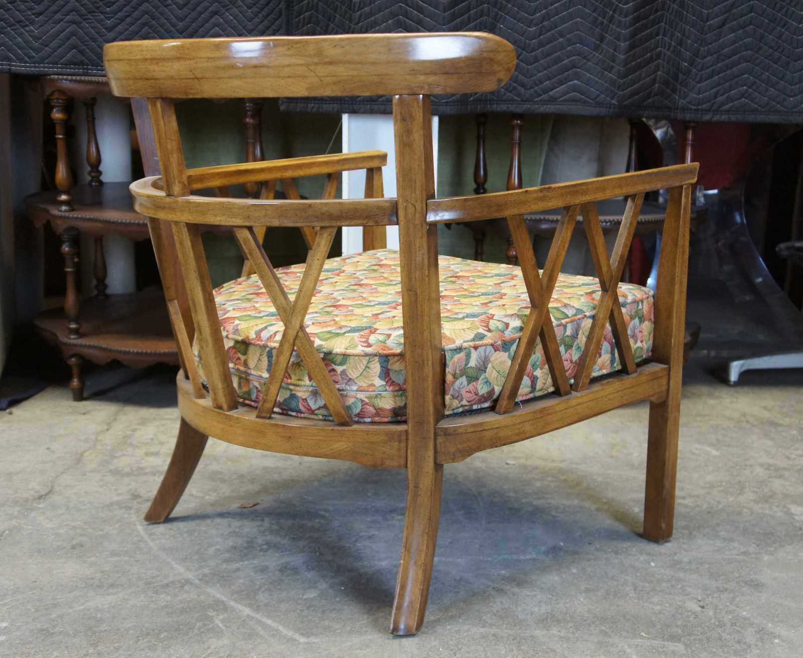 Three 1959 occasional arm chairs by Finch Furniture for Thomasville Chair Company. Made from walnut with a barrel back design and unique x shaped supports. The chairs feature a floral cushion and back support.