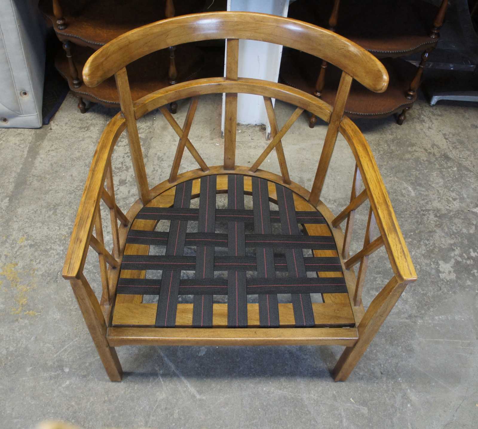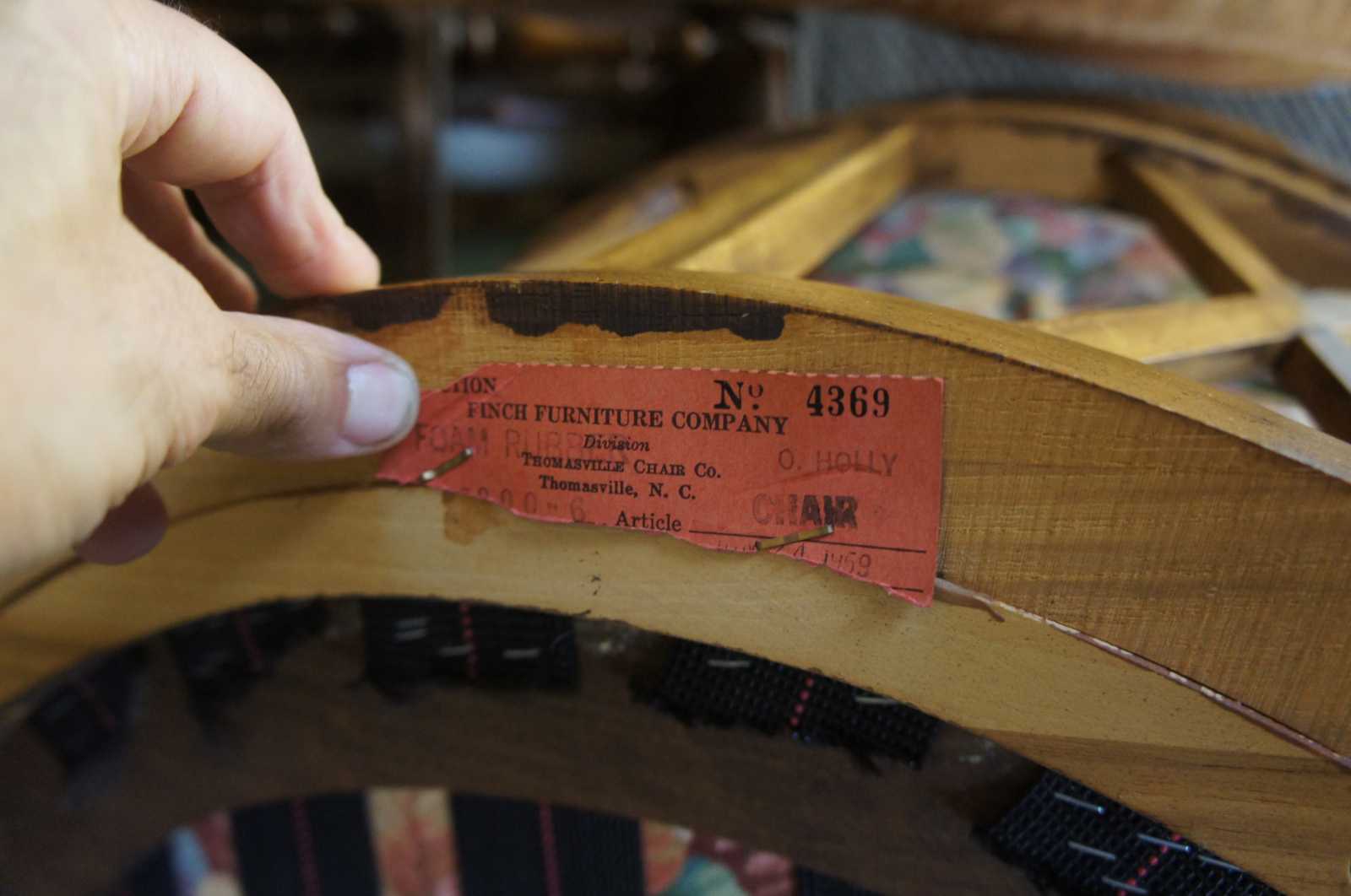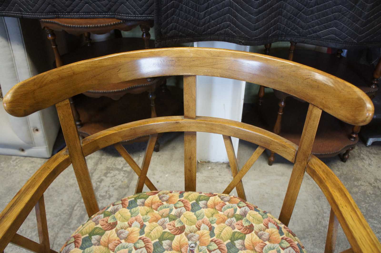 Three 1959 occasional arm chairs by Finch Furniture for Thomasville Chair Company. Made from walnut with a barrel back design and unique x shaped supports. The chairs feature a floral cushion and back support.