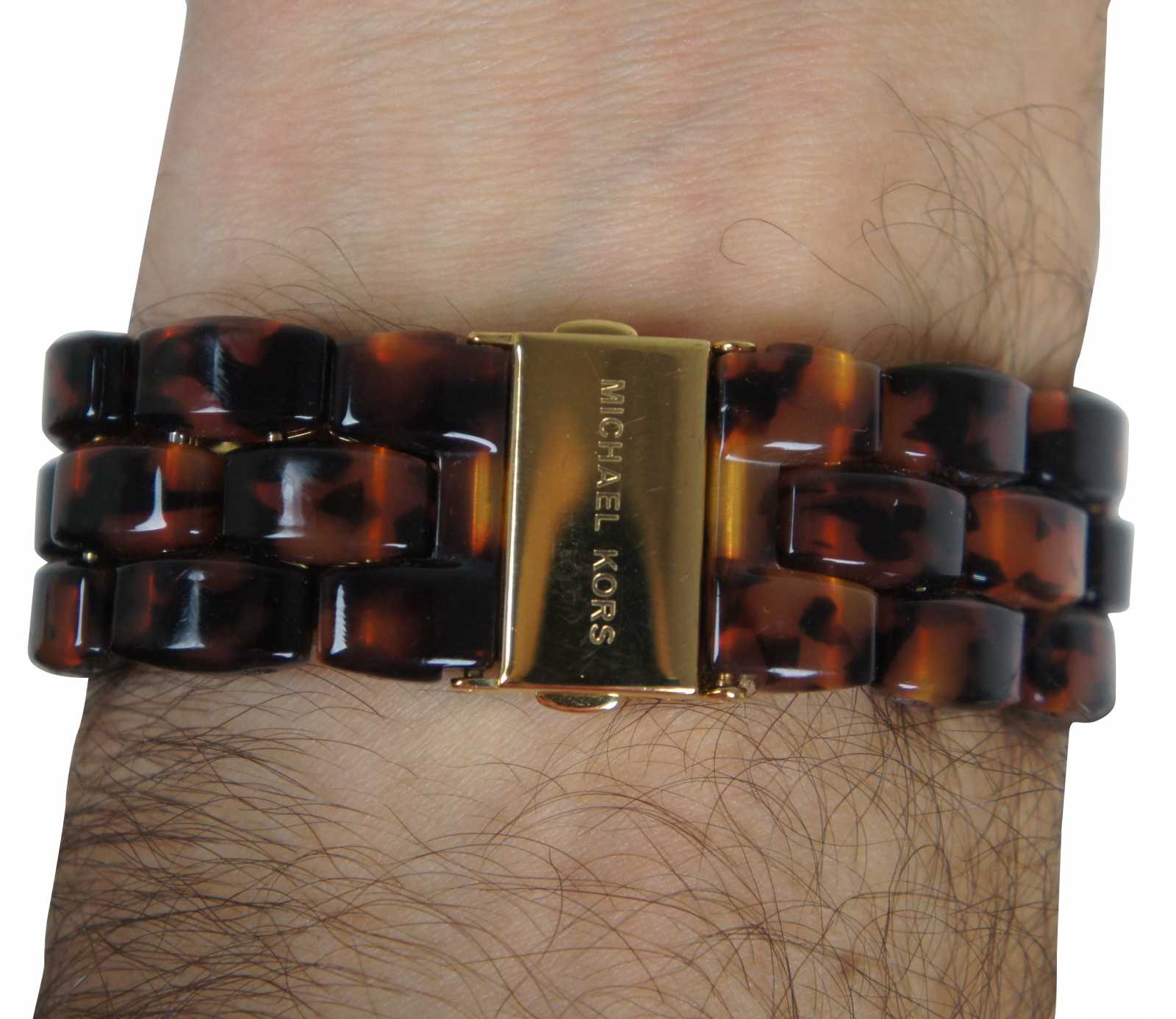 Michael Kors Jet Set faux tortoise shell banded chronograph wrist watch with Swarovski crystals at the hour markers.