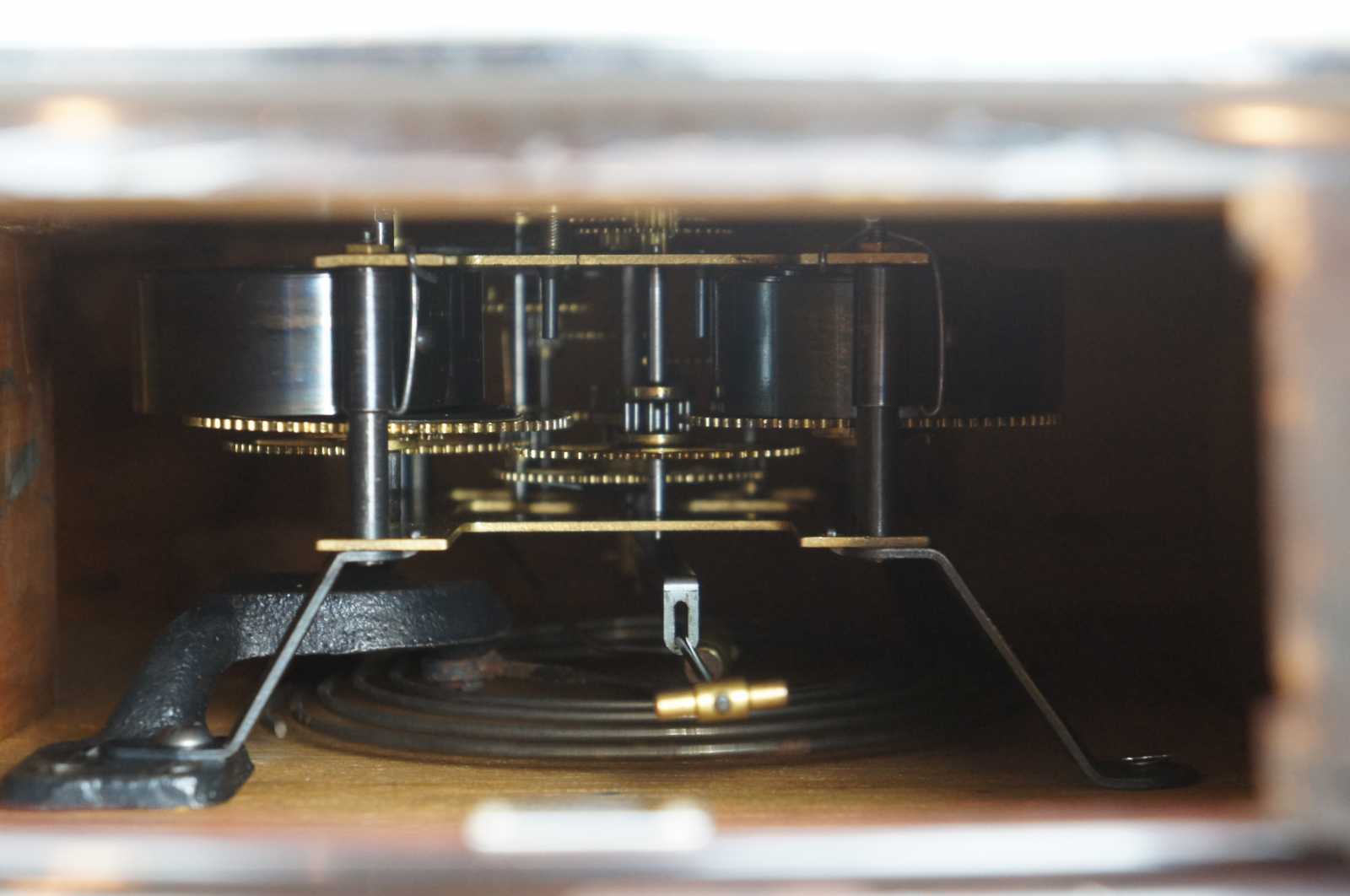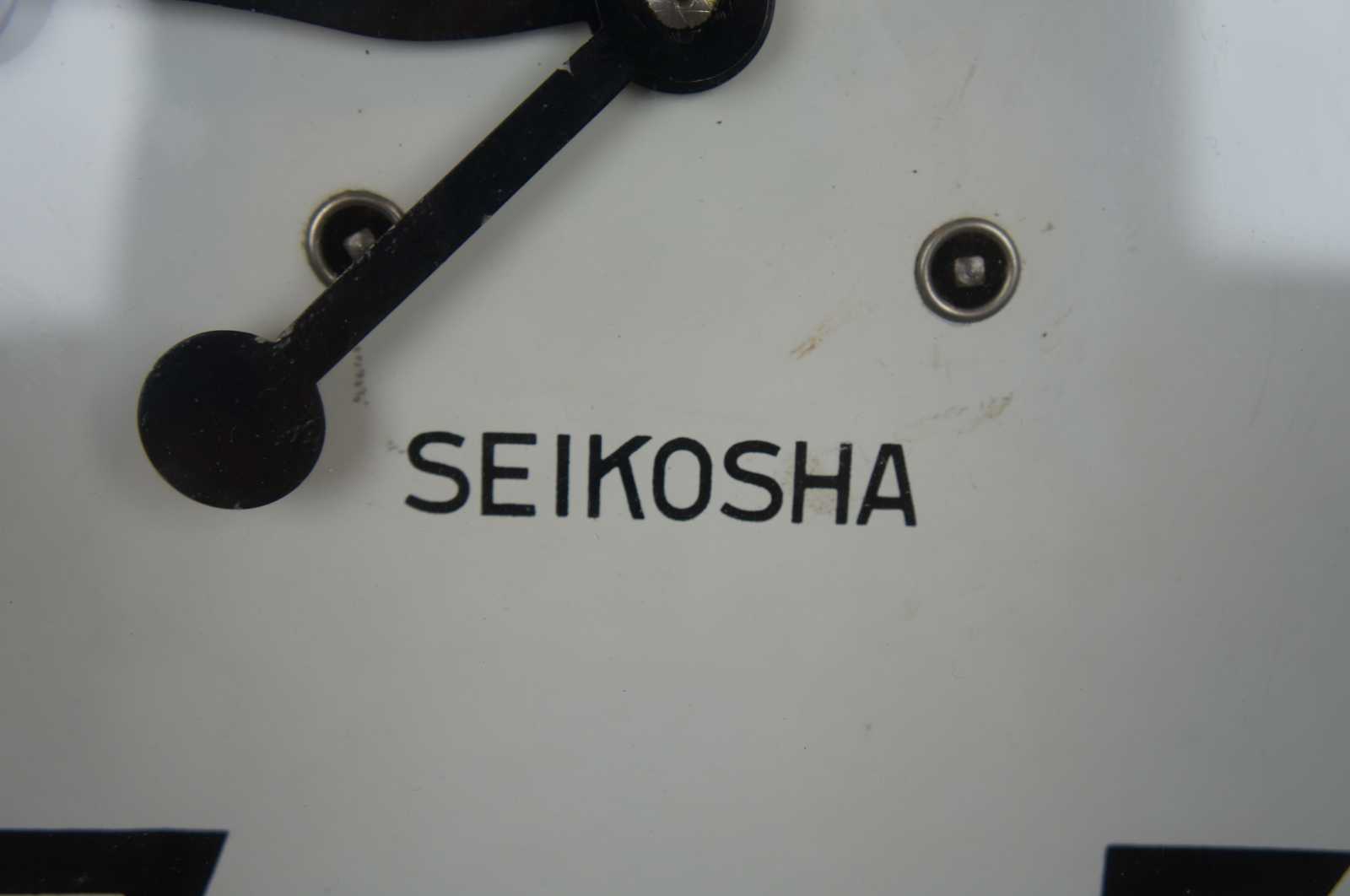 Circa 1930s Seikosha wall clock with deep black wood frame and metal face western numbers. The clock strikes on the half hour and hour. Marked on the back CNWF-E-46-1, YAB-6-10. In 1892, Kintaro Hattori established Seikosha in Tokyo, Japan, where he produced his first wall clocks, marking the beginnings of a company that was to become one of the world’s largest and most important manufacturers of timepieces.