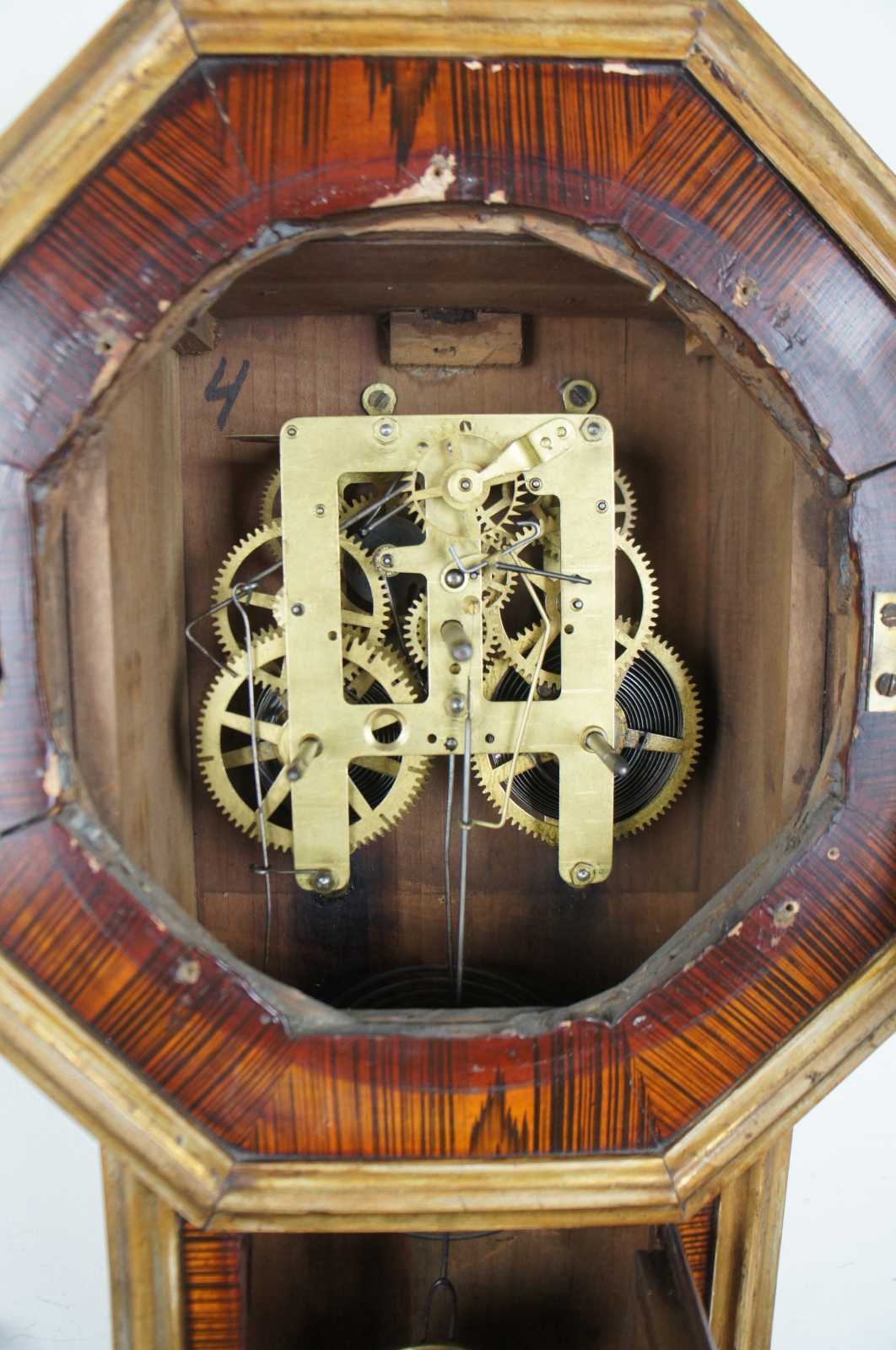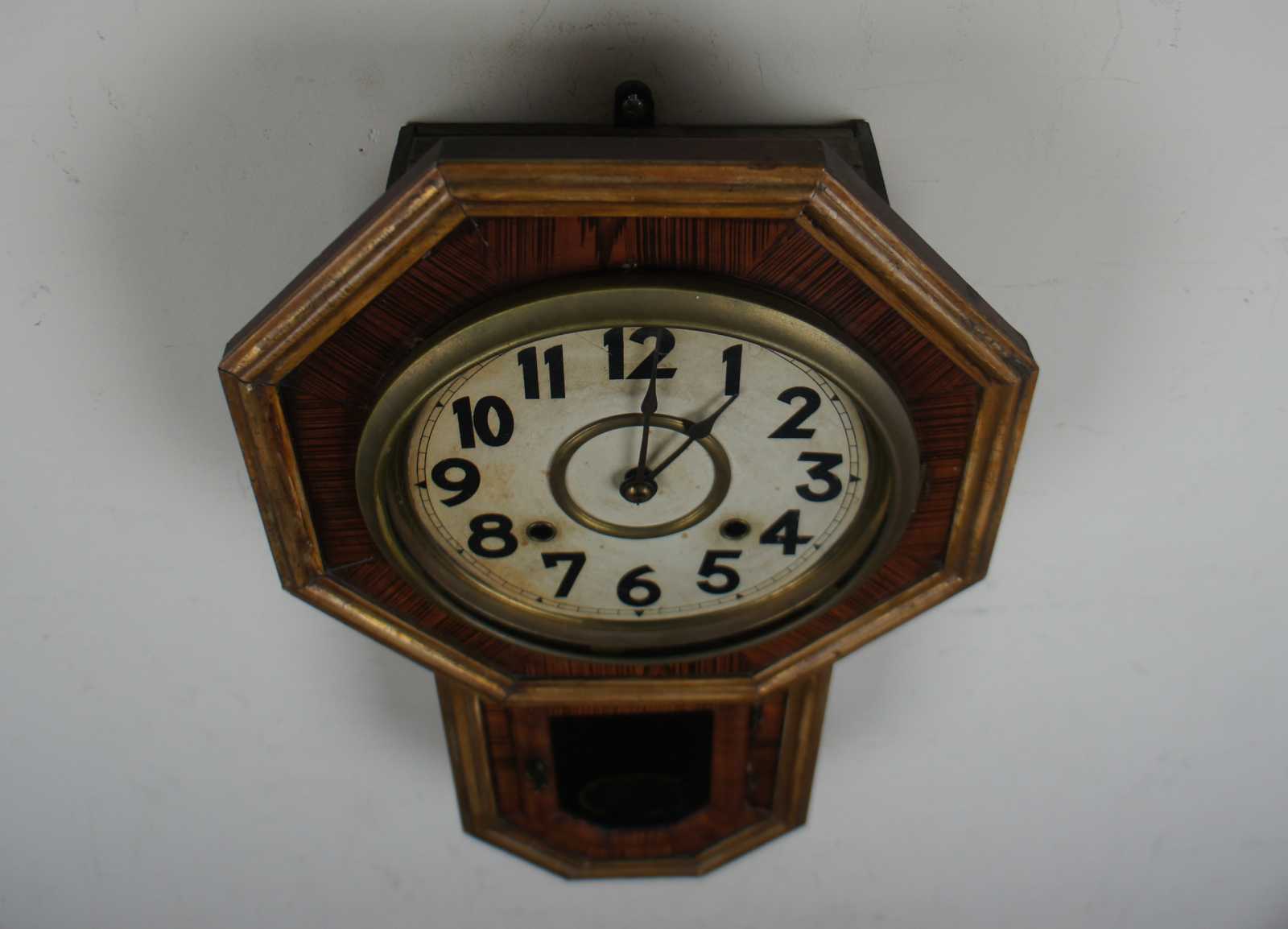 Antique short drop schoolhouse style octagonal wood veneered artisan wall clock.