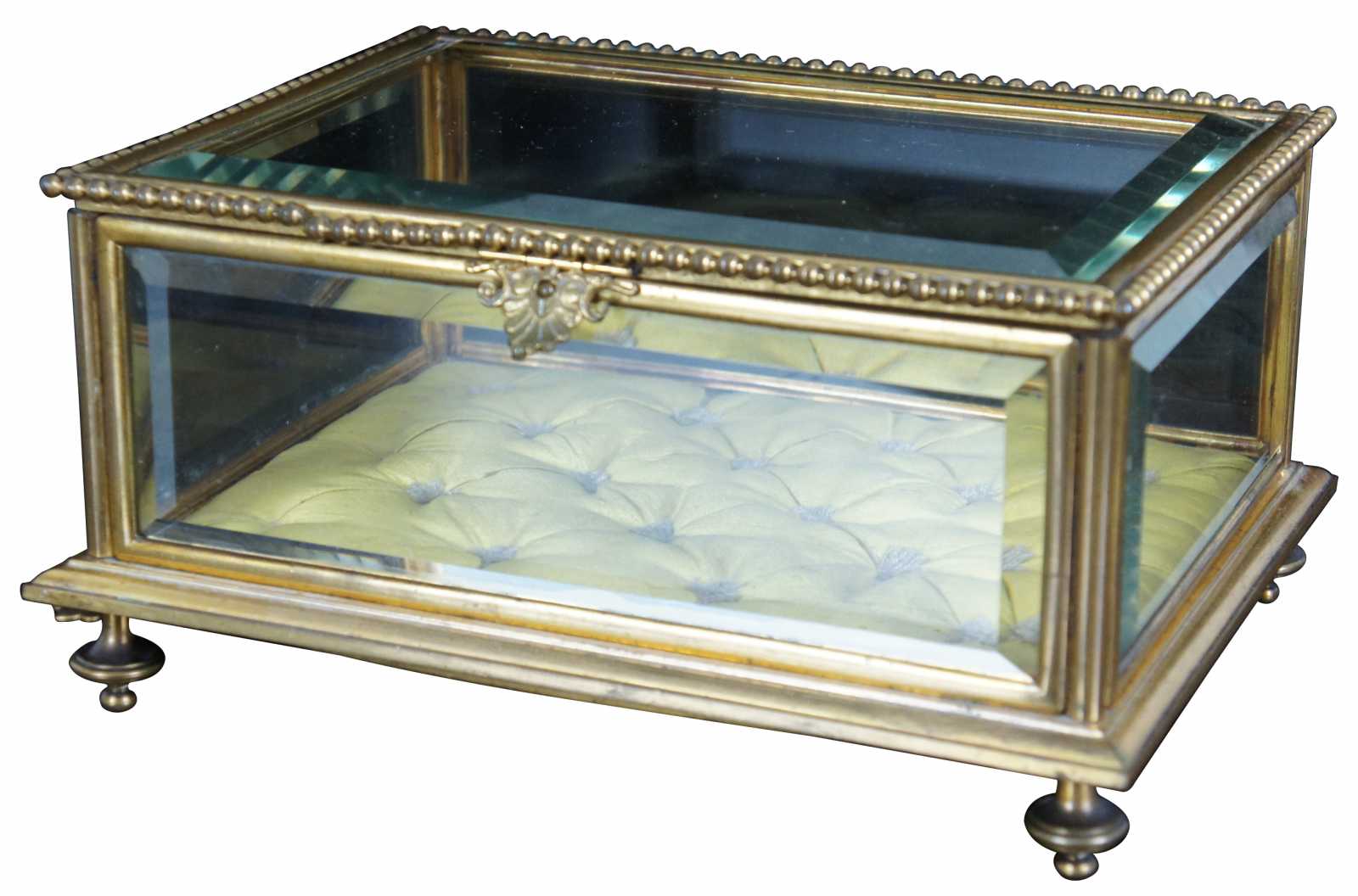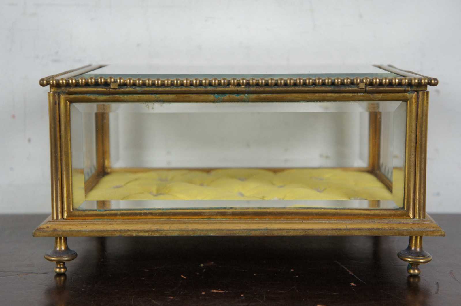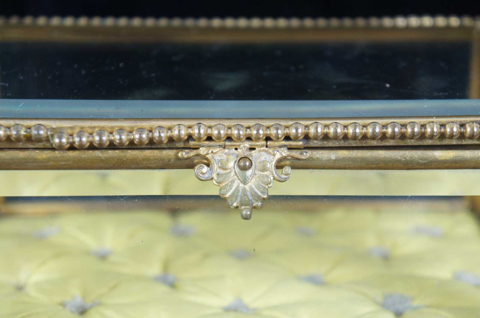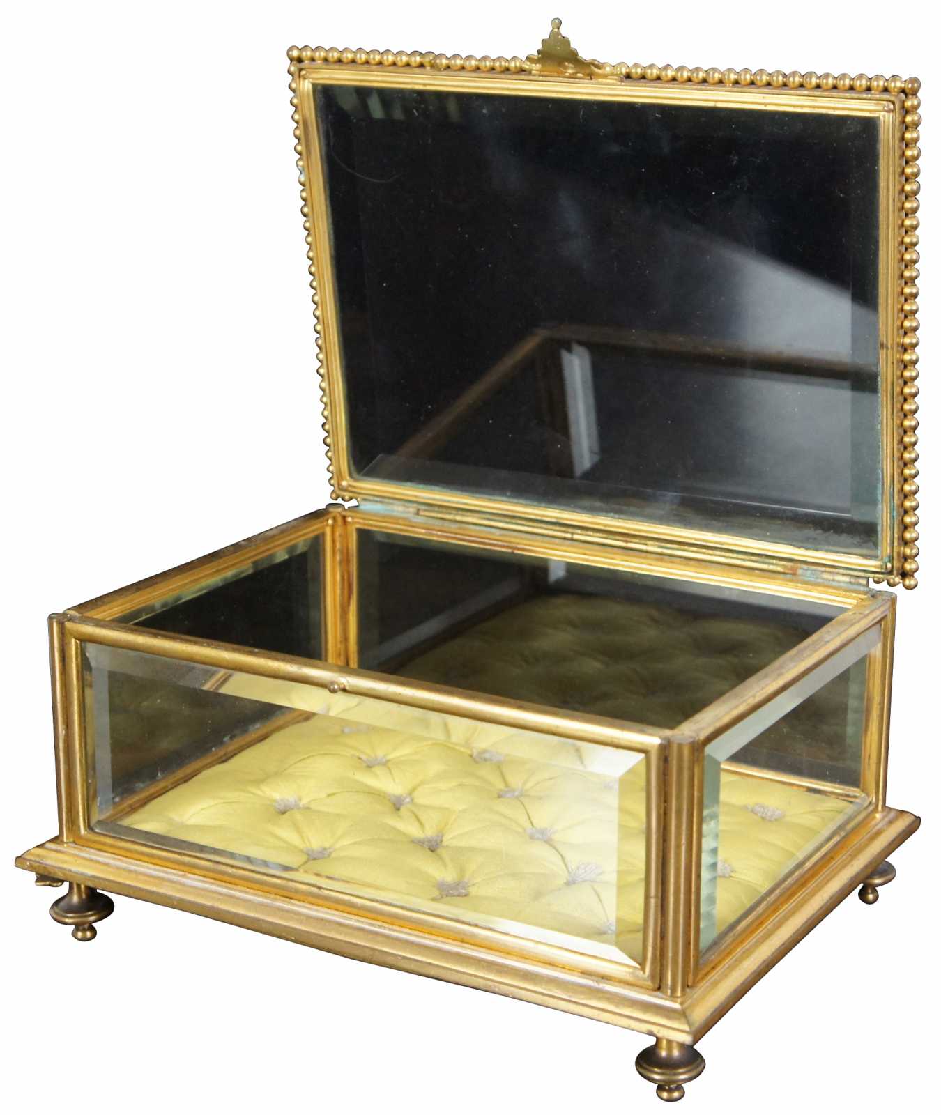 Antique bronze footed jewelry casket with beaded trim, beveled glass sides and padded with tufted yellow fabric.