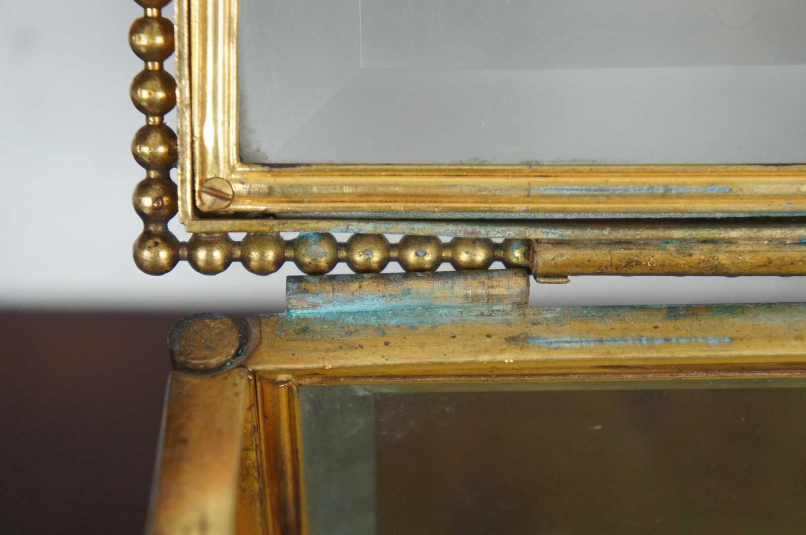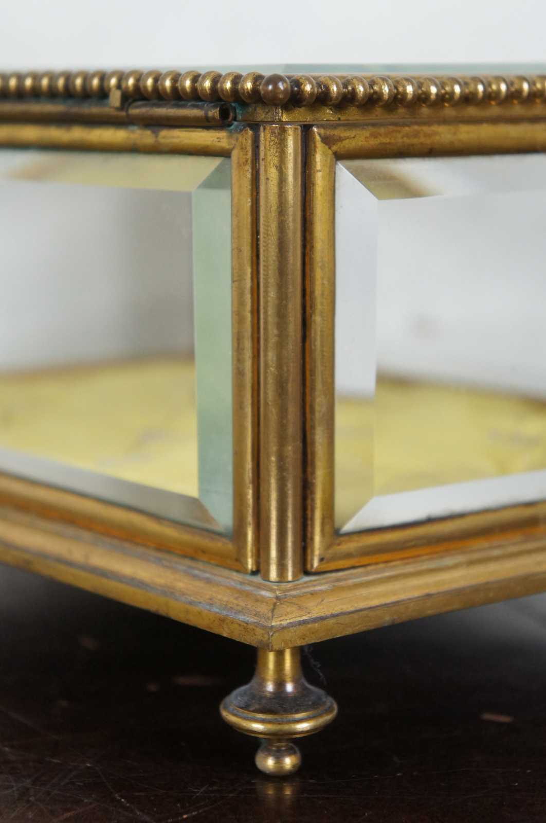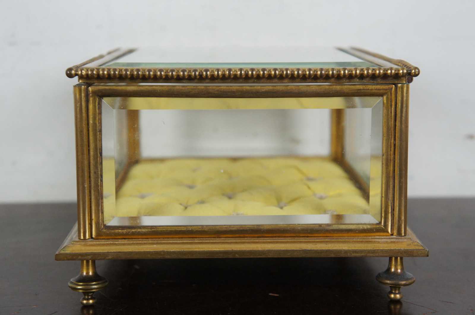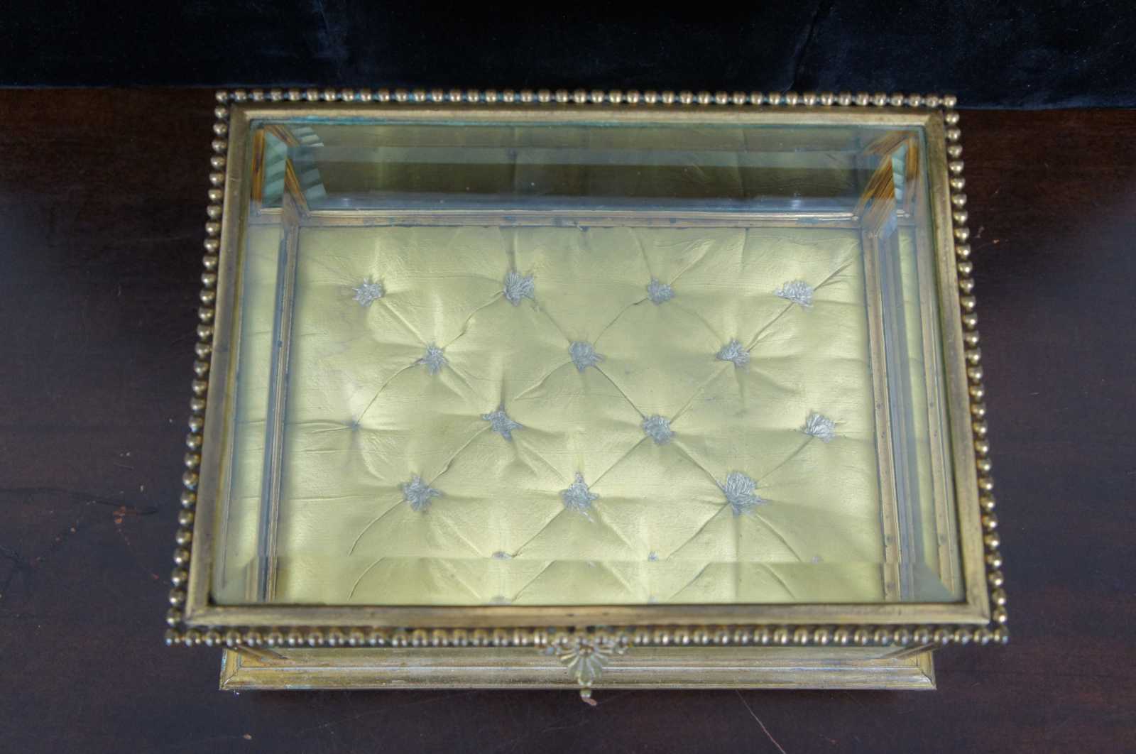 Antique bronze footed jewelry casket with beaded trim, beveled glass sides and padded with tufted yellow fabric.