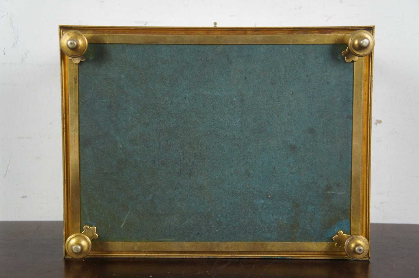 Some oxidation/tarnish, trim piece off along front, hinge is loose / needs new rod back left, small chip to bevel front top left, staining to fabric, see pictures