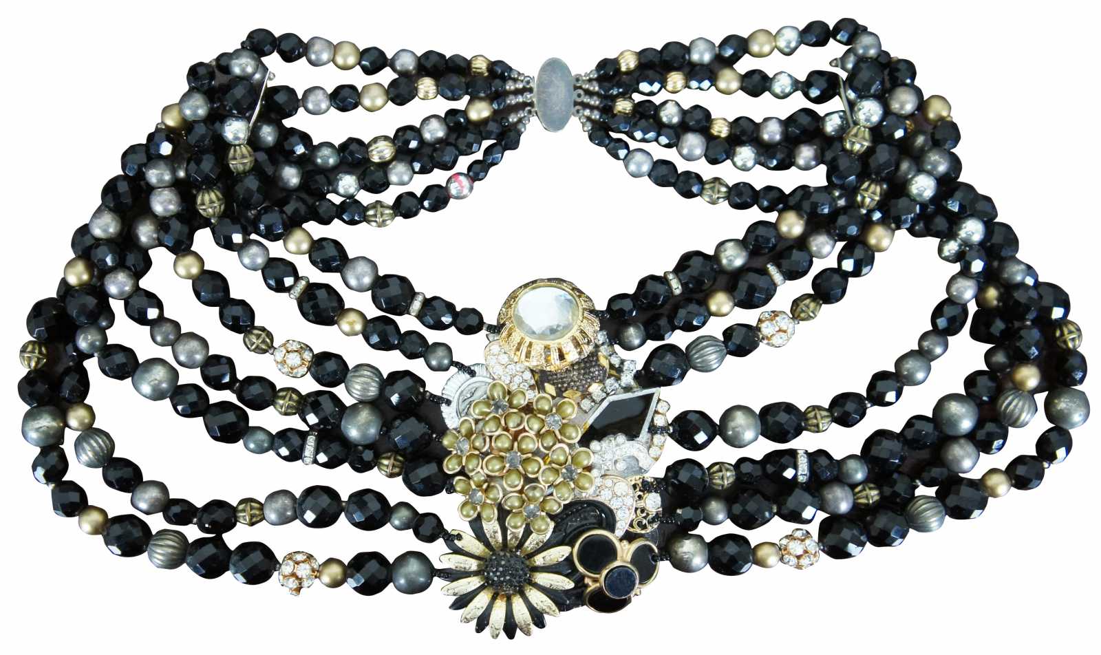 Glamorous, immense, vintage seven layered collar necklace of jet black, sterling silver, gold tone and rhinestone beads with a central collage cluster of jeweled flowers and rhinestones. Clasp marked sterling sivler on back.
