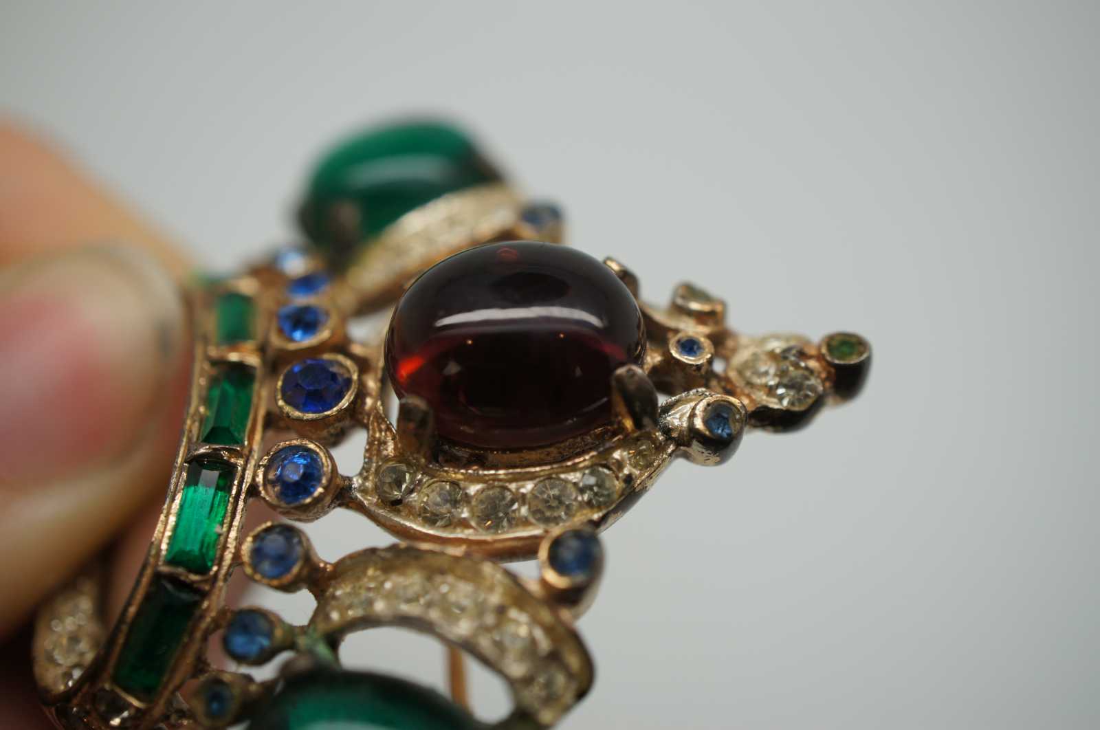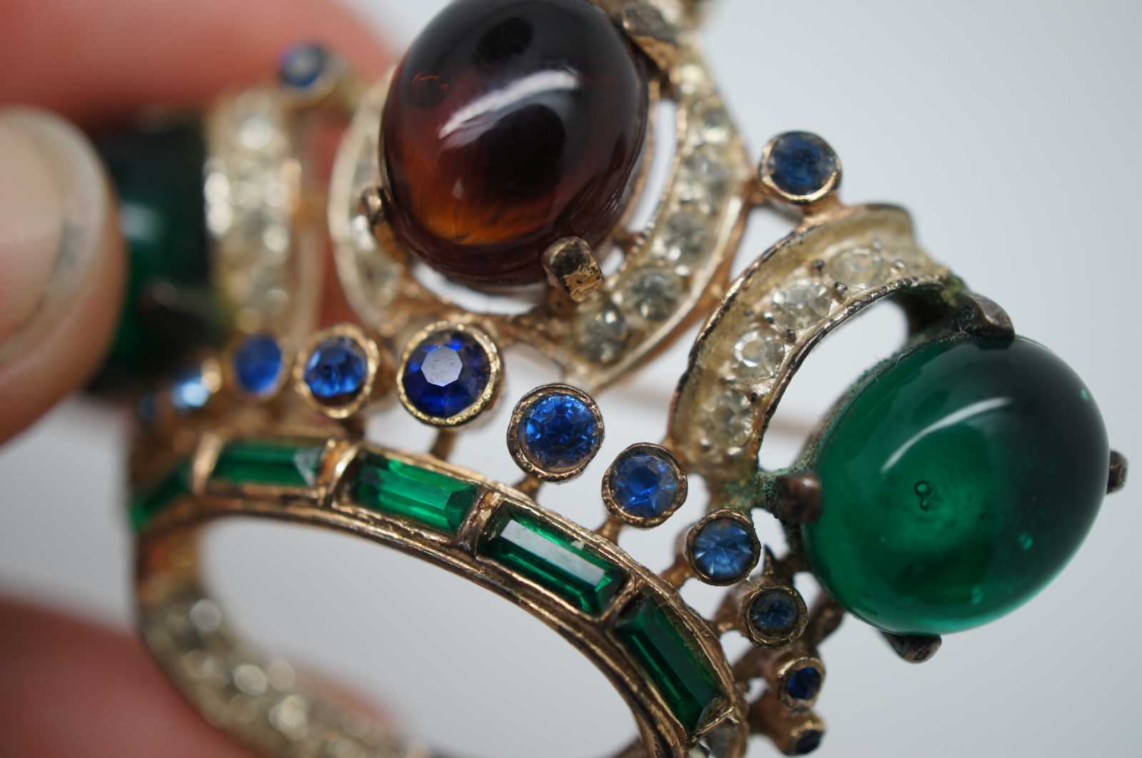 Vintage 1940’s crown shaped pin by Coro Craft, sterling silver with green, red, white and blue rhinestones. Pagasis horse symbol on back.