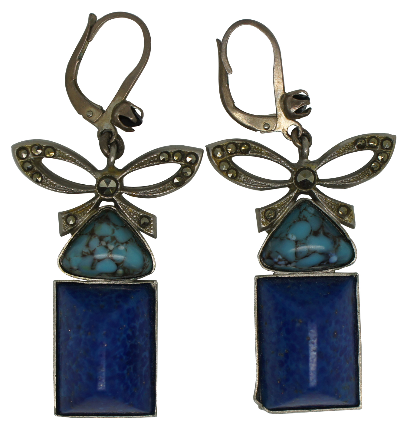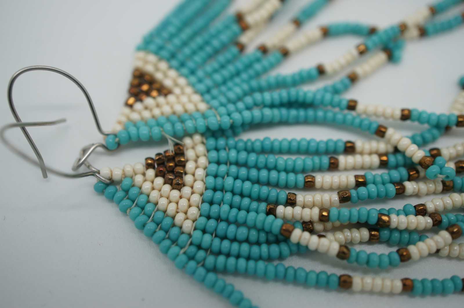 Two pairs of vintage southwestern earrings - one turquoise, white and bronze seed bead chandeliers and one lapis lazuli and turquoise stone dangles topped with bows with hematite accents.