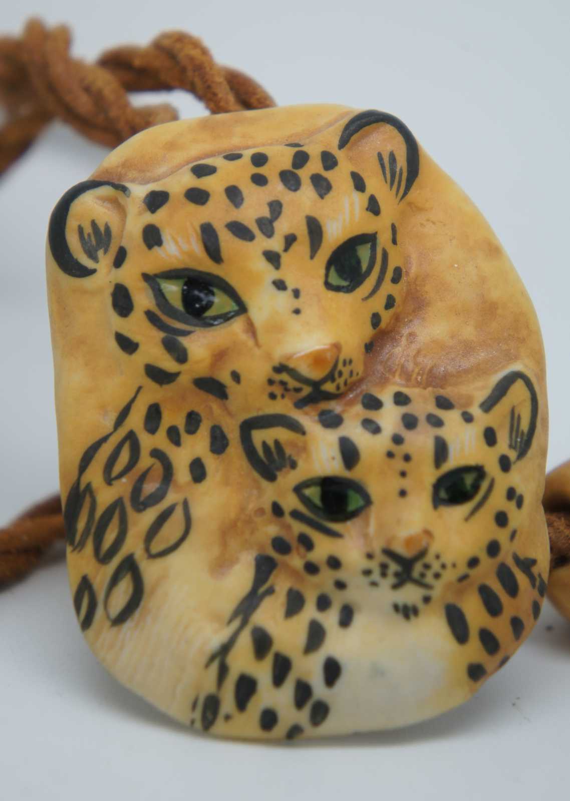 Hand made and painted porcelain pendant necklace on leather cord by Carol Halmy, featuring a mother and baby cheetah with green eyes and a braided / twisted suede bolo tie. Pendant signed by Carol on backside.