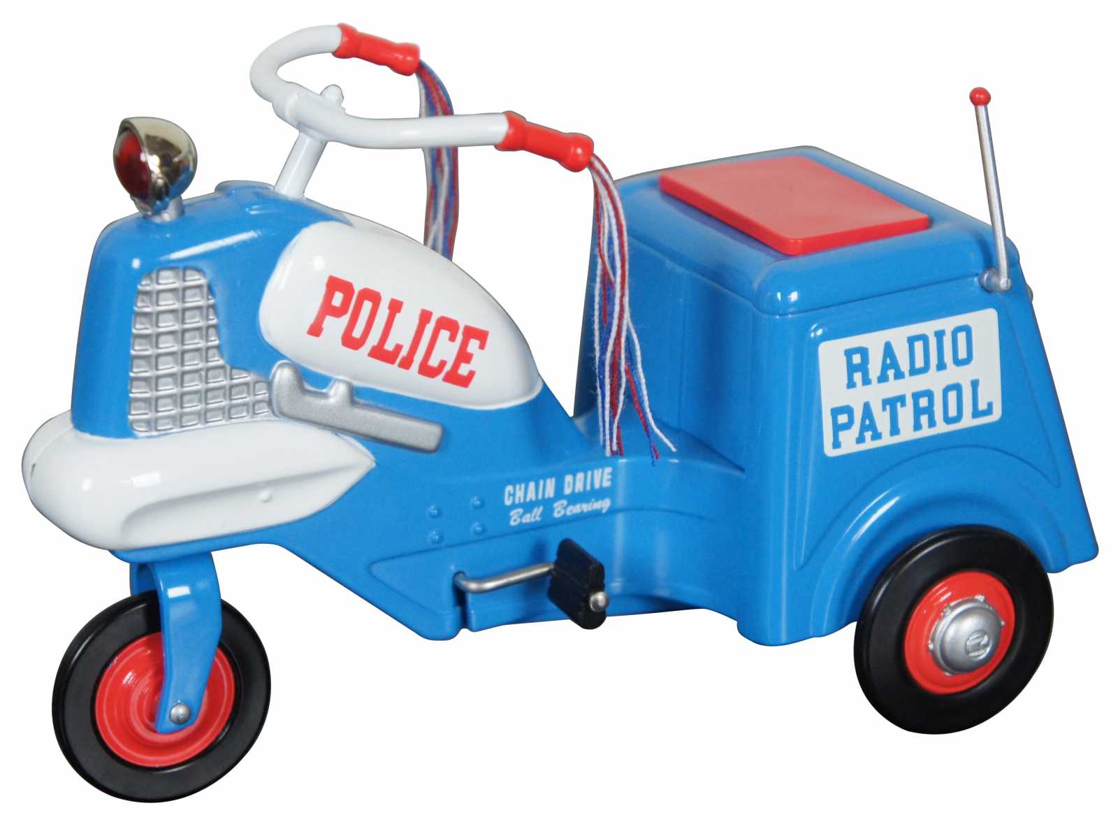 1958 Murray Police Cycle from Hallmark’s Kiddie Car Classics Sidewalk Cruisers Collection, 1995. Includes certificate of authenticity, instructions and original packaging. Batteries shown are included as reference for replacement – they are original to box and no longer good.