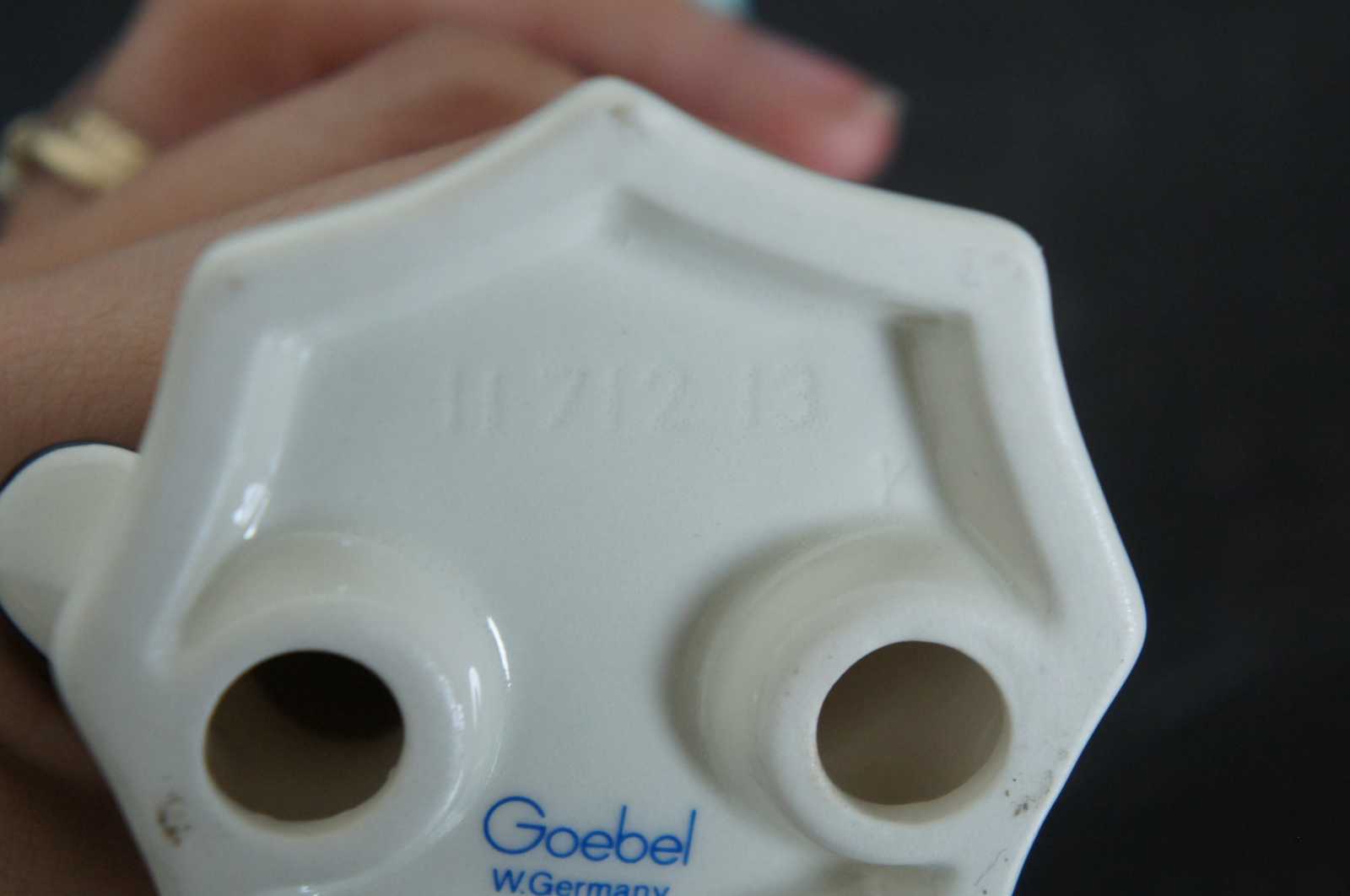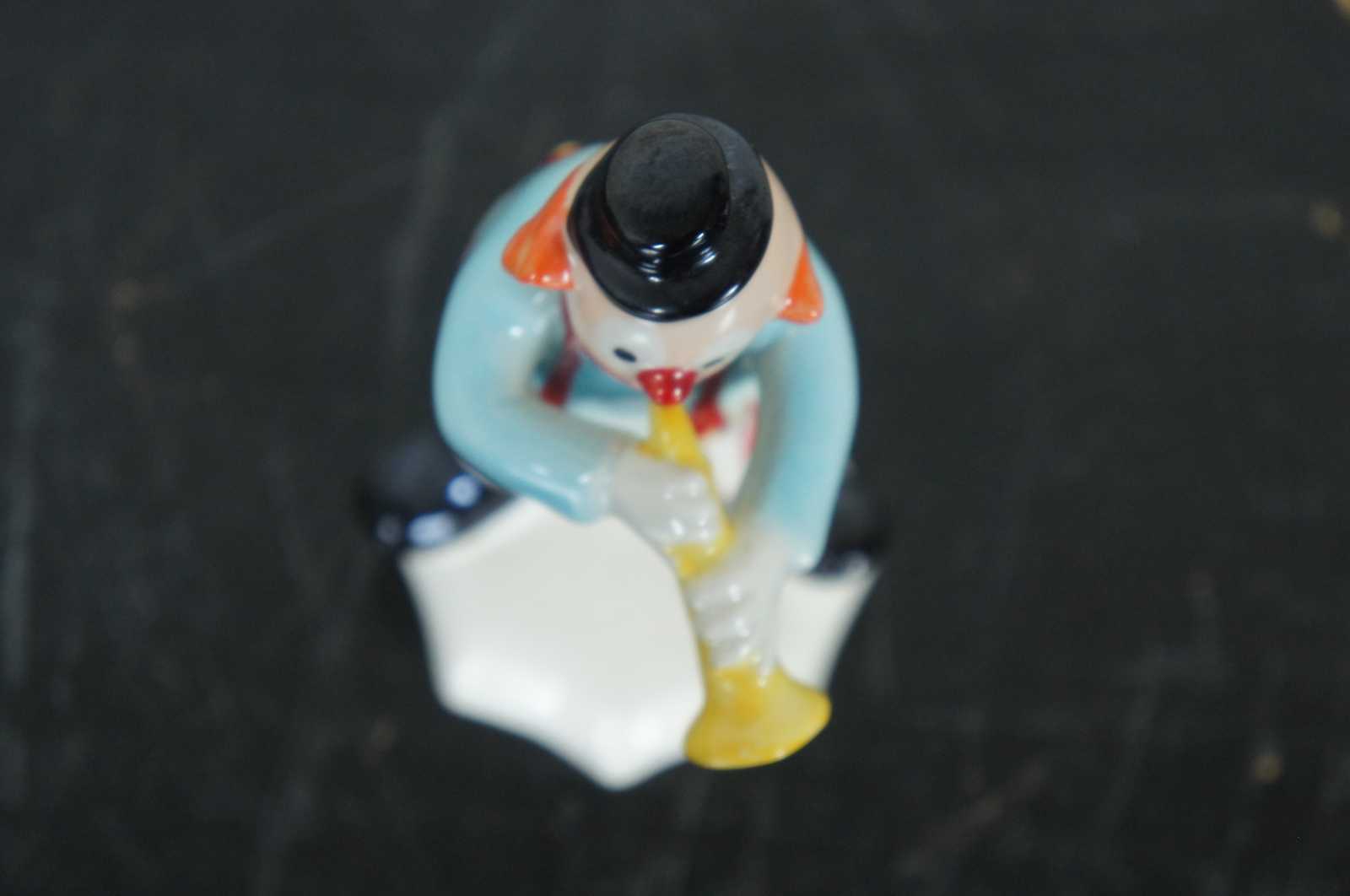 3 Available – Vintage Goebel porcelain red headed clown figurine in a blue shirt, black hat, and striped pants, playing a horn or trumpet.