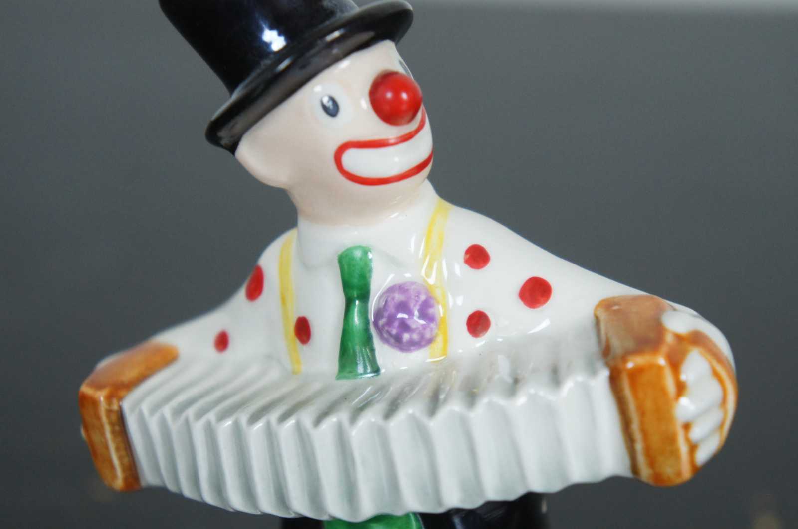 Vintage Goebel West Germany ceramic figurine of a clown in a black top hat and polka dot shirt playing the accordion or concertina.