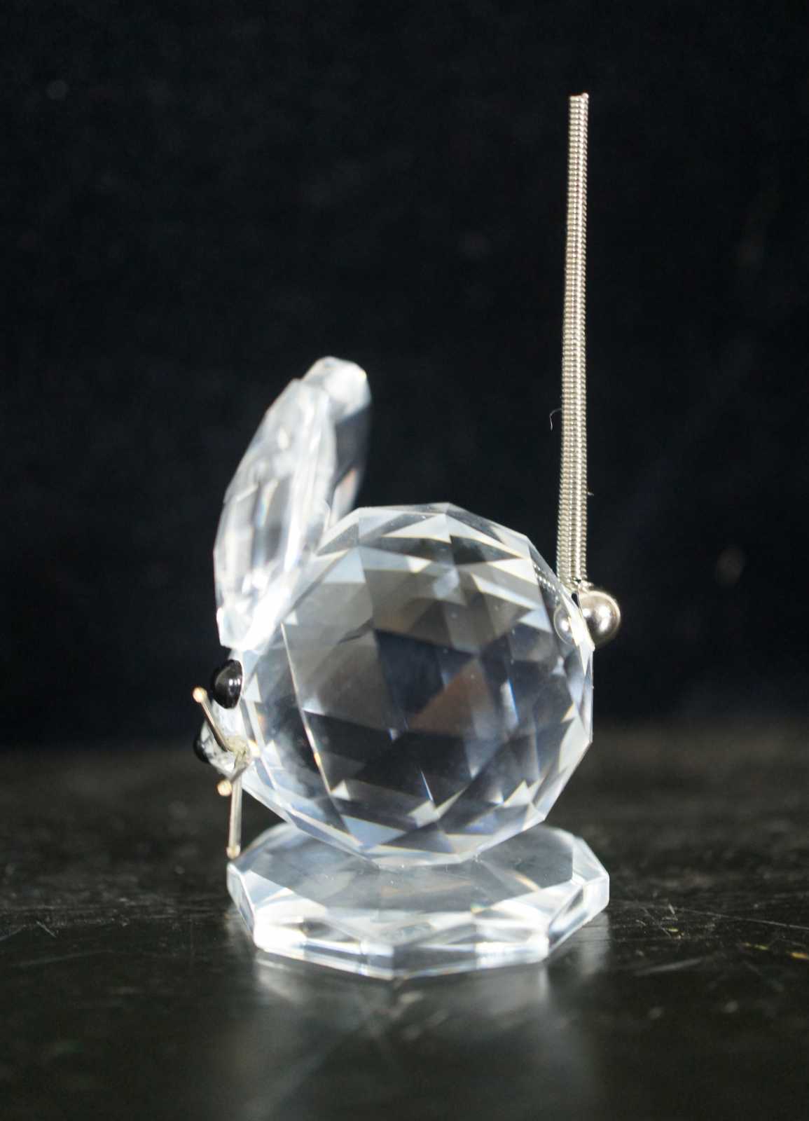 Swarovski crystal mouse figurine with black eye and nose, silver whiskers and upright spring tail.