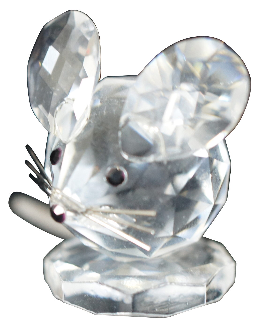 2 Available – Swarovski crystal figurine of a mouse on a small platform with silver whiskers and a shiny leather tail.