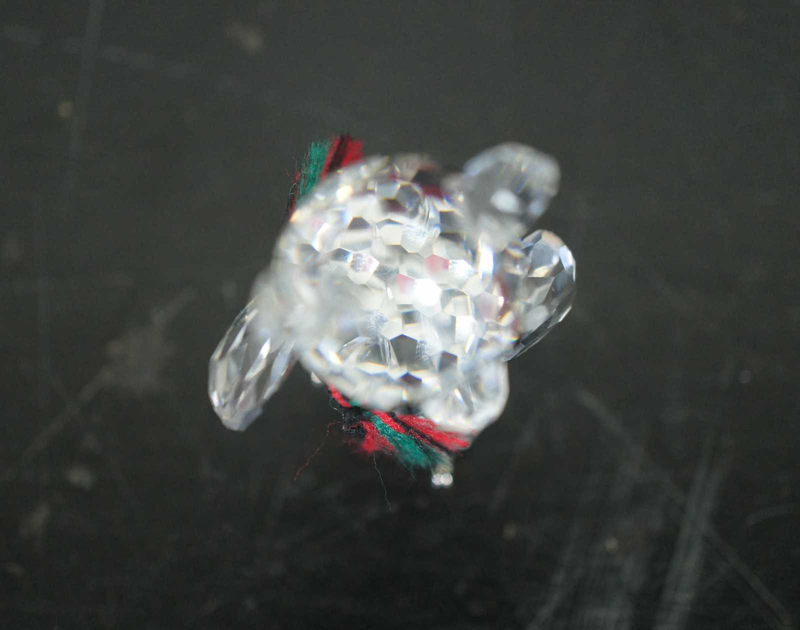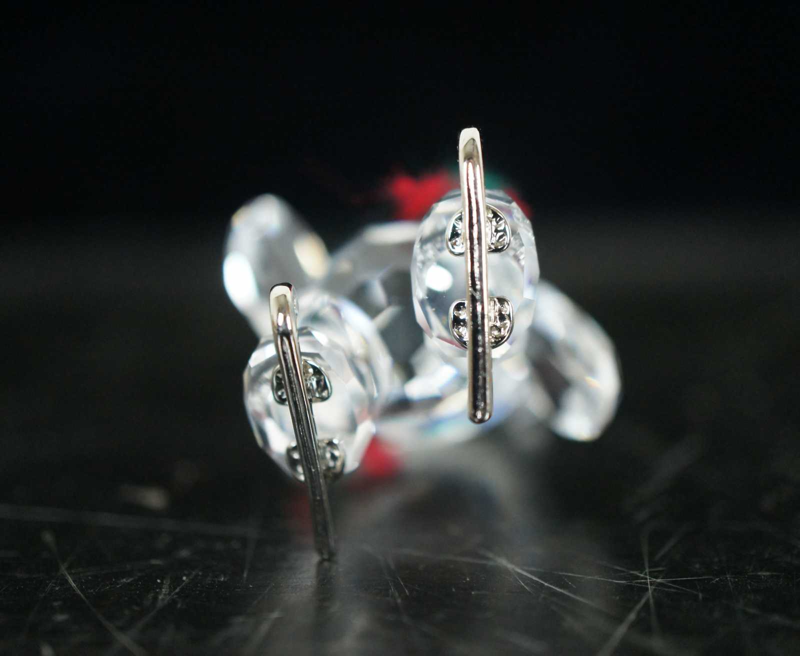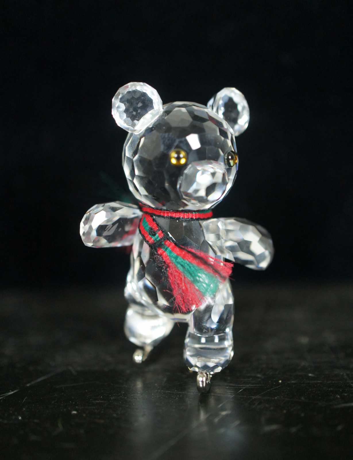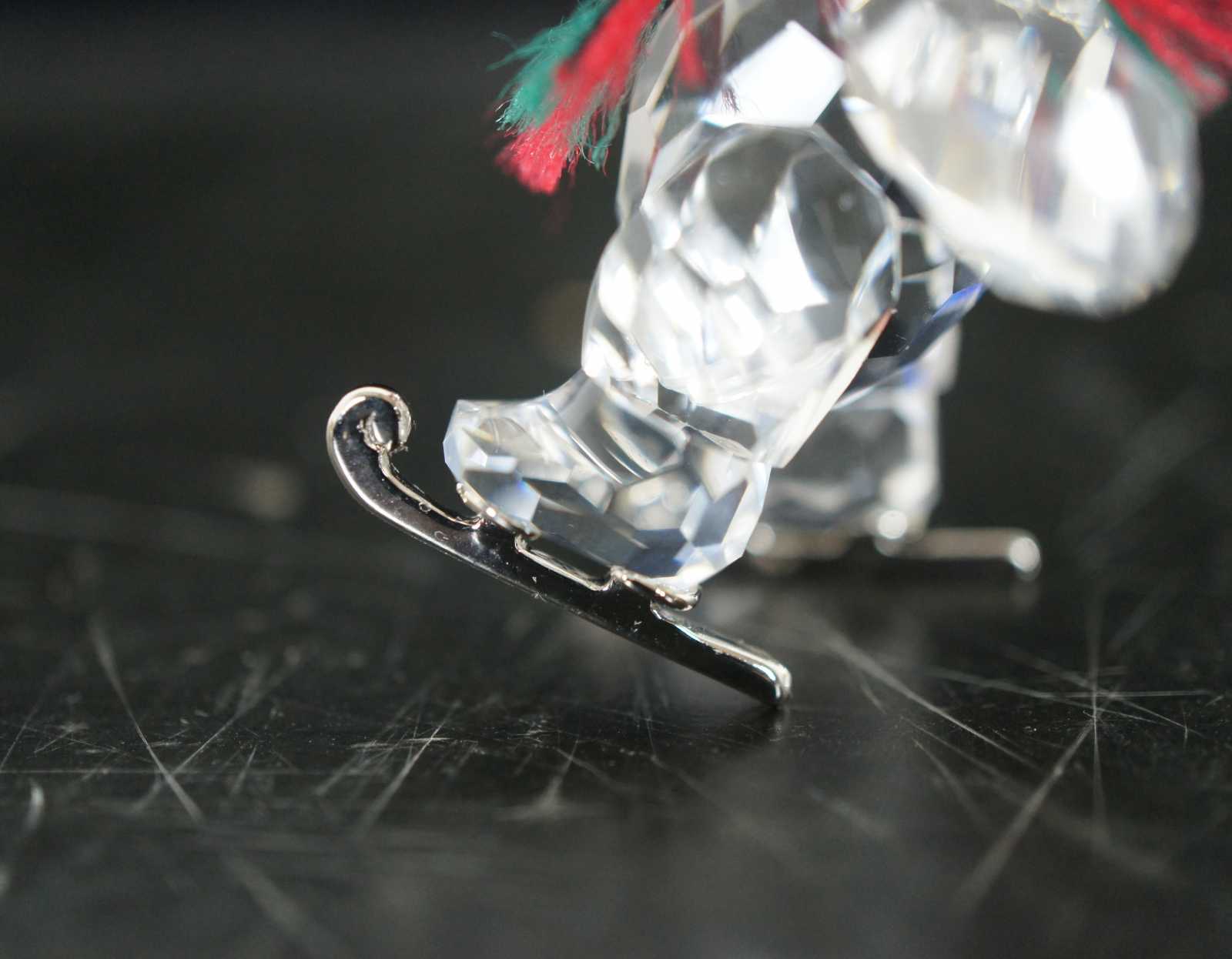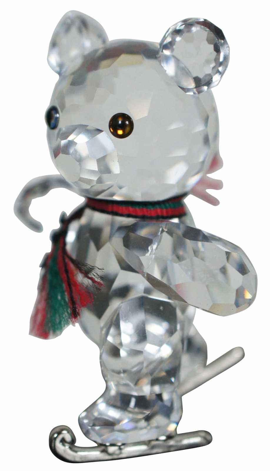 Swarovski crystal Kris bear figurine with silver ice skates and a red and green scarf.
