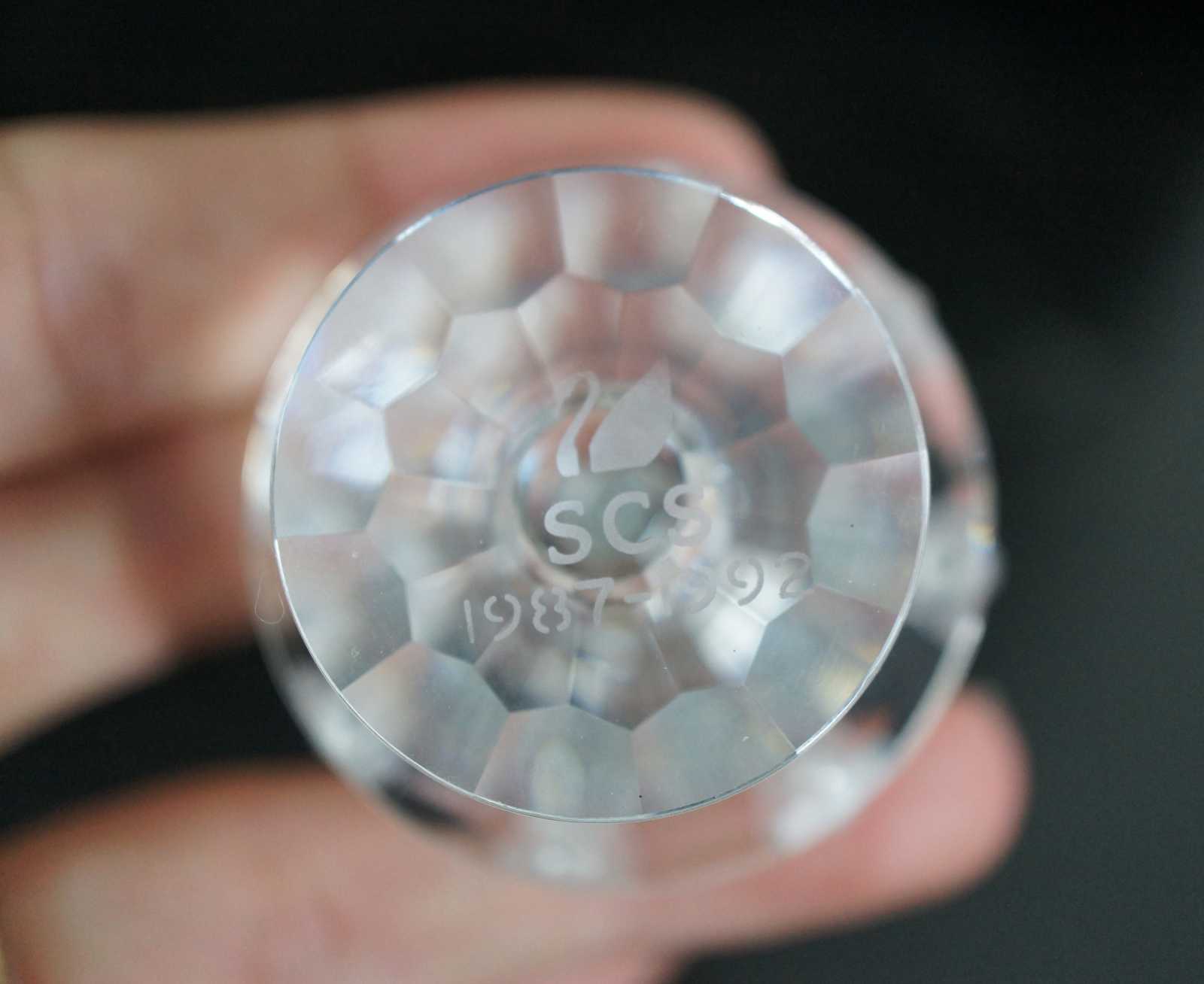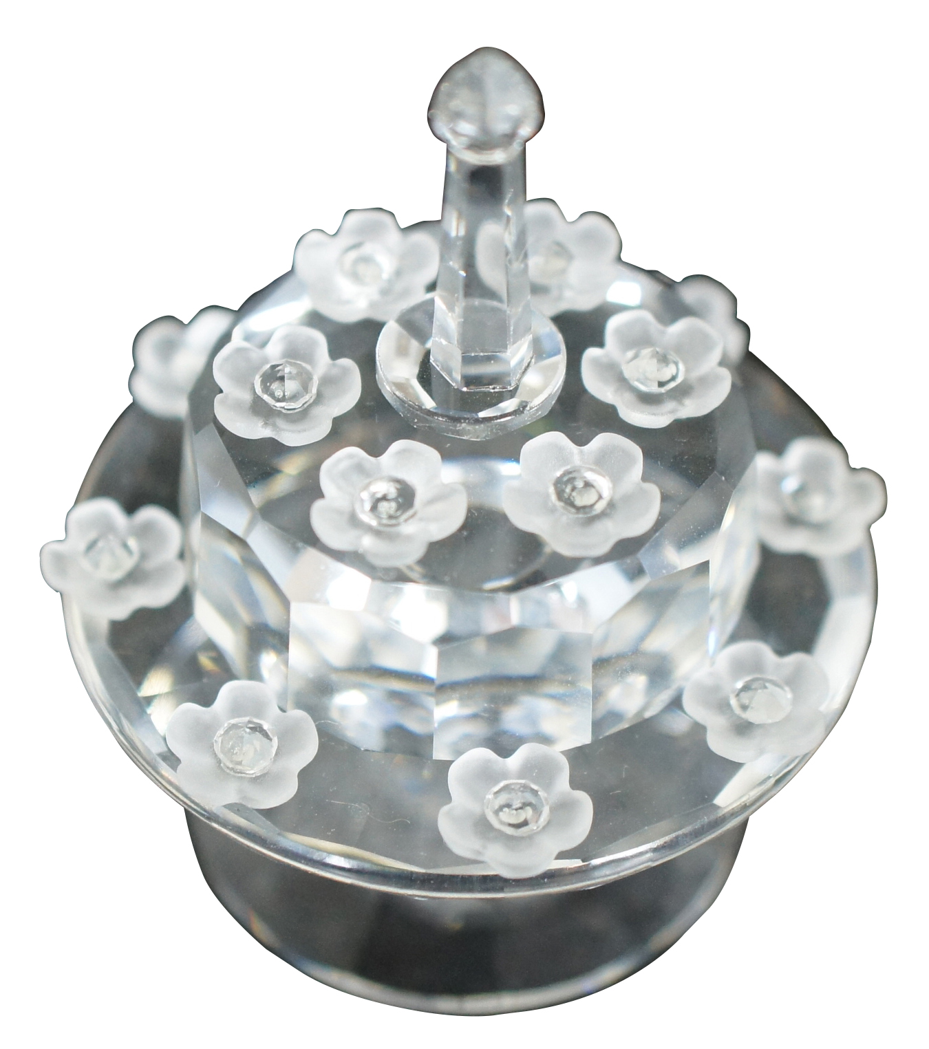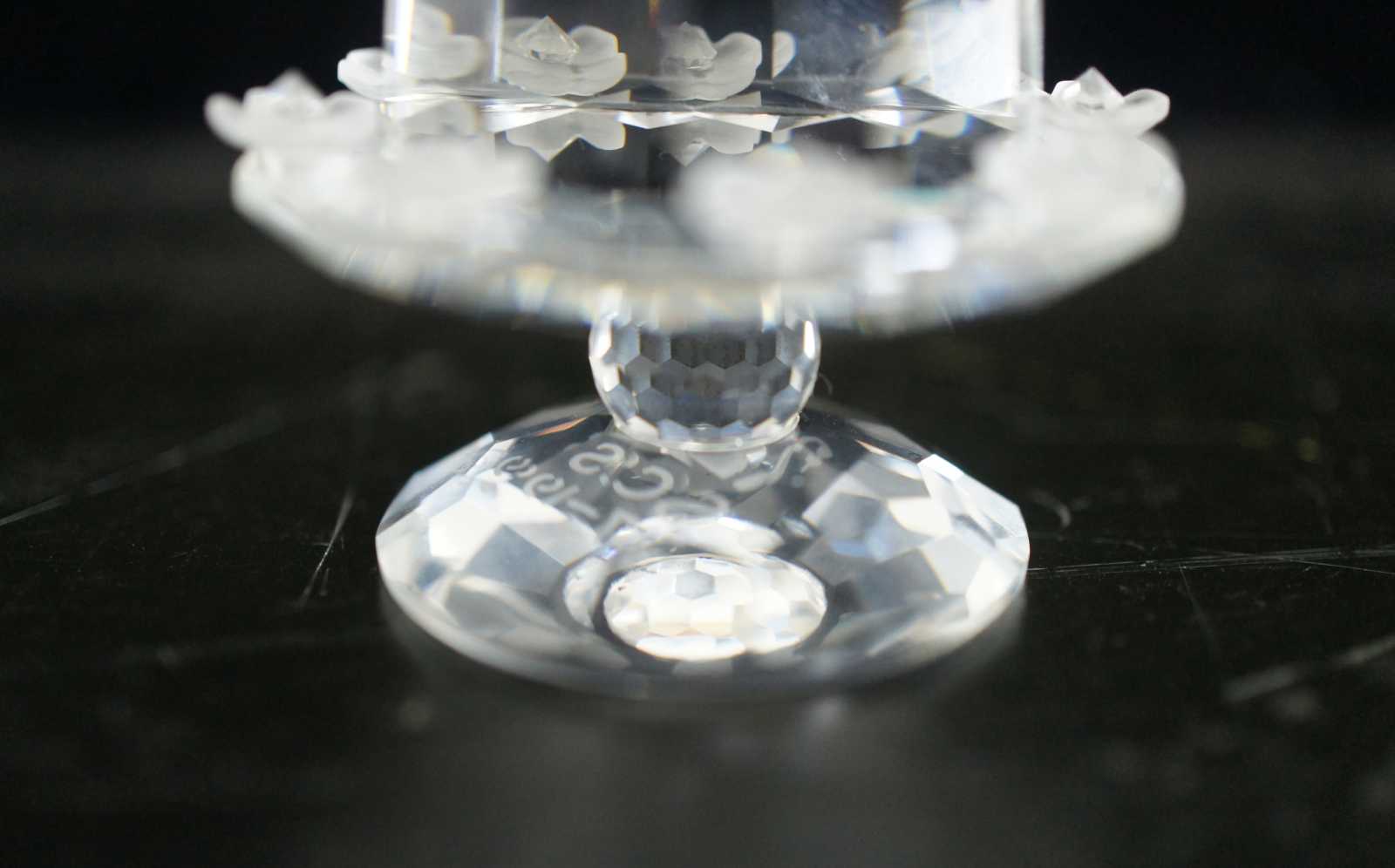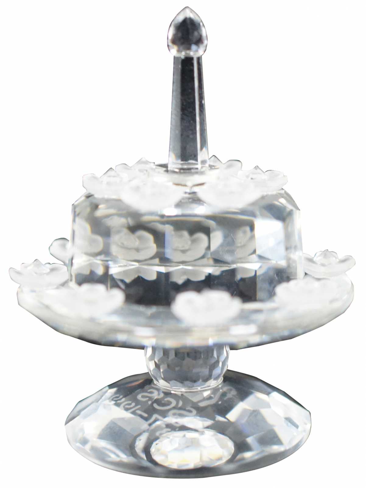 Swarovski SCS 1987-1992 crystal birthday cake figurine featuring flowers on the cake stand and single tier cake with a single candle on top.