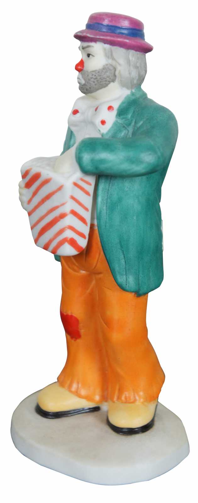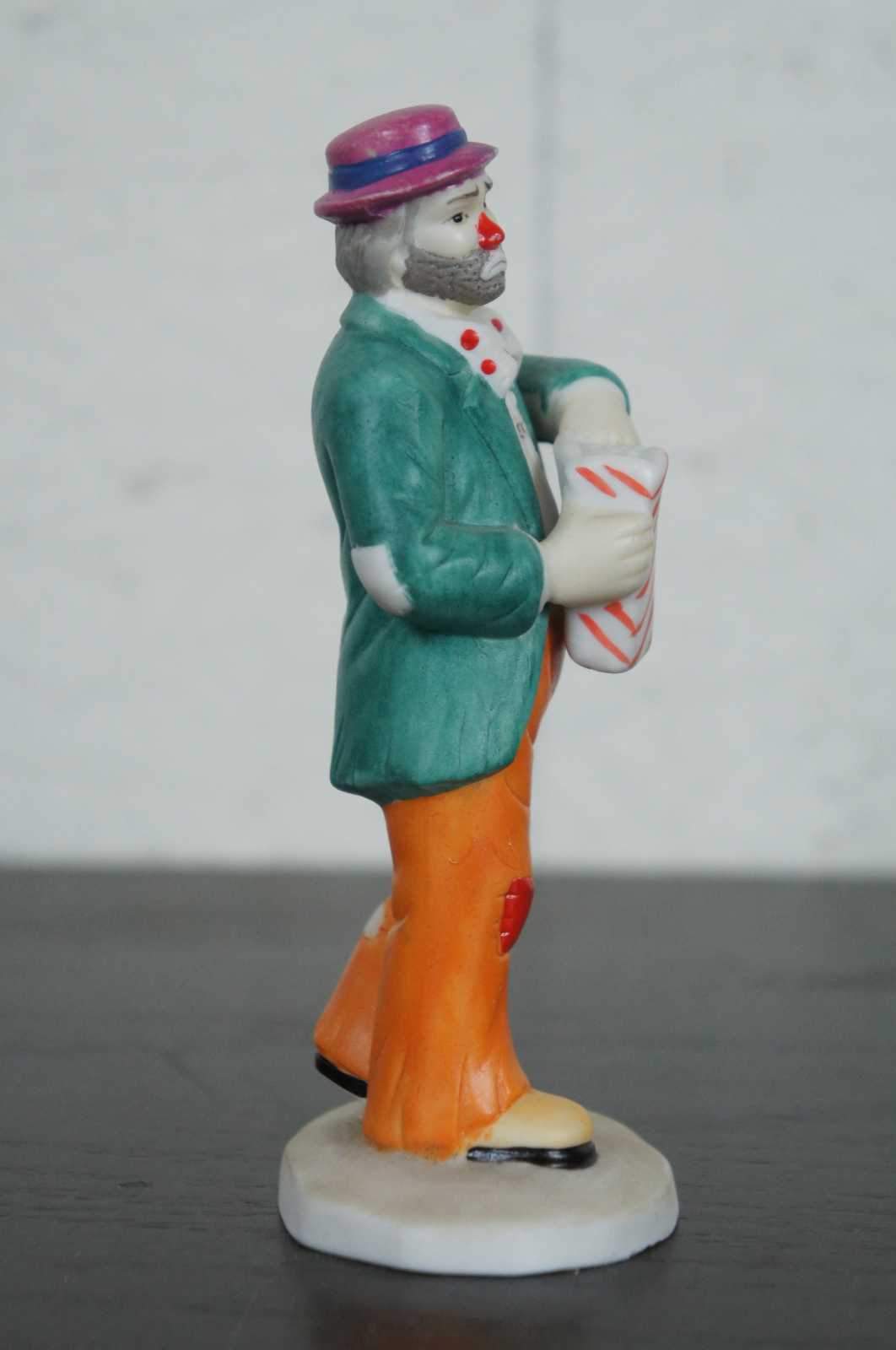 Vintage Flambro porcelain figurine by Emmett Kelly Jr of a hobo clown holding a box of popcorn titled “Popcorn Time.”
