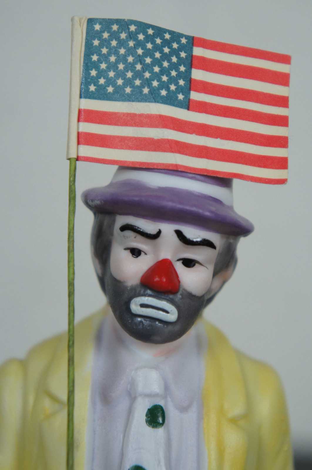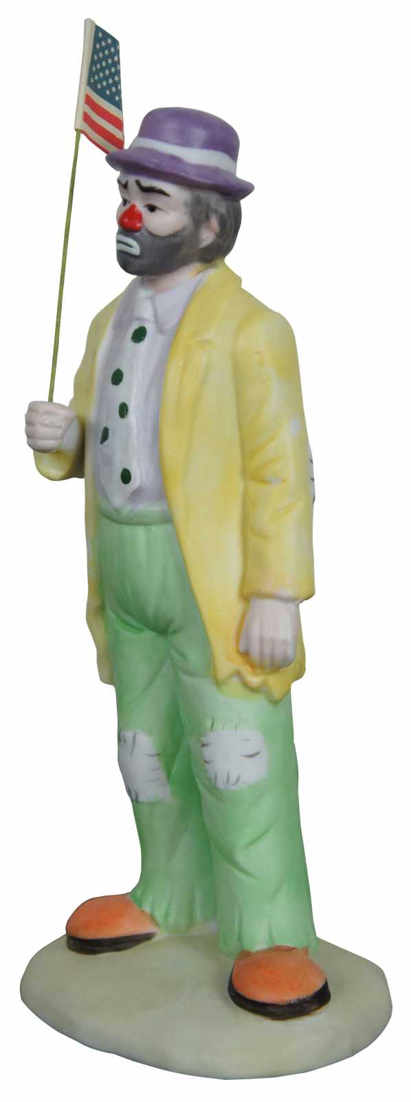 Vintage Flambro porcelain figurine by Emmett Kelly Jr of a hobo clown holding an American flag.