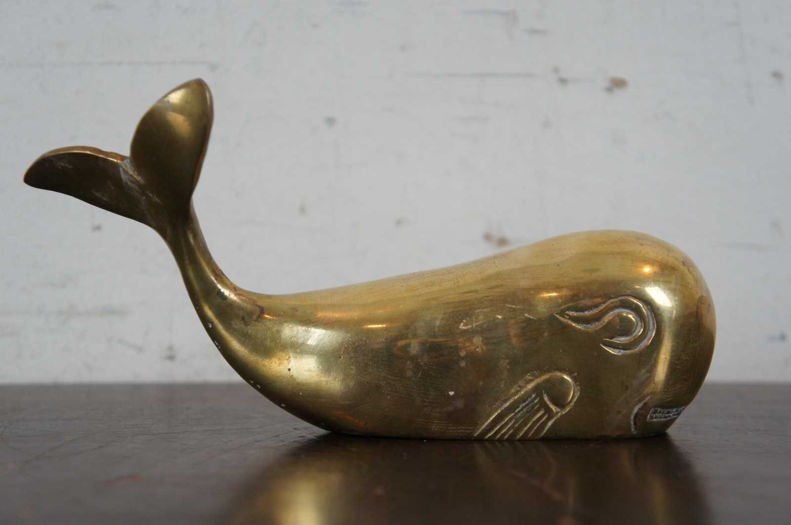 Vintage brass paperweight in the shape of a whale by Penco of New Bradford, Massachusetts.