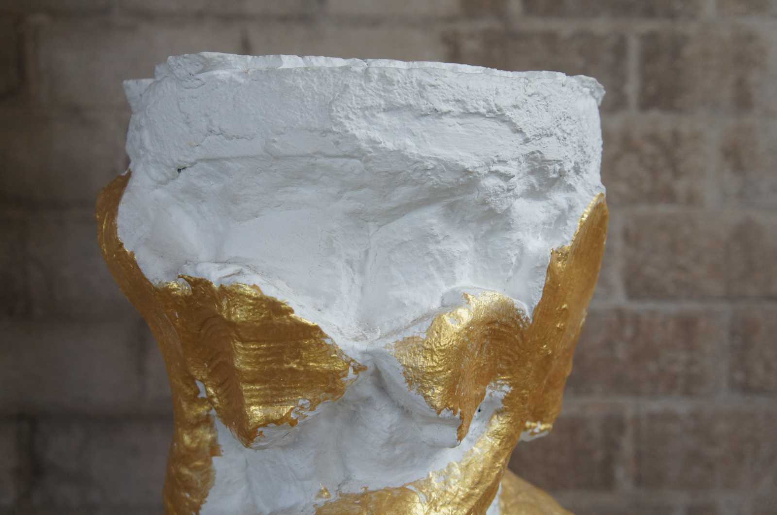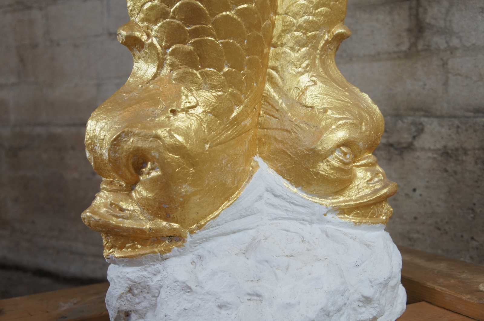 Antique concrete pedestal base. Features three dolphins or delphins painted in gold and white.