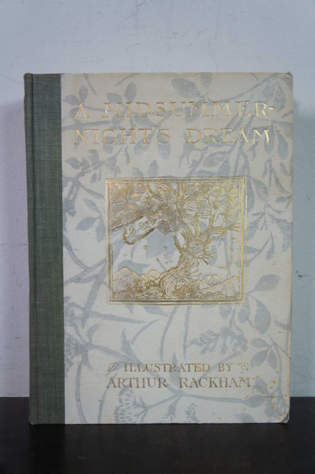 Antique hard cloth cover copy with slipcover box of “A Midsummer-Night’s Dream” by William Shakespeare with illustrations by Arthur Rackham, produced by William Heinemann, London and Doubleday, Page & Co, New York, 1908. First Trade Edition. Contains 40 color plates mounted on tan paper with captioned tissue-guards, plus in-text illustrations.