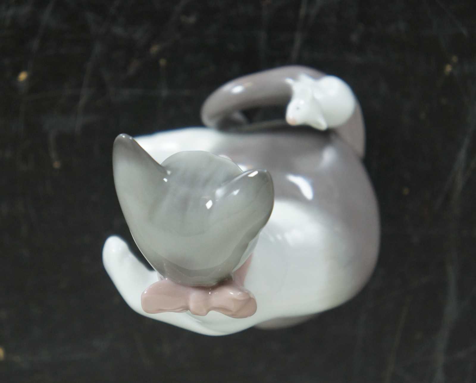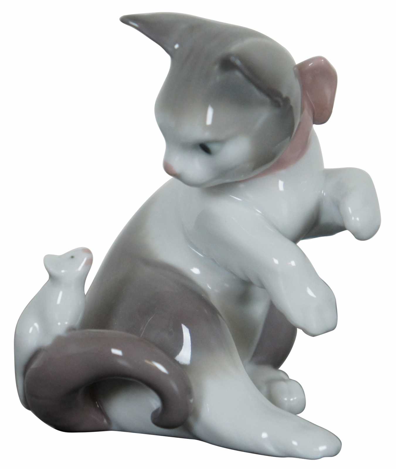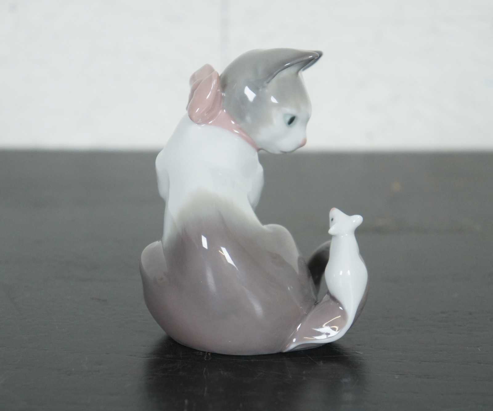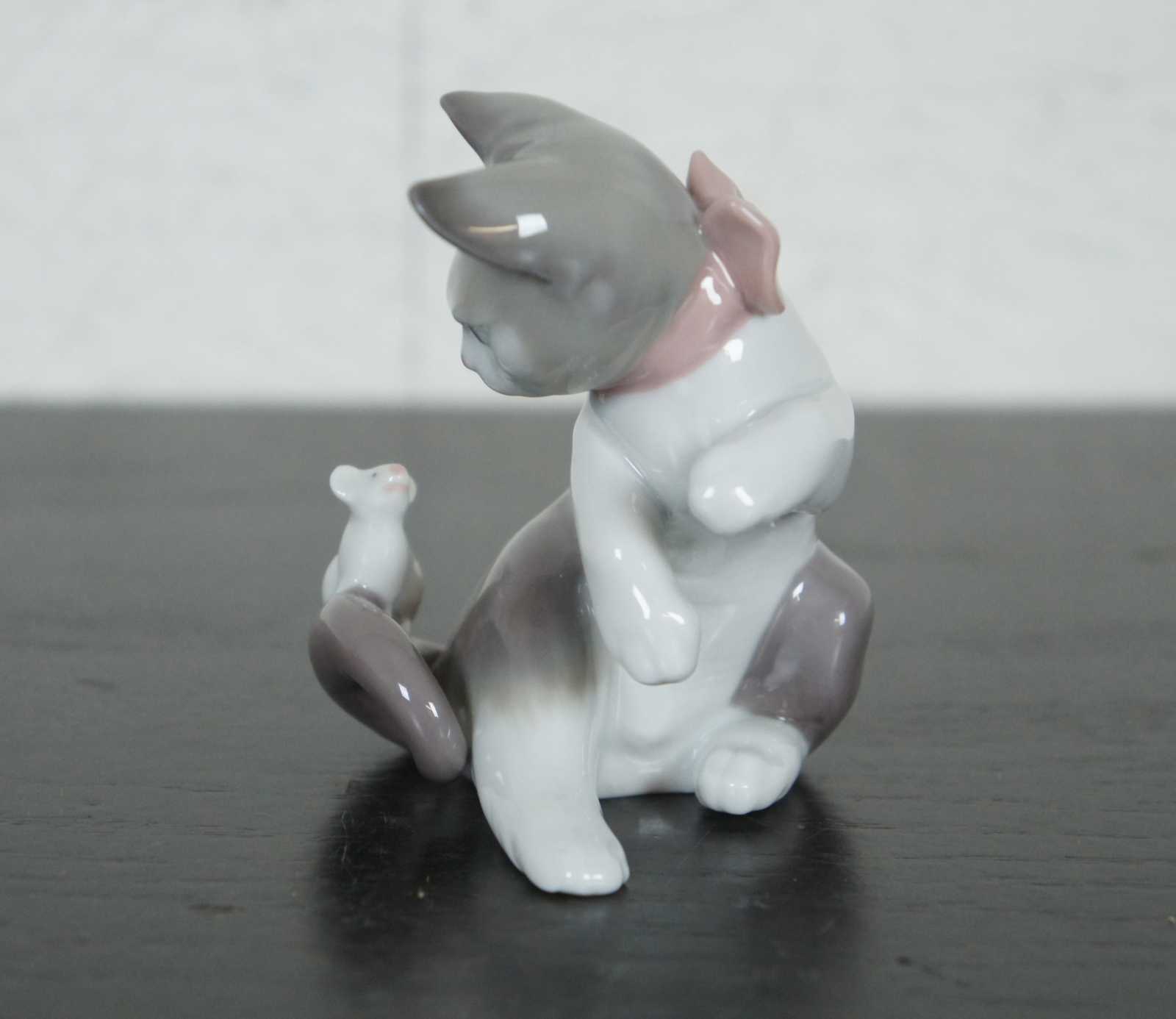 Lladro Spain porcelain figurine #5236 – Cat and Mouse, featuring a brown and white cat with pink bow and a white mouse standing on its tail.