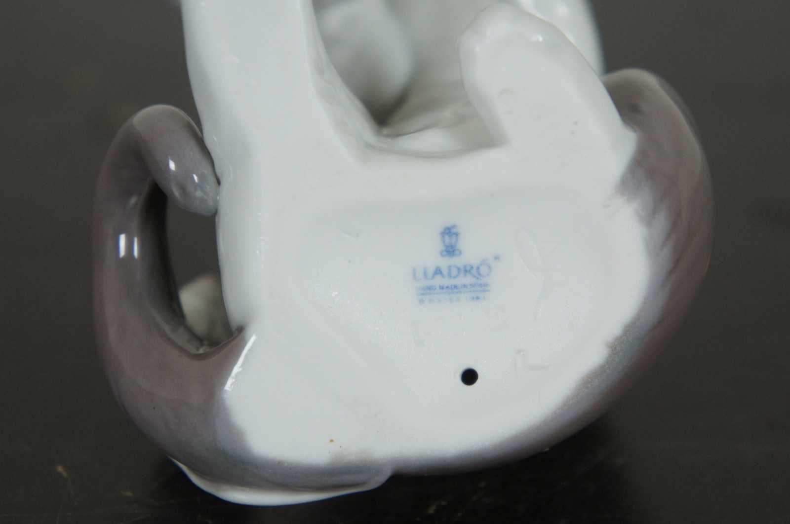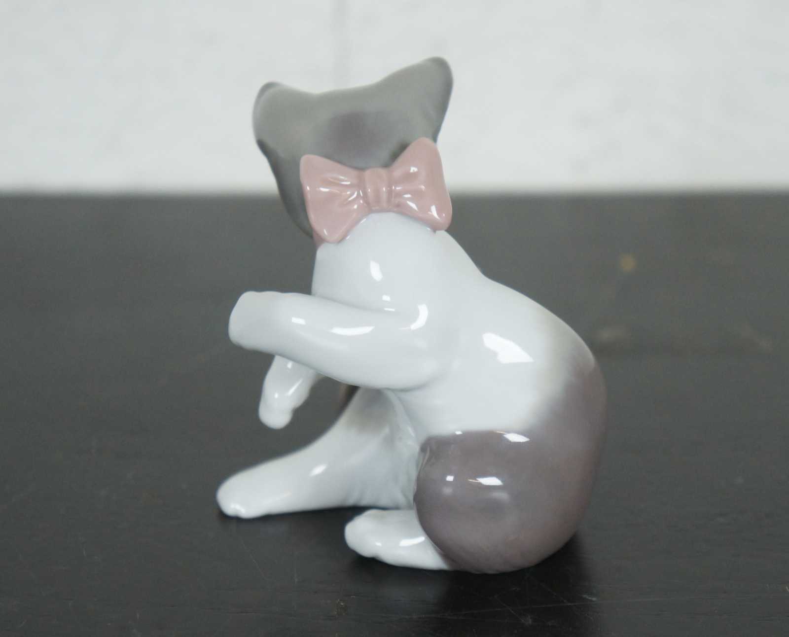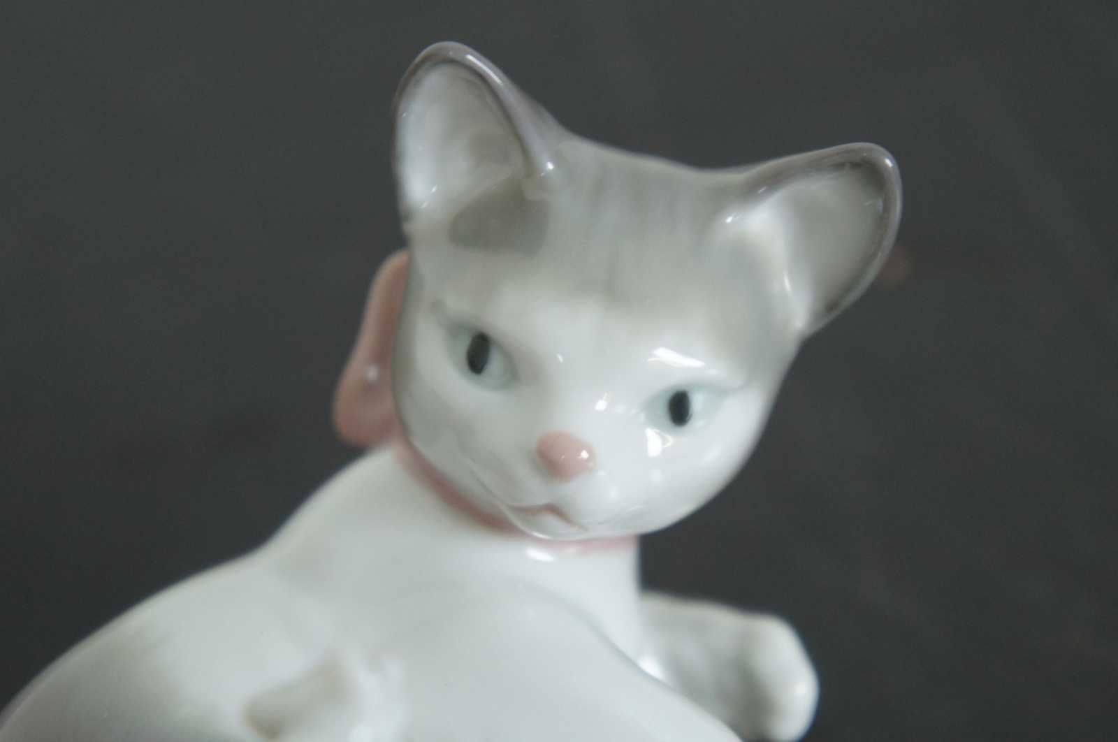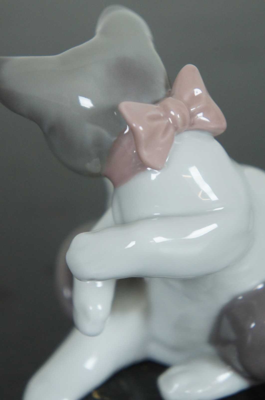 Lladro Spain porcelain figurine #5236 – Cat and Mouse, featuring a brown and white cat with pink bow and a white mouse standing on its tail.