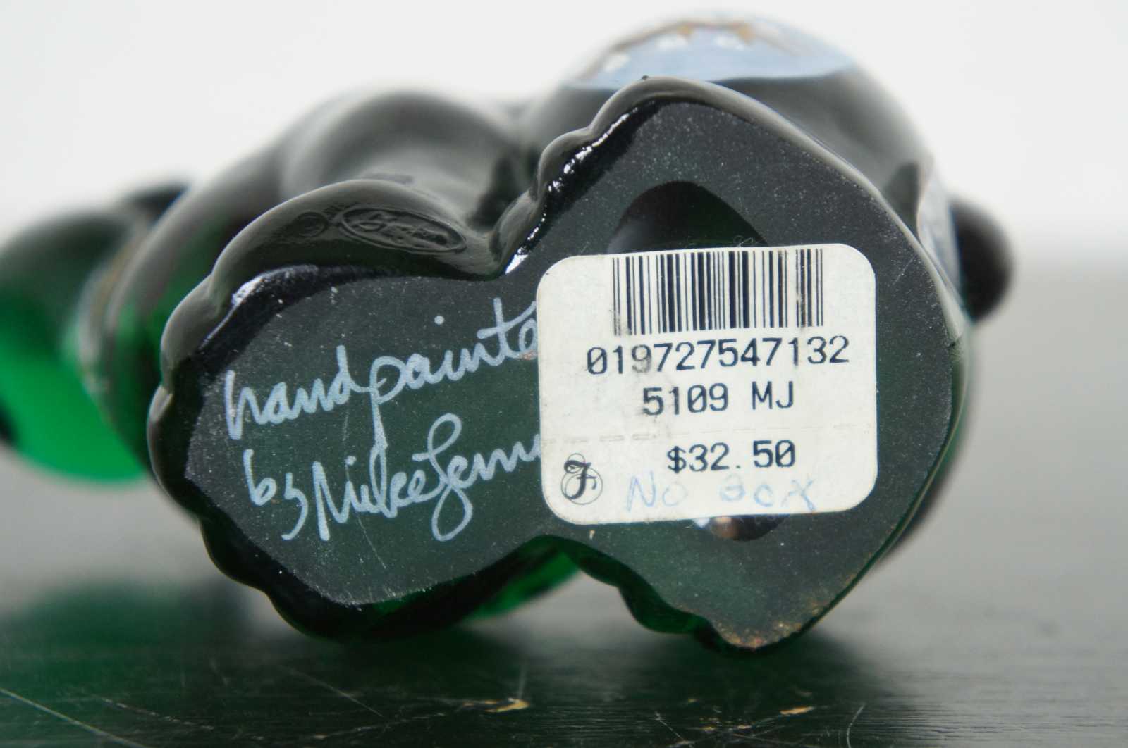 Fenton glass Vermont Skies hand painted Christmas polar bear figurine with gold holly wreath collar and pine forest / winter landscape on rump.