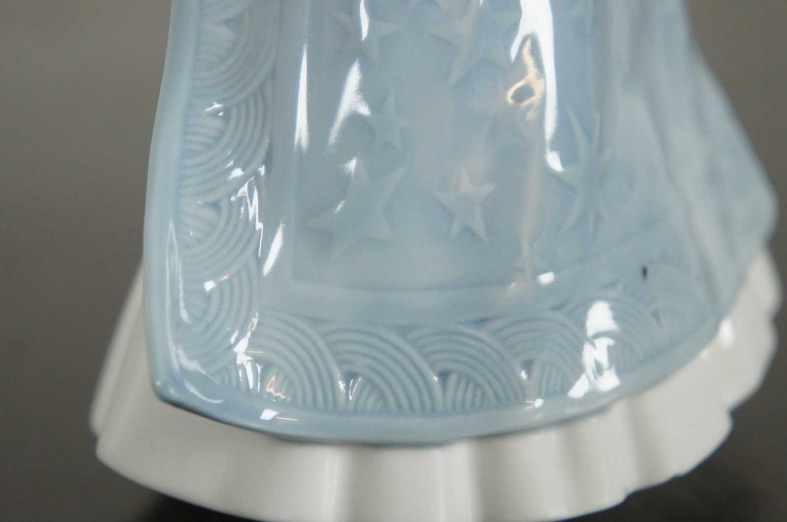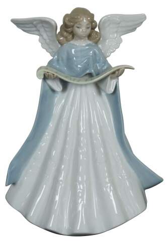 Lladro Spain porcelain figurine #5831, Christmas angel tree topper holding a scroll of music and wearing a blue mantle.