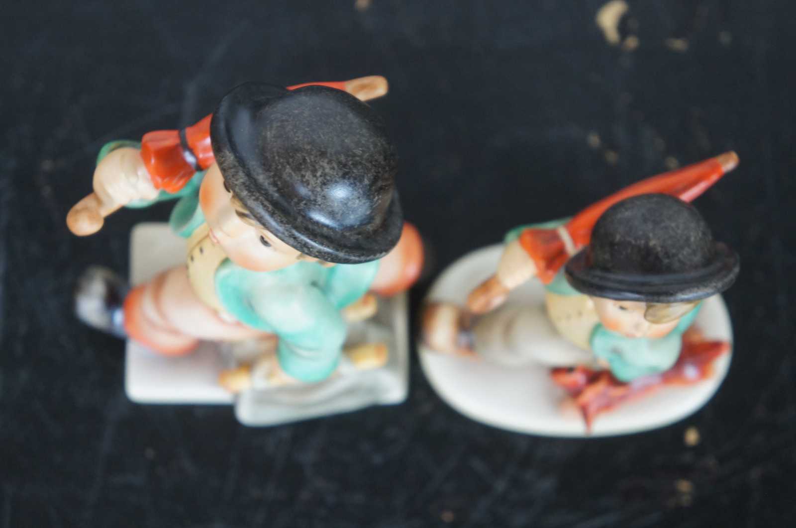 Goebel West Germany 1984 ceramic figurine pair, Merry Wanderer and strolling Along, both signed and dated by the artist, photographed while painting another figure with his signed Merry Wanderer in the foreground (photo included).