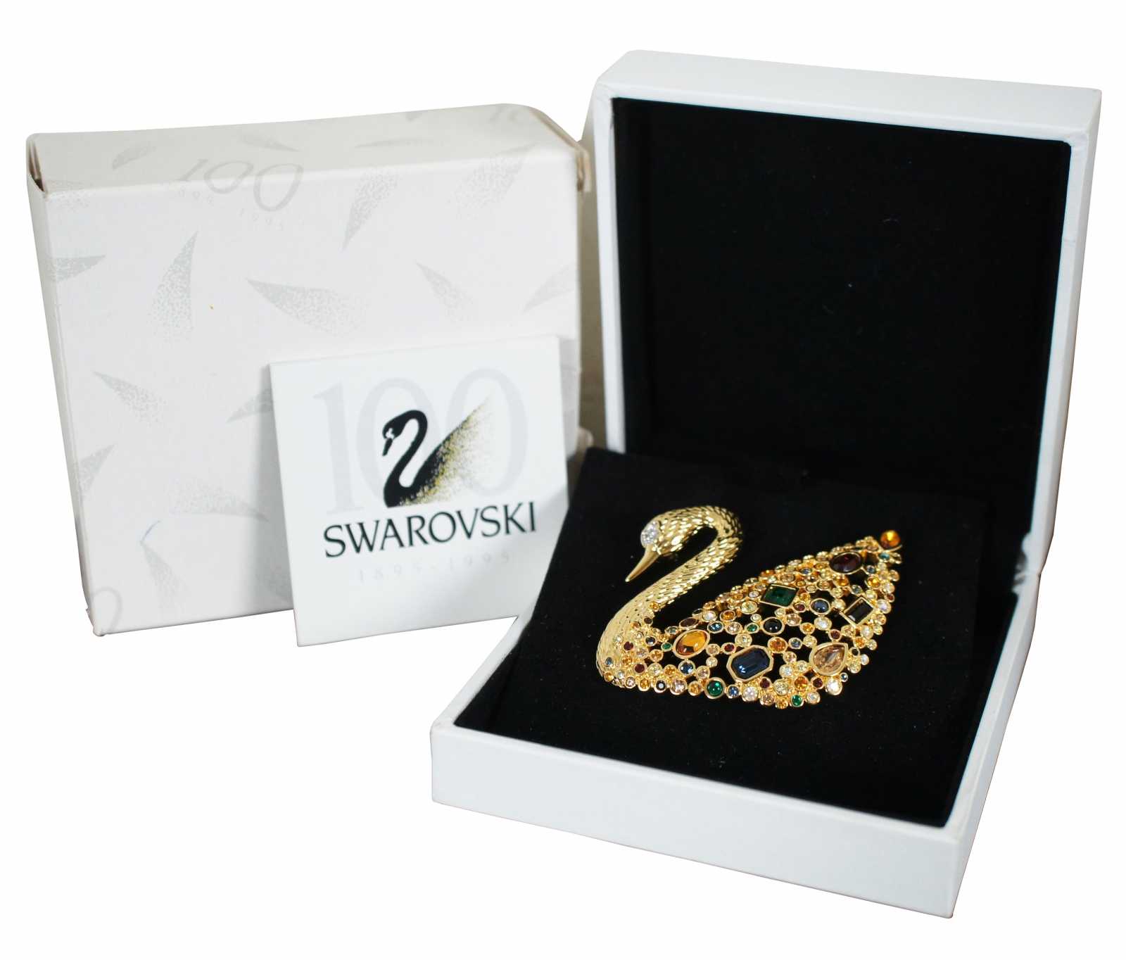 1995 Swarovski Collector’s Society exclusive Centenary Swan Brooch – Gold tone swan with feathered pattern on the neck embellished with an array of colored and shaped crystals.. Includes original certificate and box.