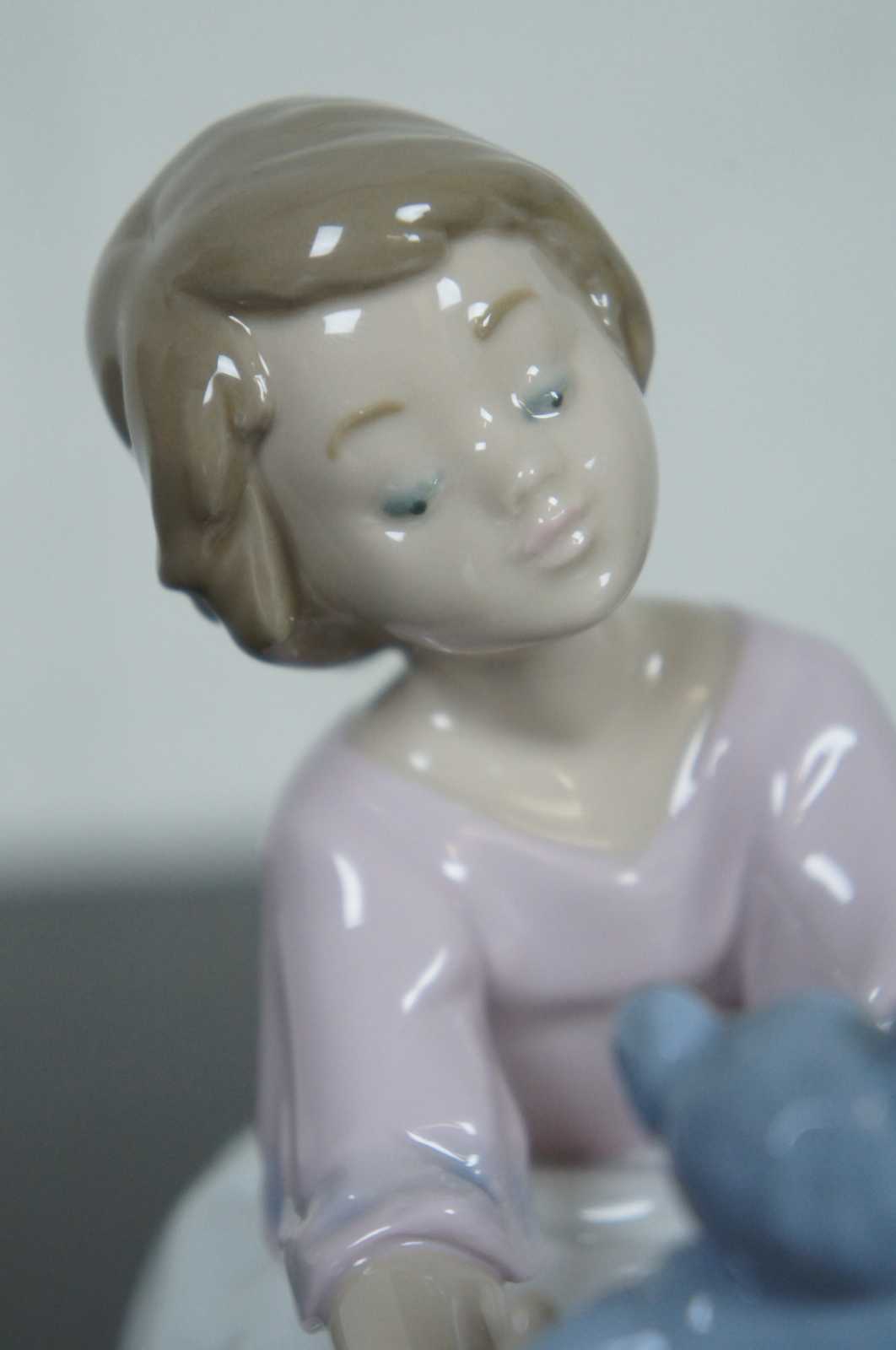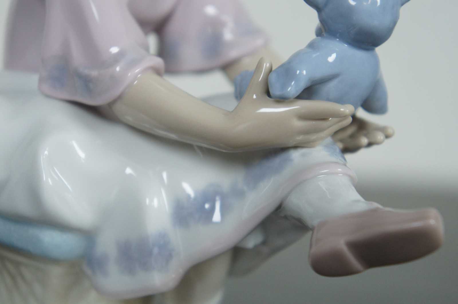 Lladro Spain 1993 porcelain figurine #7620 – Best Friend – portraying a girl in a pink top and floral skirt holding out a blue teddy bear.