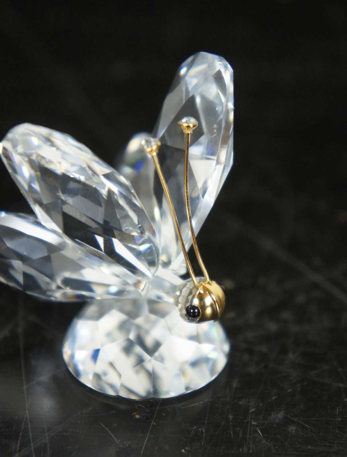 Swarovski crystal figurine of a butterfly perched on a round base with gold Rhodium plated antennae and black eyes with crystal tipped antennae. 7639NR55. 010002.
