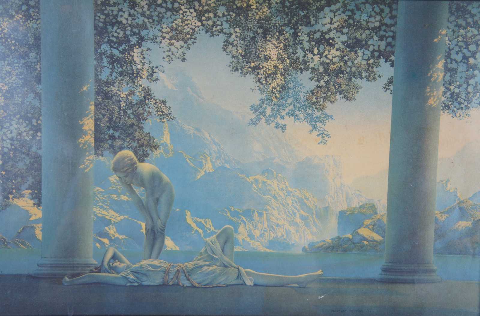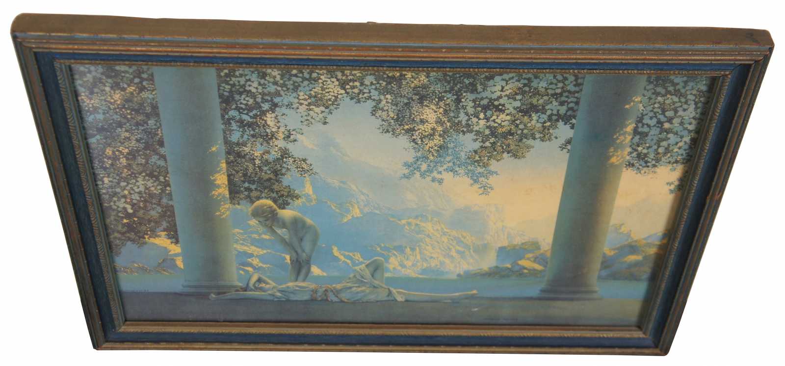 Antique framed lithograph print by Maxfield Parrish and produced by the House of Art New York, titled Daybreak and featuring two neoclassical figures in a colonnade.