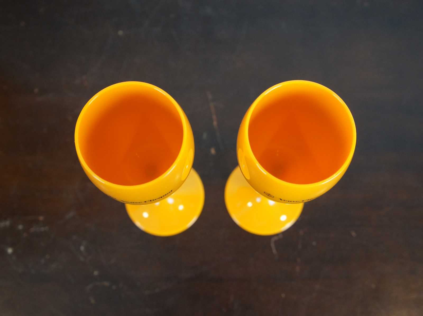 Orange acrylic Veuve Clicquot Champagne bottle chilling ice bucket and two wine glasses.