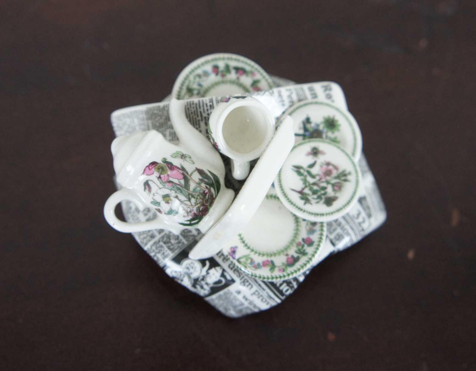 This is a charming mini teapot designed by Paul Cardew for Portmeirion's timeless Botanic Garden Collection. This teapot is titled "moving day" and is in the form of a moving crate with newspaper packing and tea set pieces on the top.