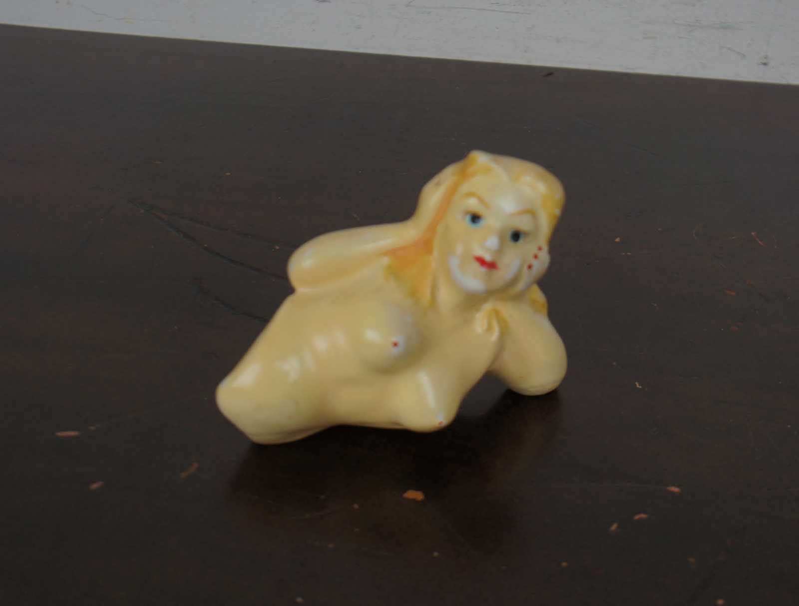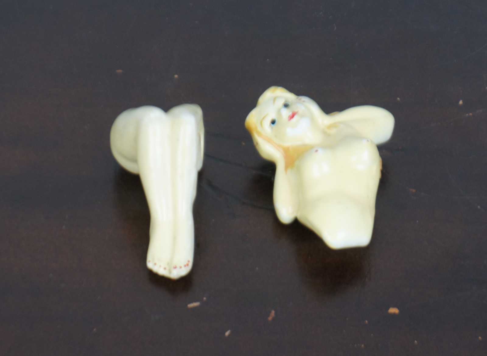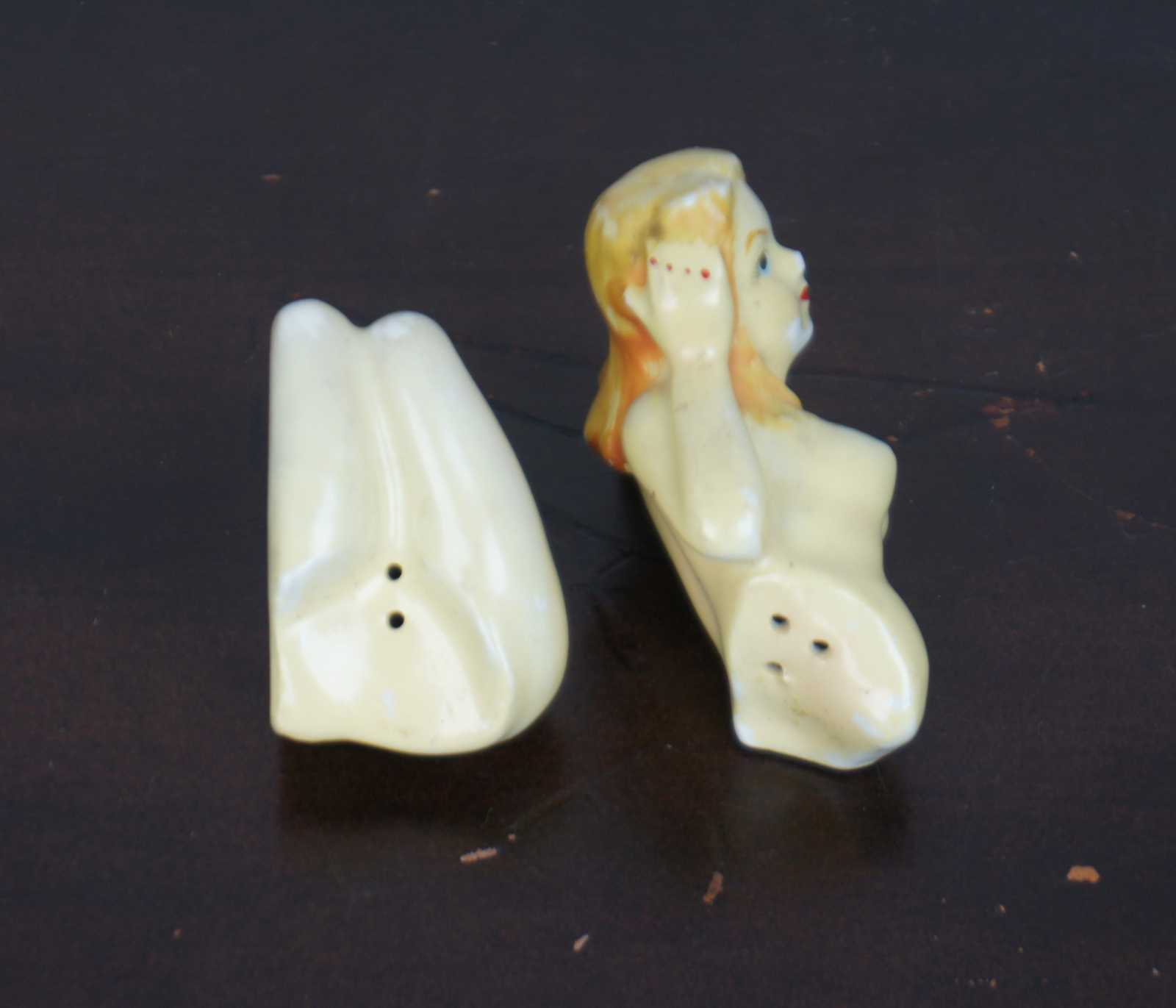 Vintage ceramic salt and pepper shakers in the shape of a nude reclining woman, split at the waist into individual shakers.