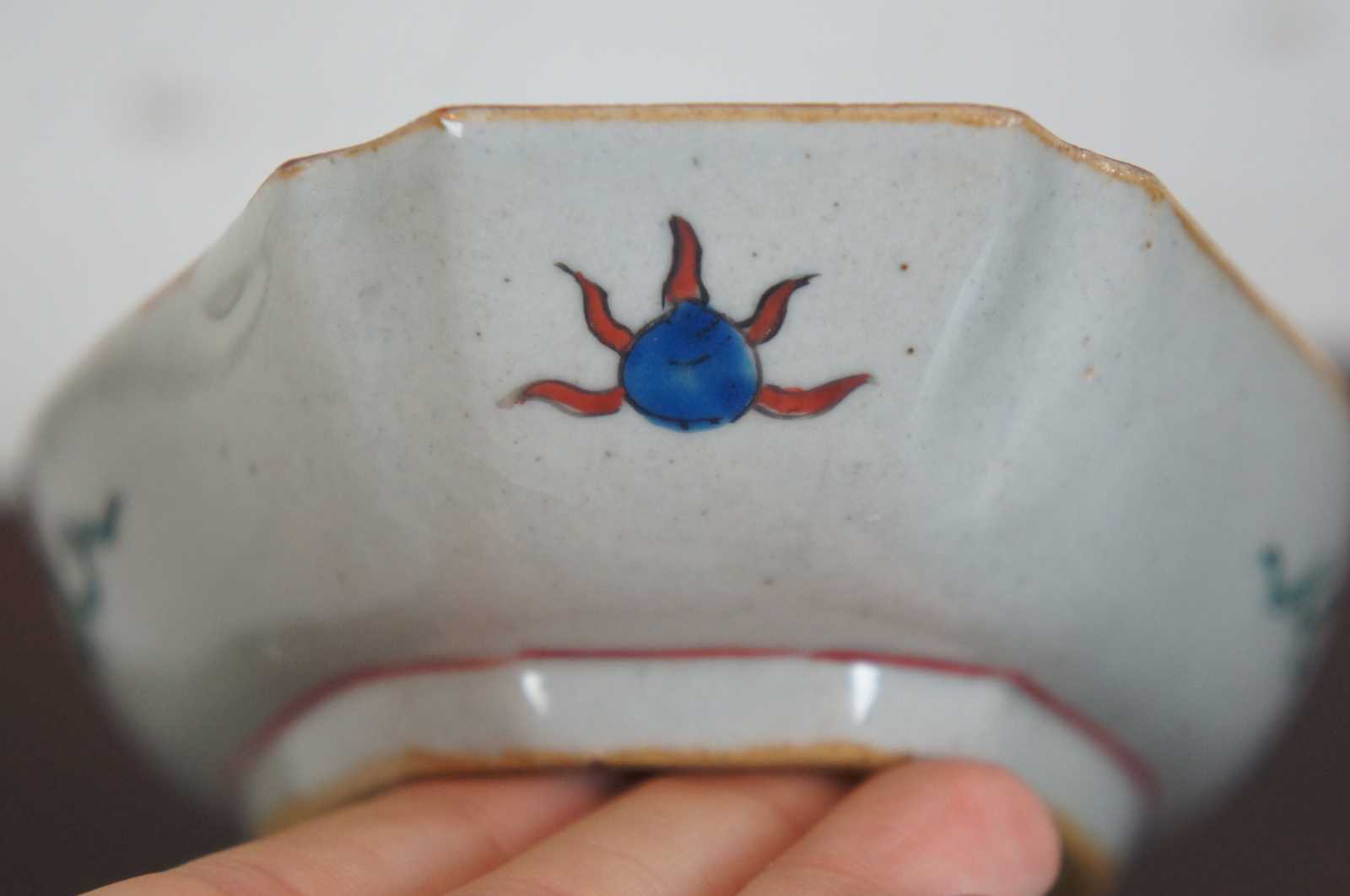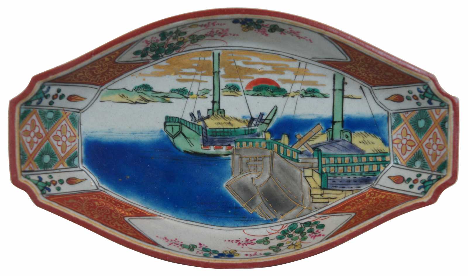 Vintage Japanese Satsuma style hand painted porcelain dish showing a sunset water scene of docked boats with thatched roofs.