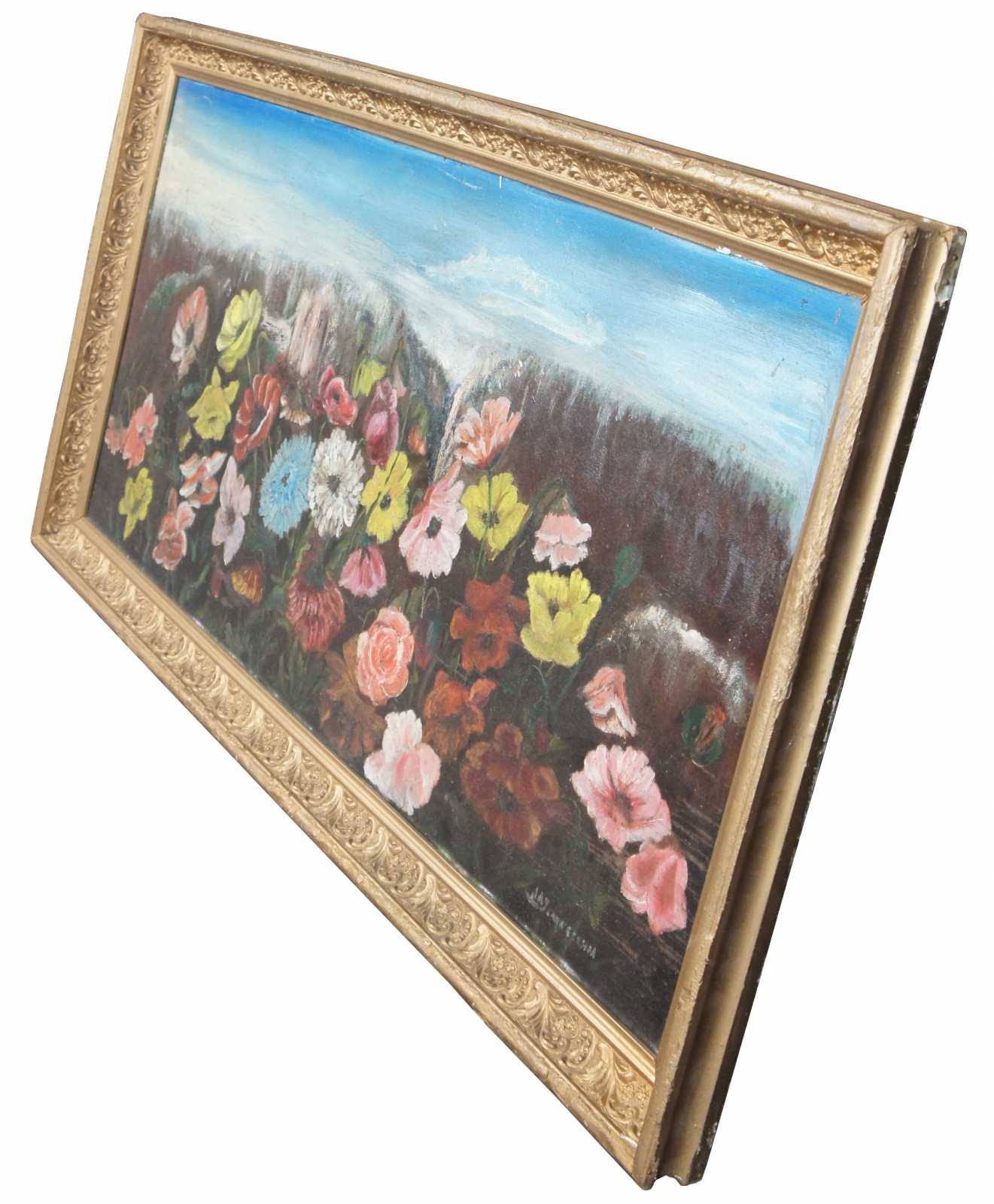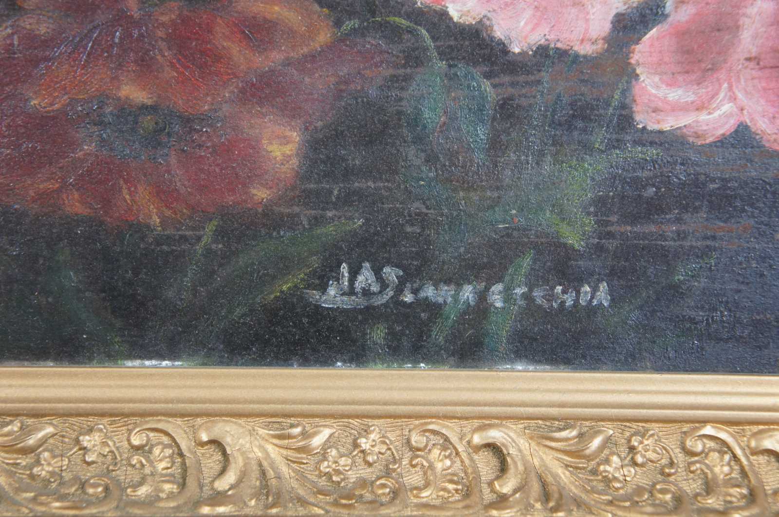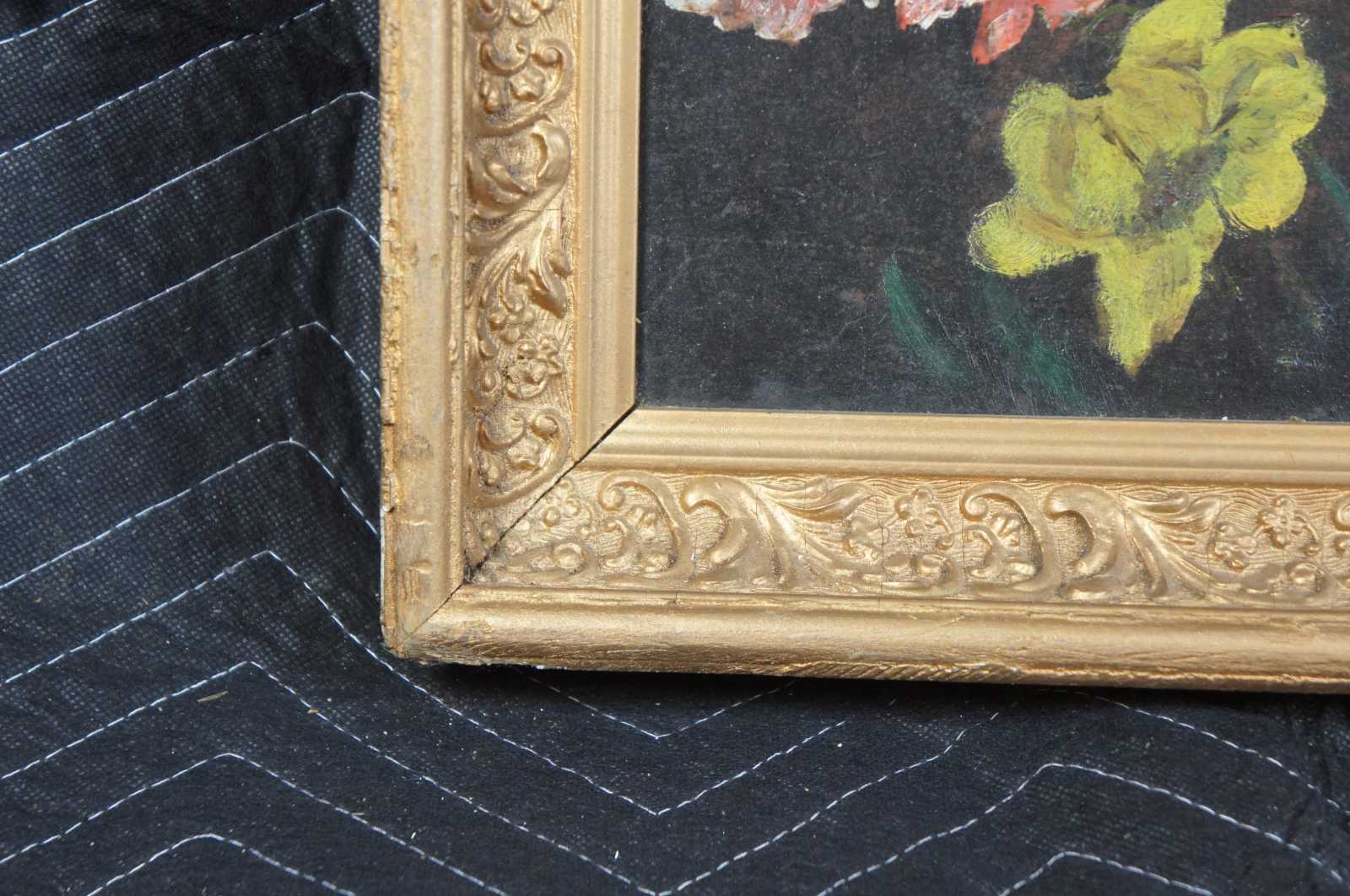 Antique floral oil painting on tin. Features various flowers on large tin canvas, framed in ornate gold.