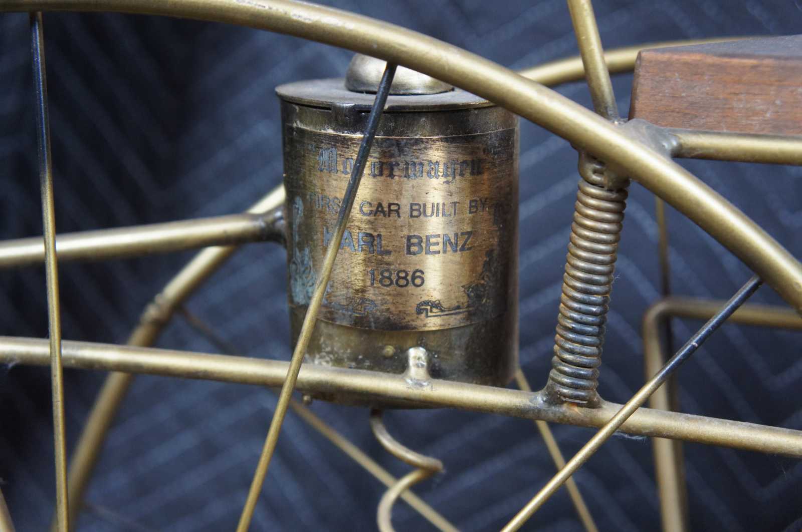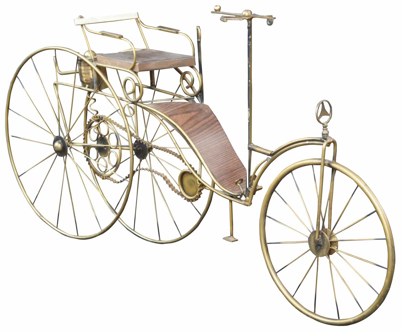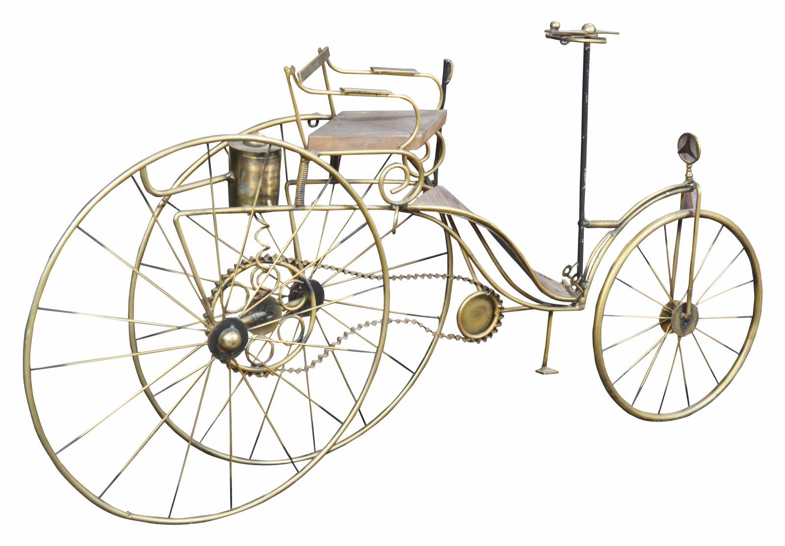Curtis Jere wall sculpture portraying Karl Benz (Mercedes Benz) First Motorwagen that was built in 1886. Signed along the wheel, 1986. Made from brass with wood grain accents.