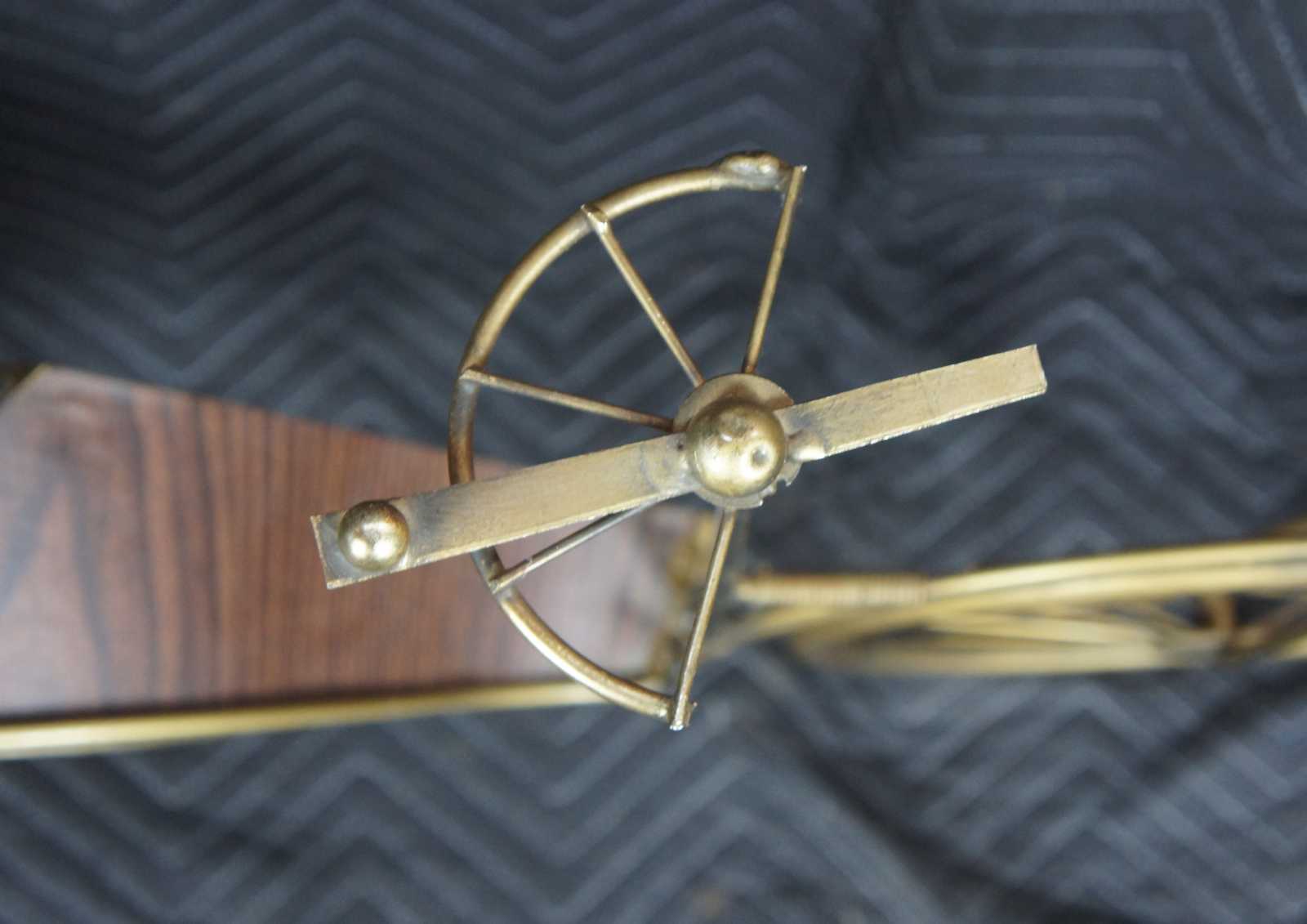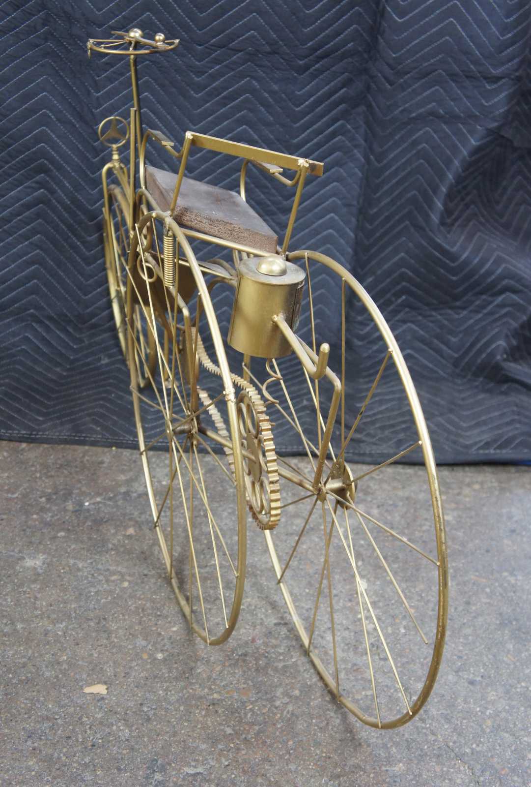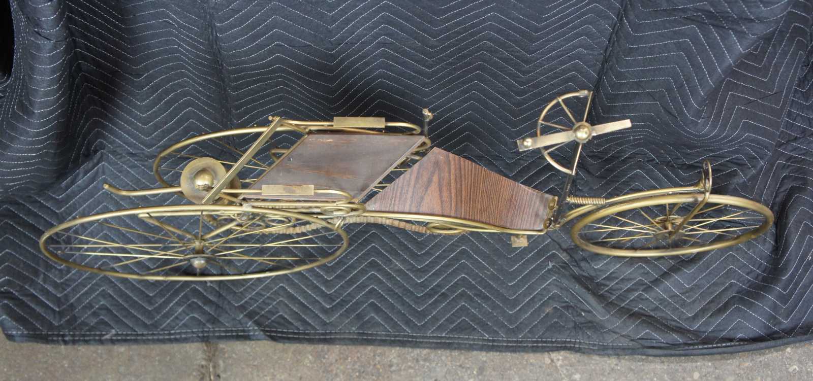 Curtis Jere wall sculpture portraying Karl Benz (Mercedes Benz) First Motorwagen that was built in 1886. Signed along the wheel, 1986. Made from brass with wood grain accents.