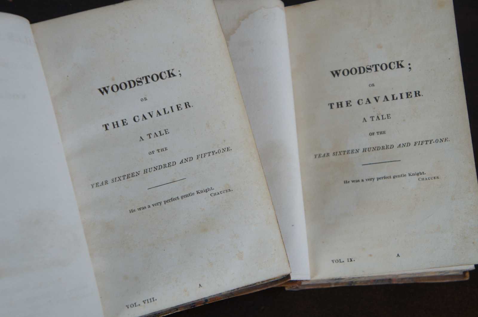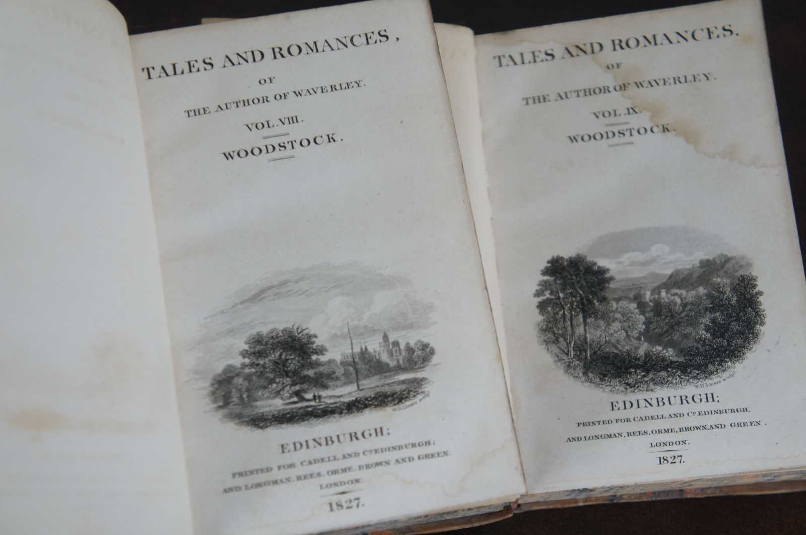 Two antique brown leather bound Sir Walter Scott Waverly Novels – Tales and Romances of the Author of Waverly, Volume VIII and IX – Woodstock: or The Cavalier, A Tale of the Year 1651. Printed in Edinburgh for Cadell and Company (Edinburgh) and Longman, Rees, Orme, Brown and Green (London) by Ballantyne and Company, 1827. Edinburgh, London.