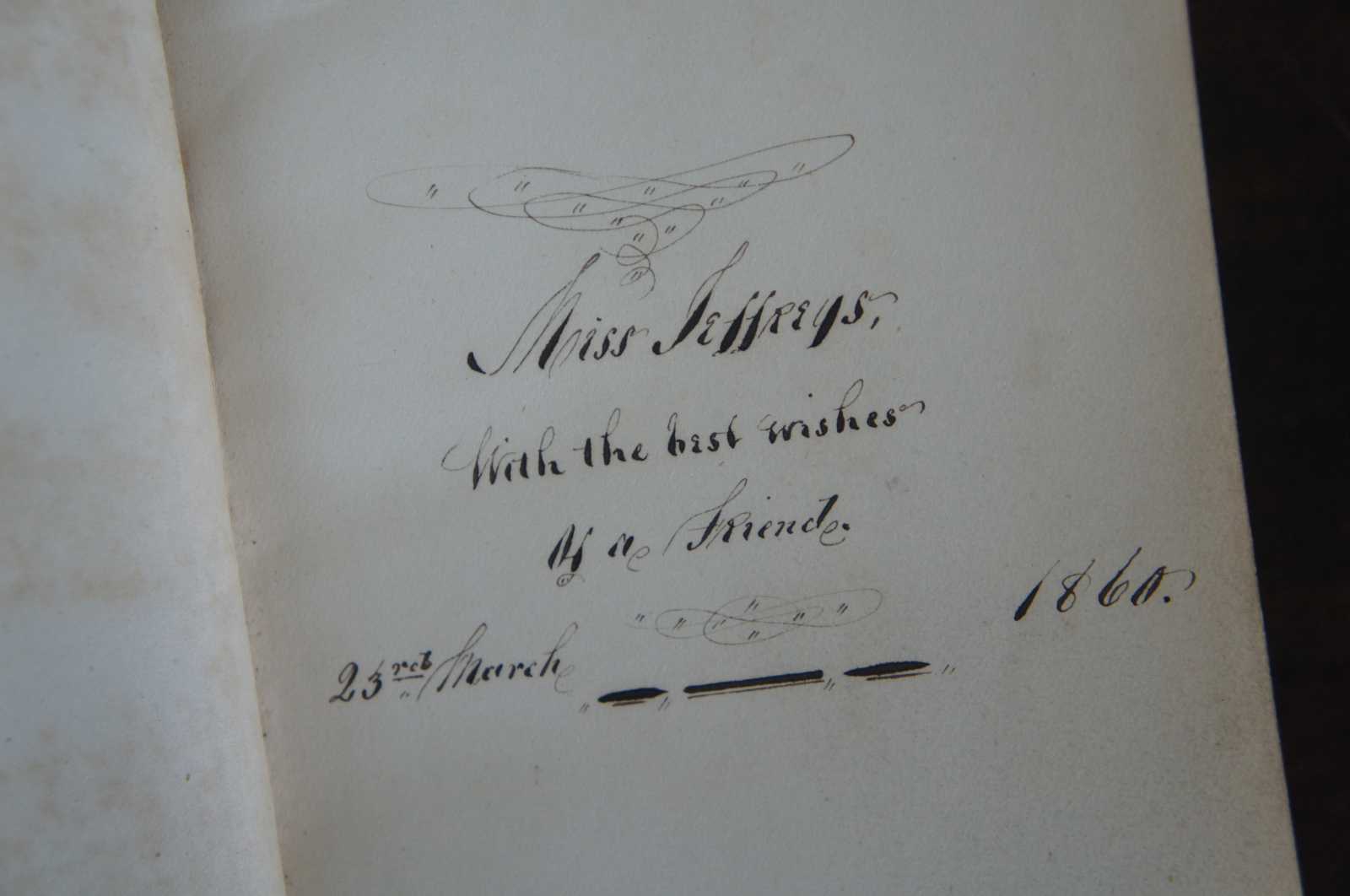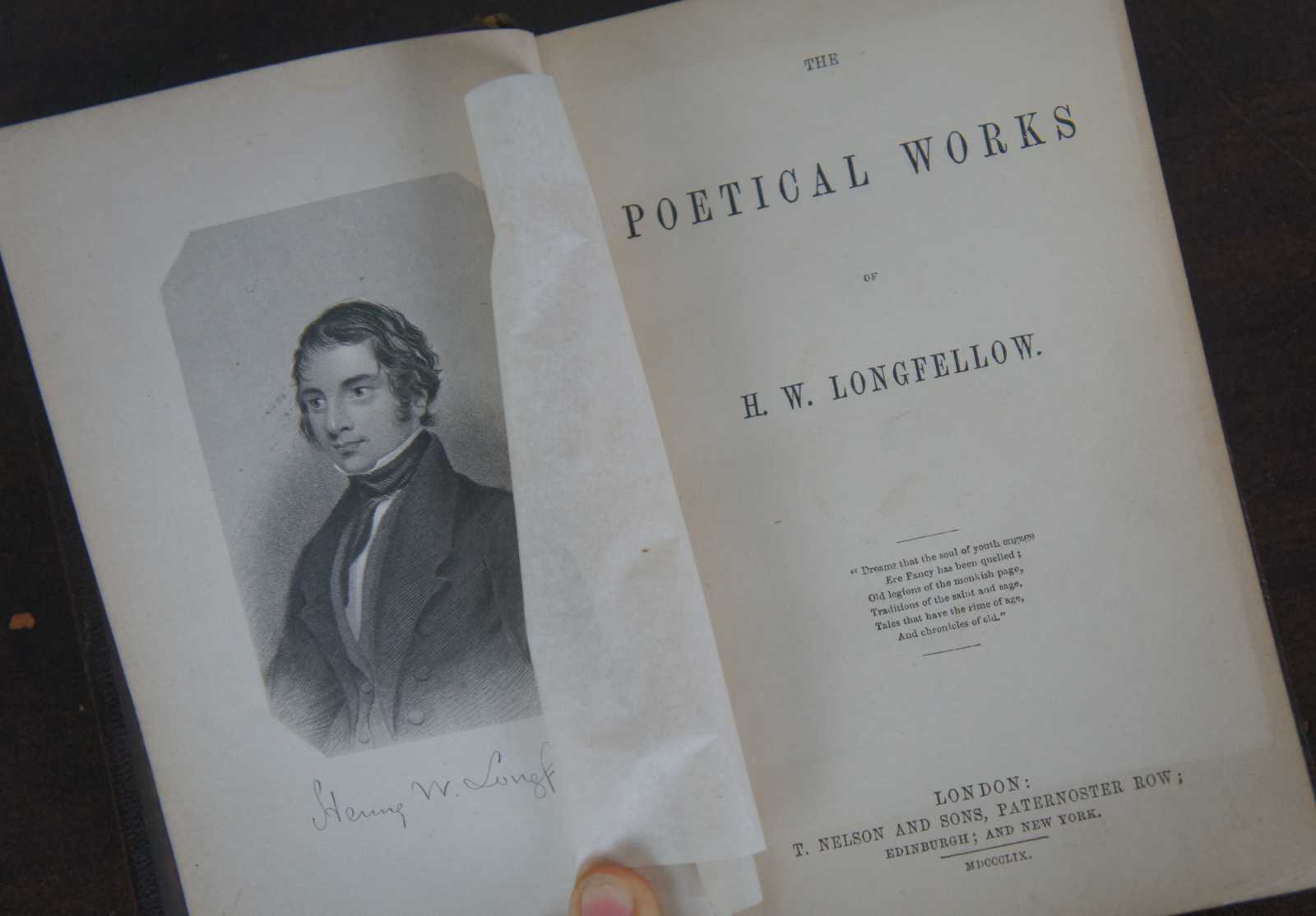 Antique embossed leather bound copy of the Poetical Works of Henry Wadsworth Longfellow, published by T. Nelson & Sons, London in 1859. Complete with illustrations and a hand signed note from 1860.