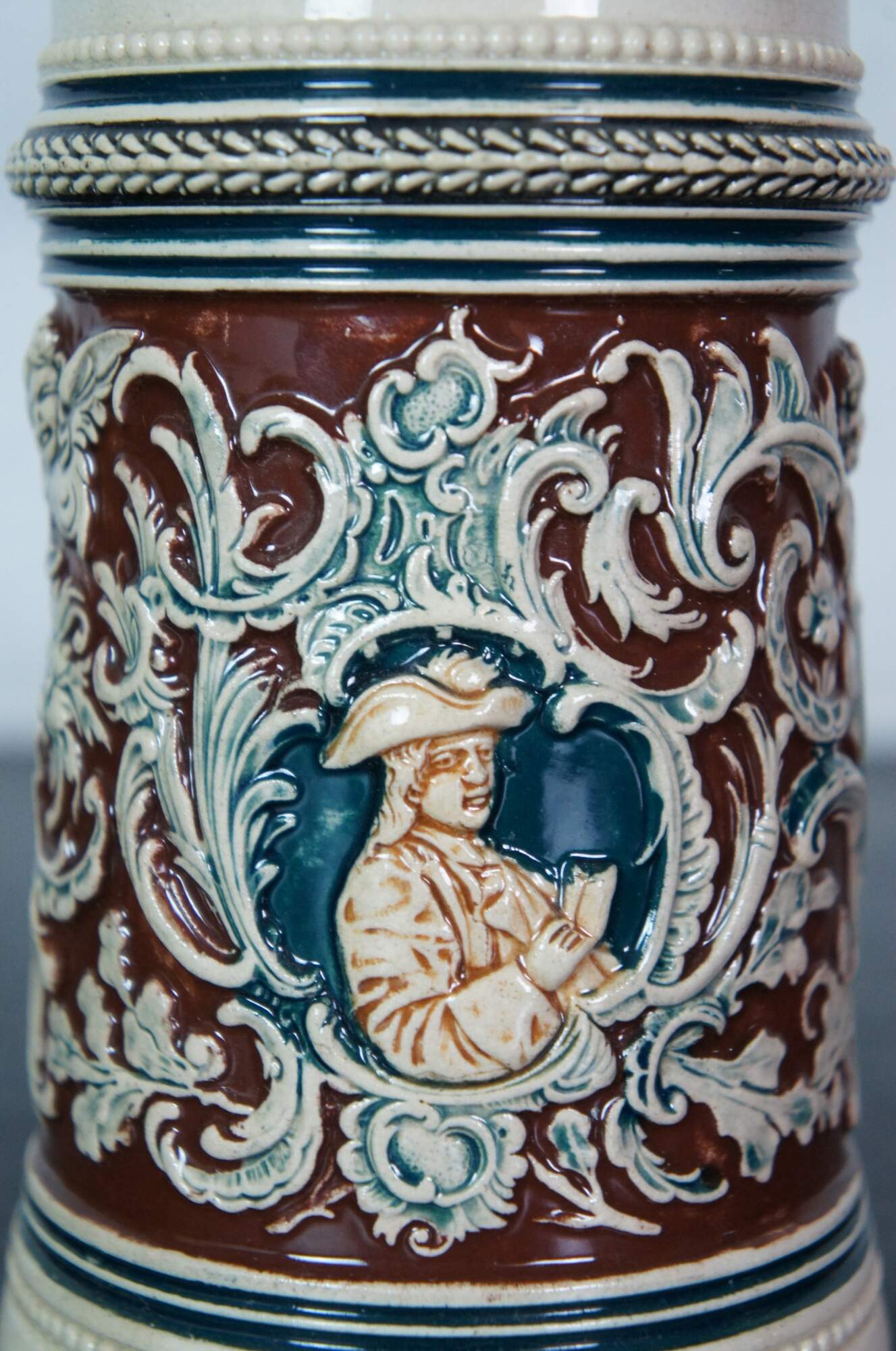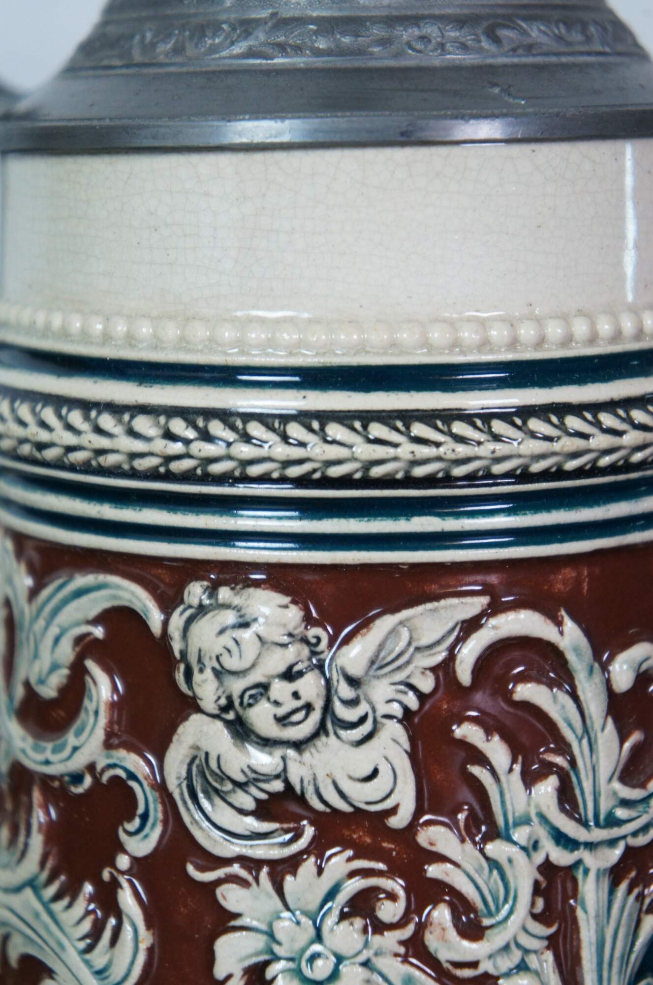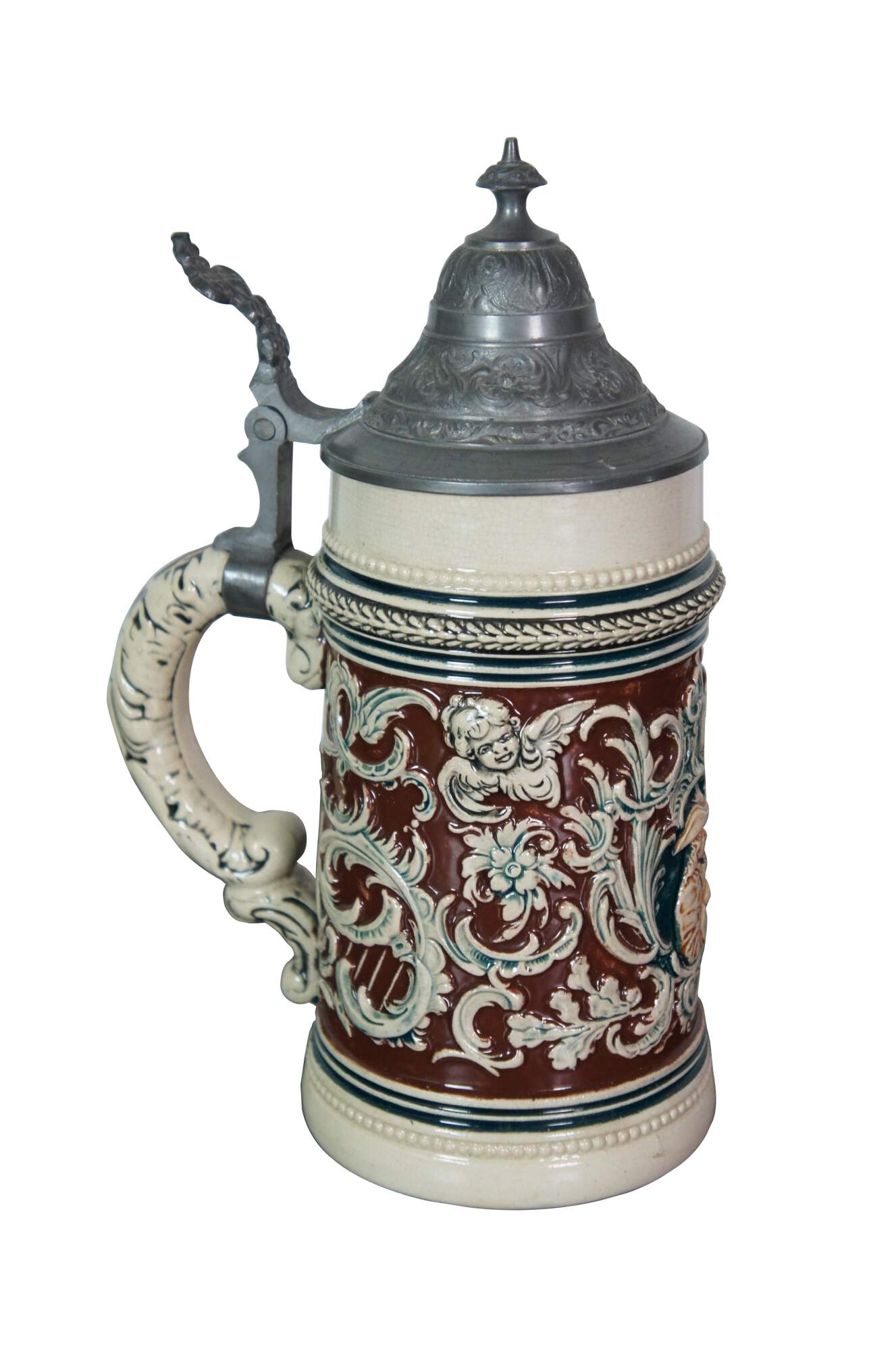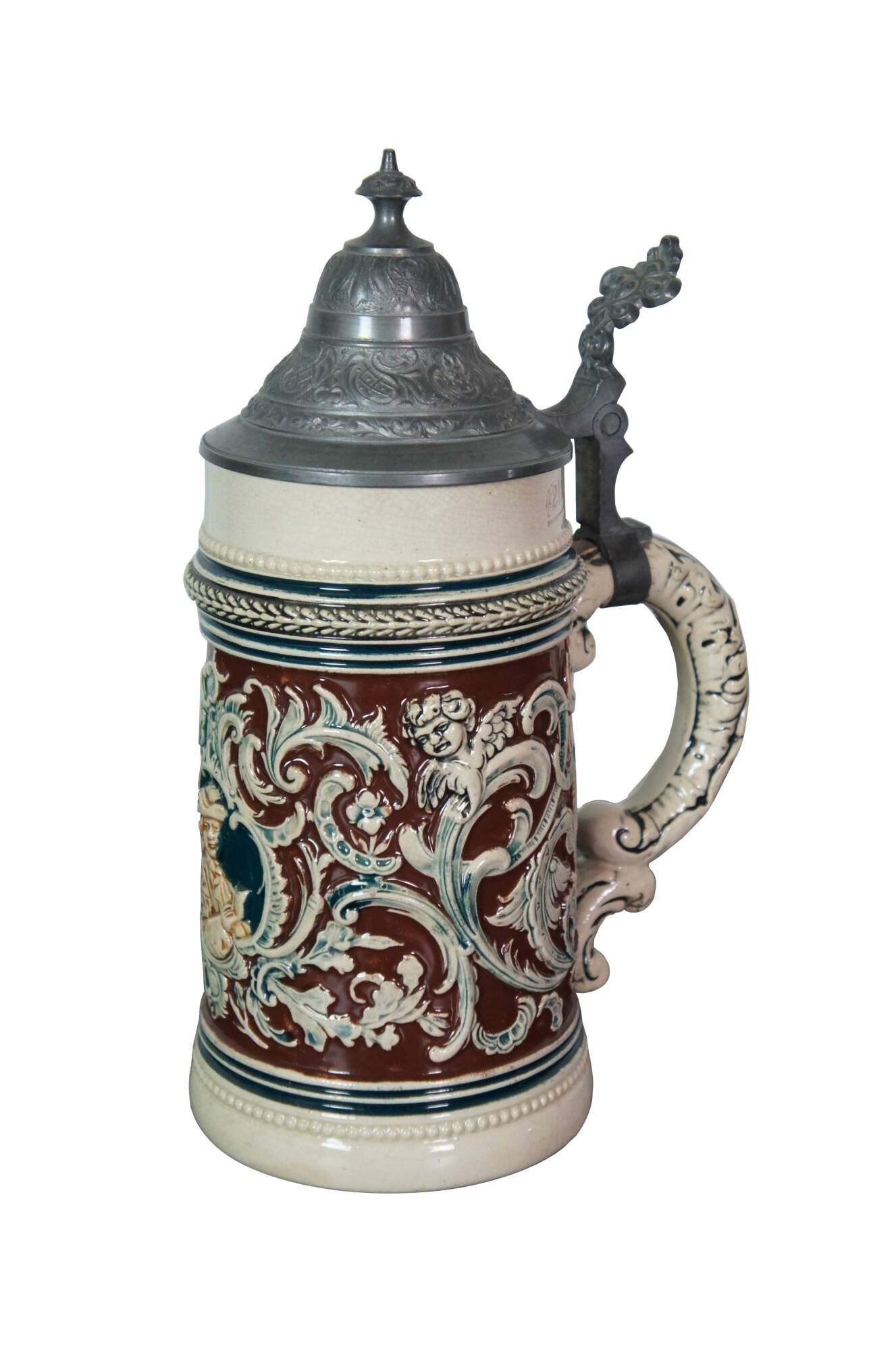 Early to mid 20th century German beer stein / tankard - cream colored stoneware glazed in red and green, featuring a scrolling foliate and floral design with winged cherubs flanking the portrait of an 18th century Colonial gentleman in a tricorn hat. Stamped tin flip top lid. Marked 416 on side and base.