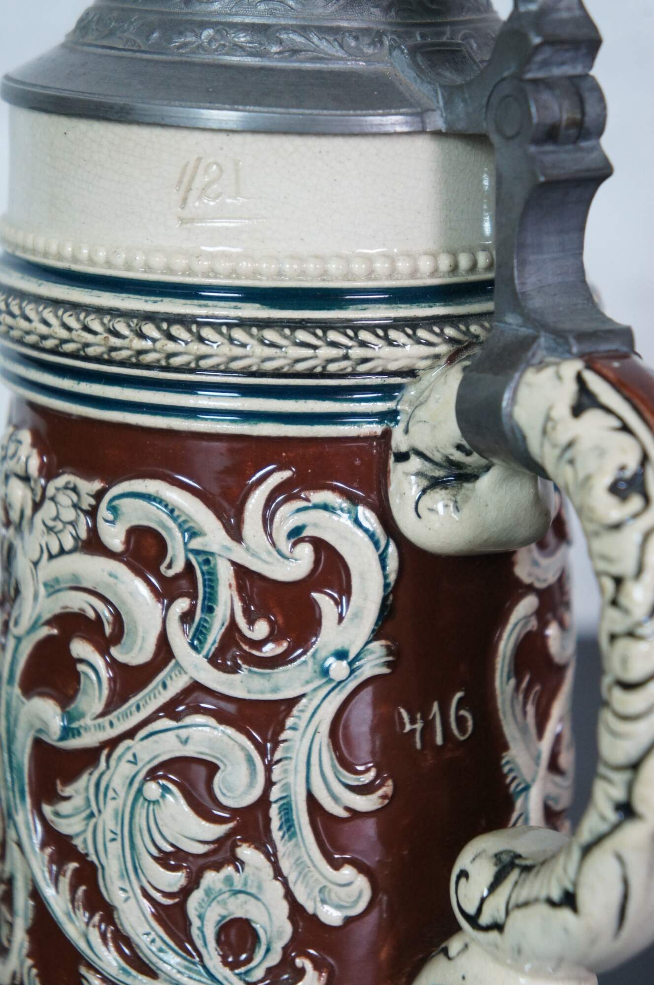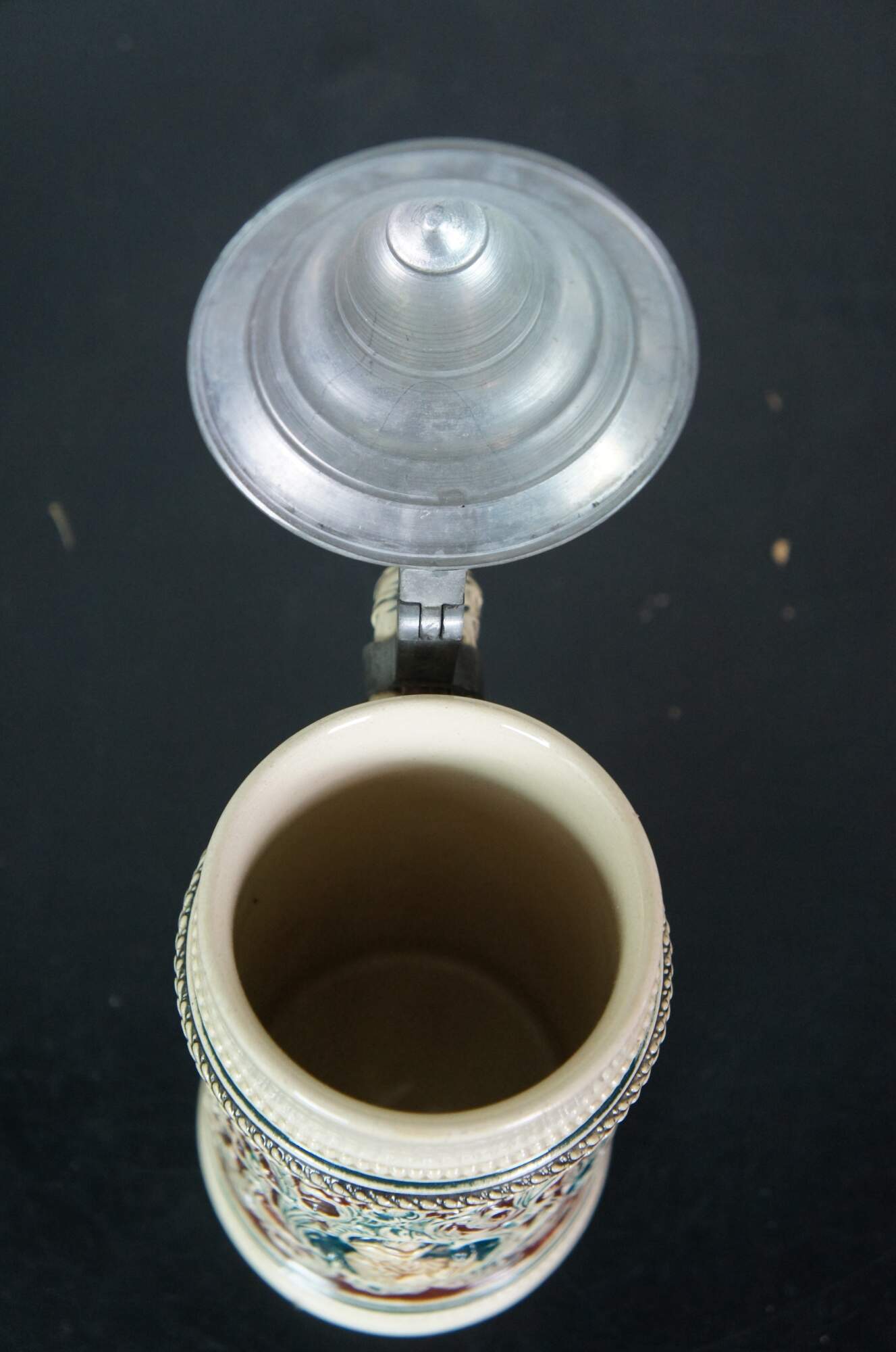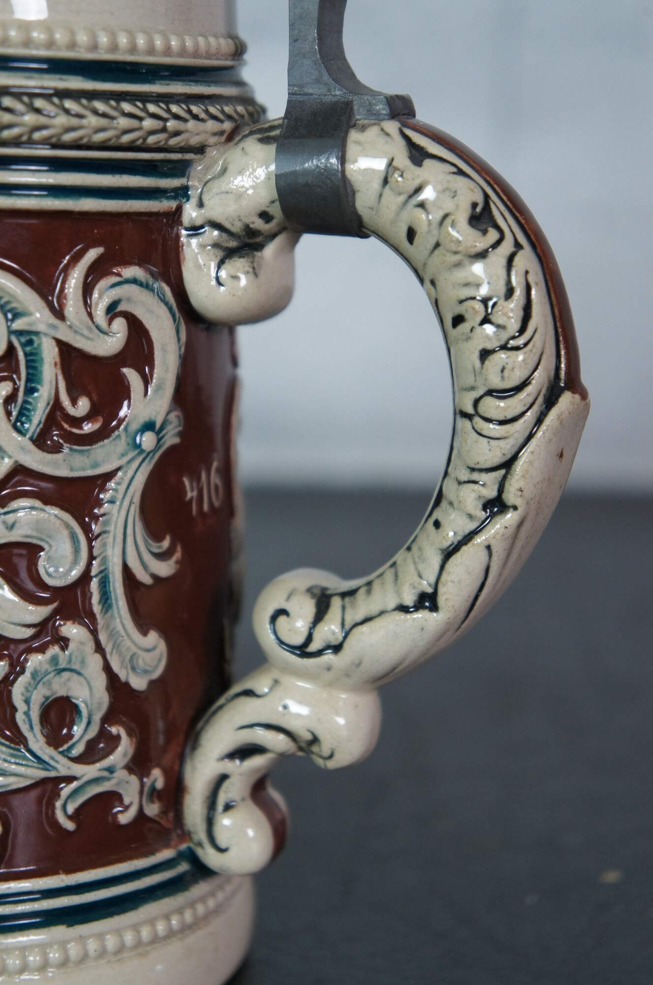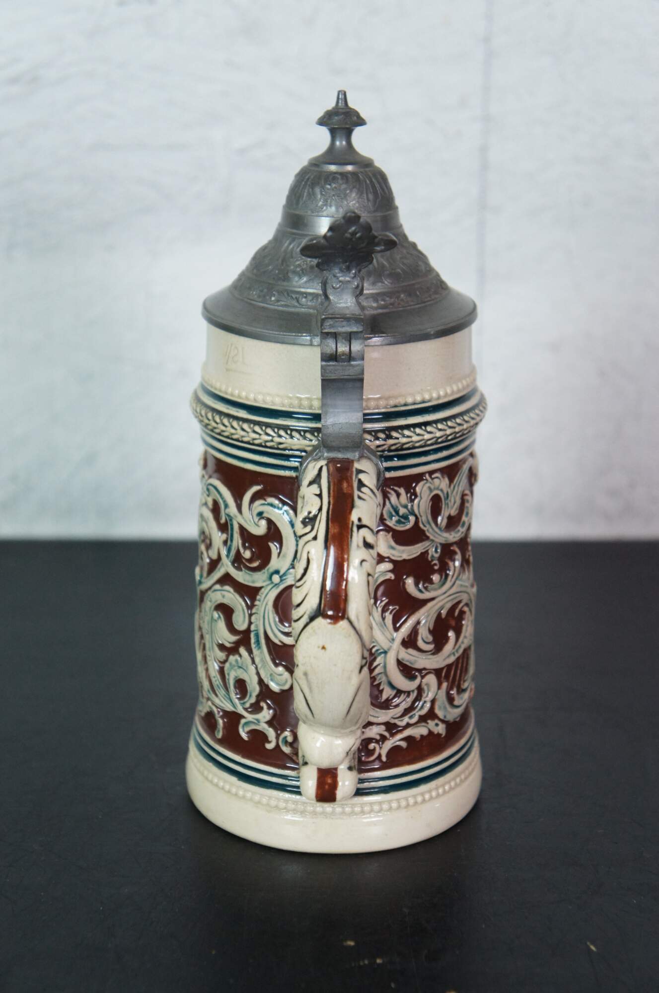 Early to mid 20th century German beer stein / tankard - cream colored stoneware glazed in red and green, featuring a scrolling foliate and floral design with winged cherubs flanking the portrait of an 18th century Colonial gentleman in a tricorn hat. Stamped tin flip top lid. Marked 416 on side and base.